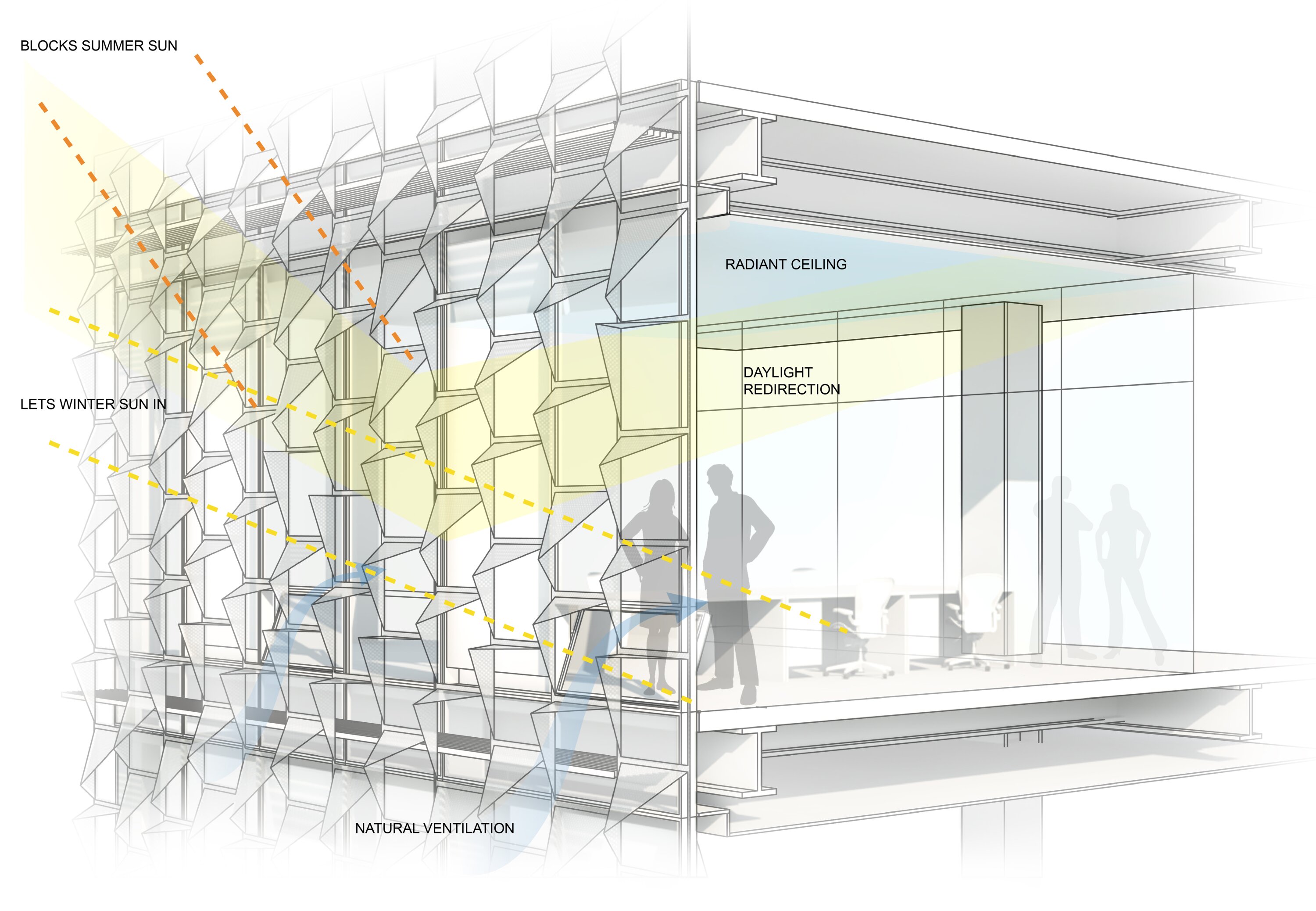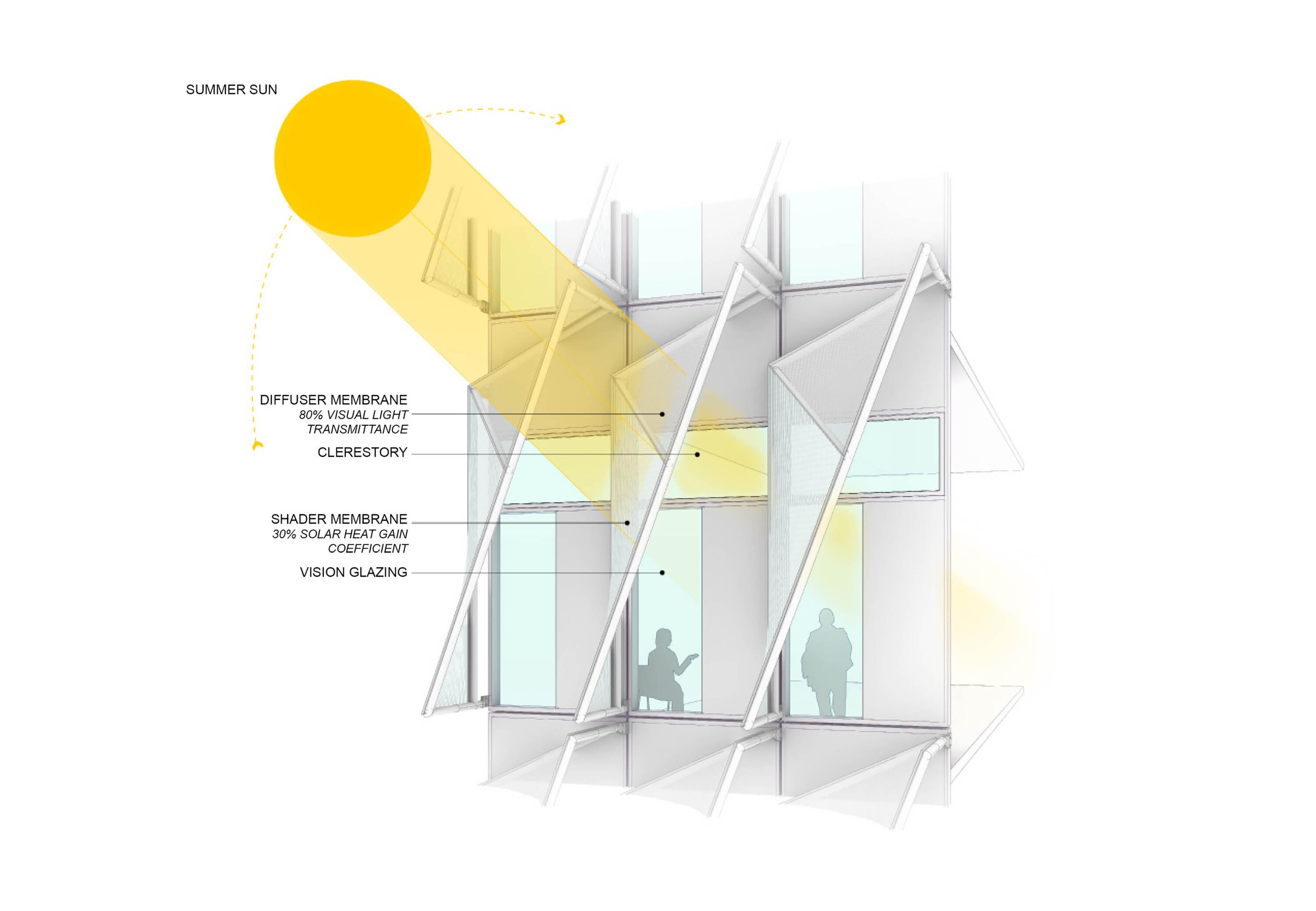 Creating a fixed sun shading system that balances technical and experiential goals to enhance energy performance and comfort of the building.