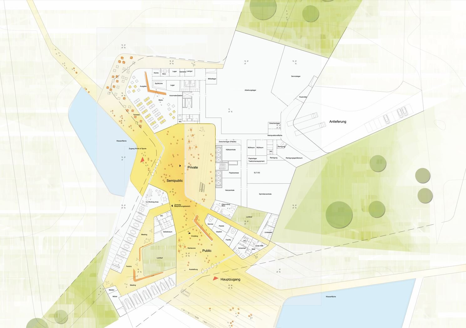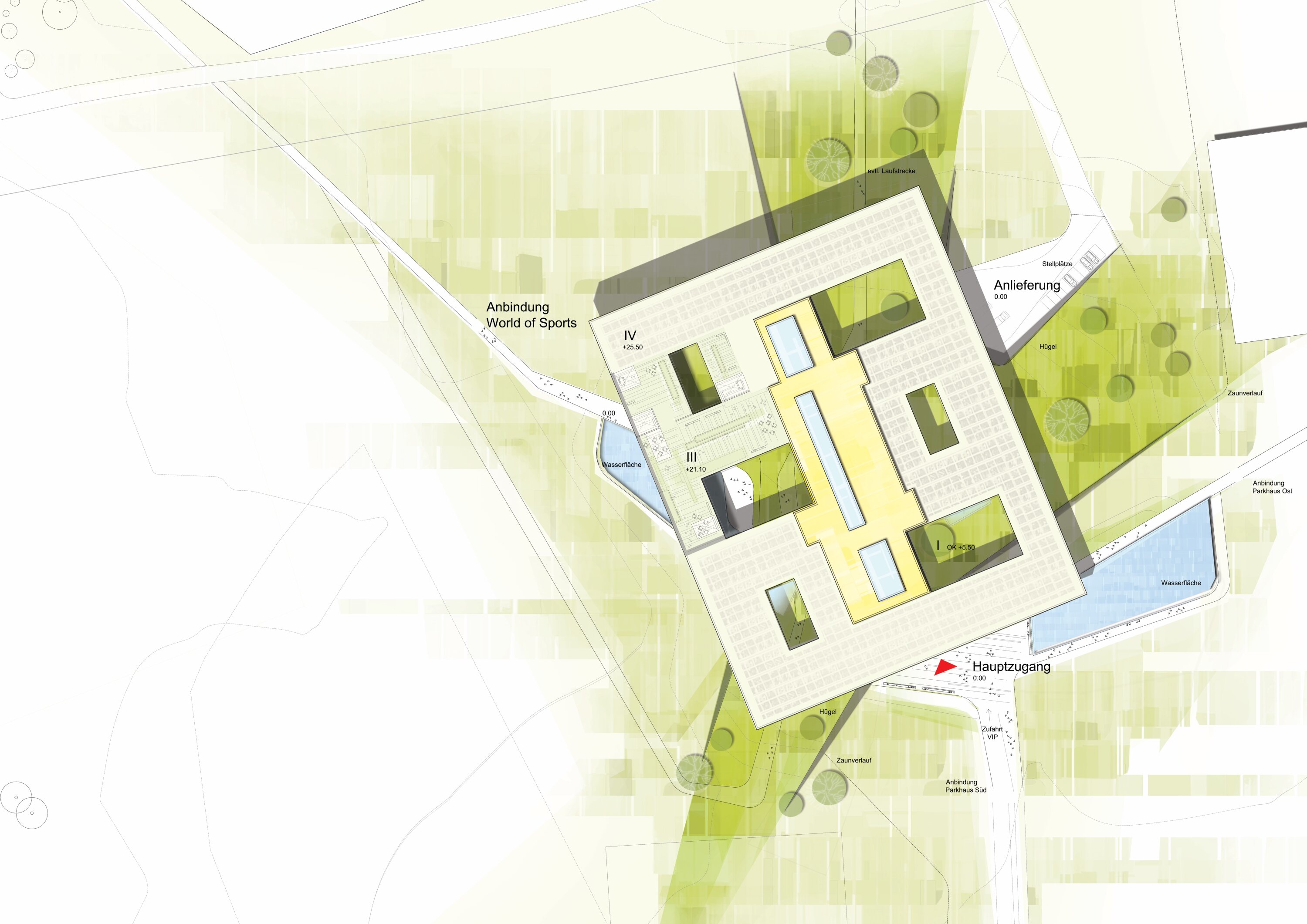 As part of the evolving campus masterplan, the four-story building serves as the main gateway and identity-forming element of the southern campus. Its design expresses openness and visibility while representing the brand beyond the site boundaries. The concept is based on a flexible, organism-like structure that supports evolving work patterns and encourages communication. Traditional office layouts are replaced by adaptable, modular workspaces organized within a clear structural grid.