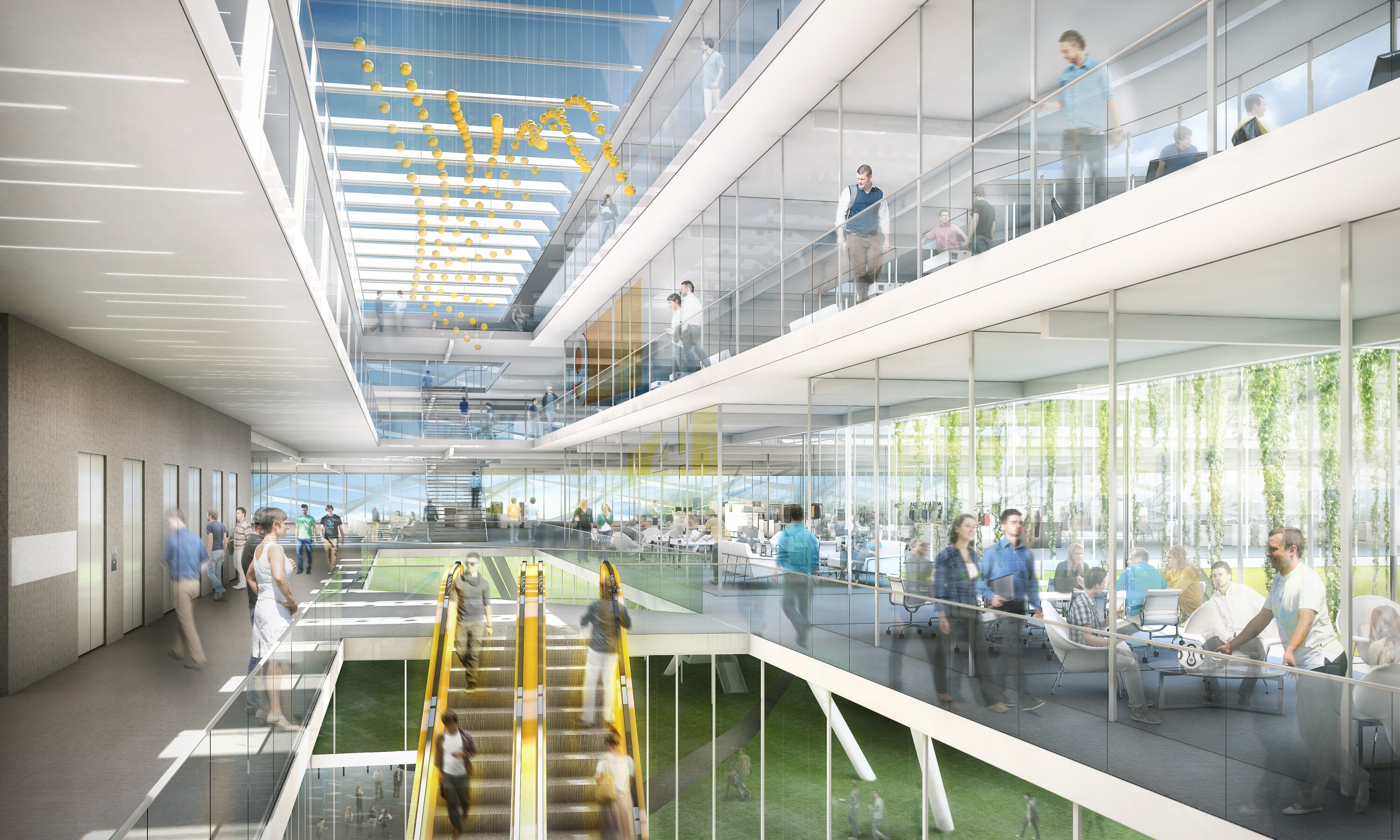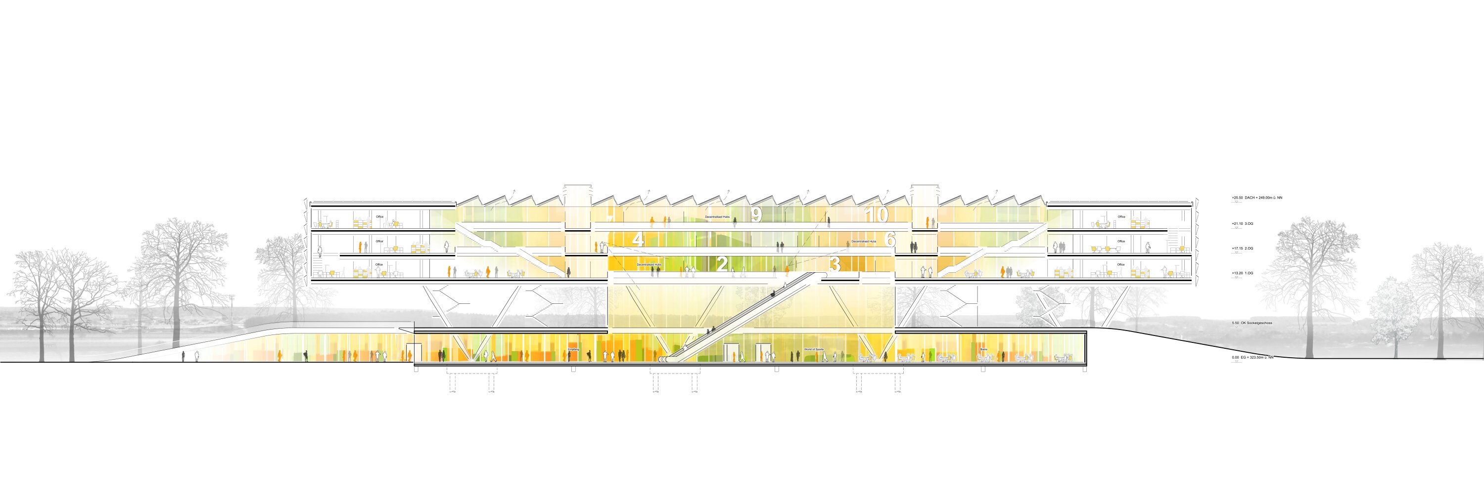 At ground level, a landscaped, open environment connects interior and exterior, guiding visitors into the campus. Above, three floating office levels are arranged around daylight-optimized courtyards, ensuring high spatial quality and natural light. A central atrium connects all floors visually and spatially, while decentralized hubs on each level act as key meeting points for collaboration and exchange. Open staircases and galleries link the spaces vertically and horizontally, creating a dynamic and interconnected workplace.