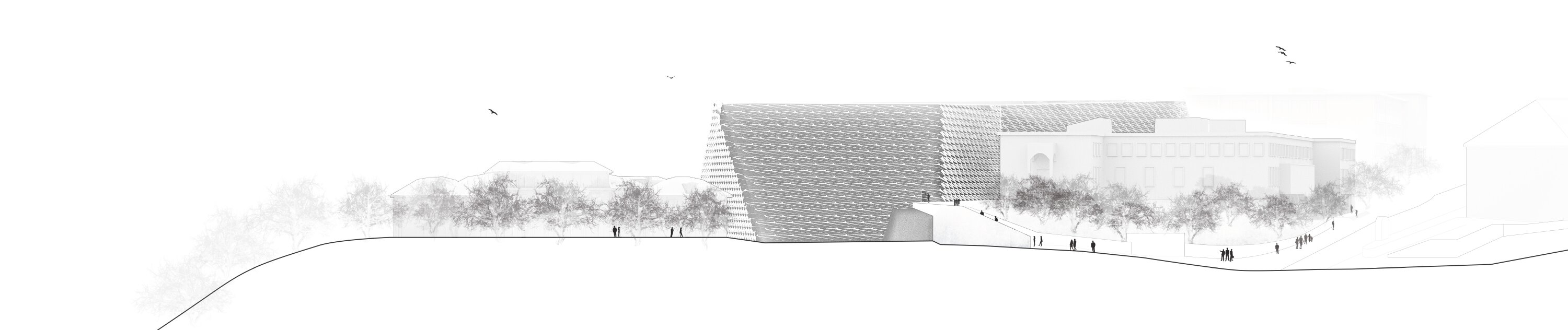 The site is characterized by loosely arranged buildings of varying scale and style, as well as a steep, tree-covered slope that limits development. The required building volume is substantial, making integration challenging. The design therefore prioritizes orientation toward the landscape and views, while minimizing negative impacts on neighboring structures and maintaining daylight access to surrounding spaces. Rather than adopting existing forms, the building develops an independent geometry shaped by internal functional relationships and site conditions. Its configuration allows for a clear spatial identity while remaining responsive to the context.