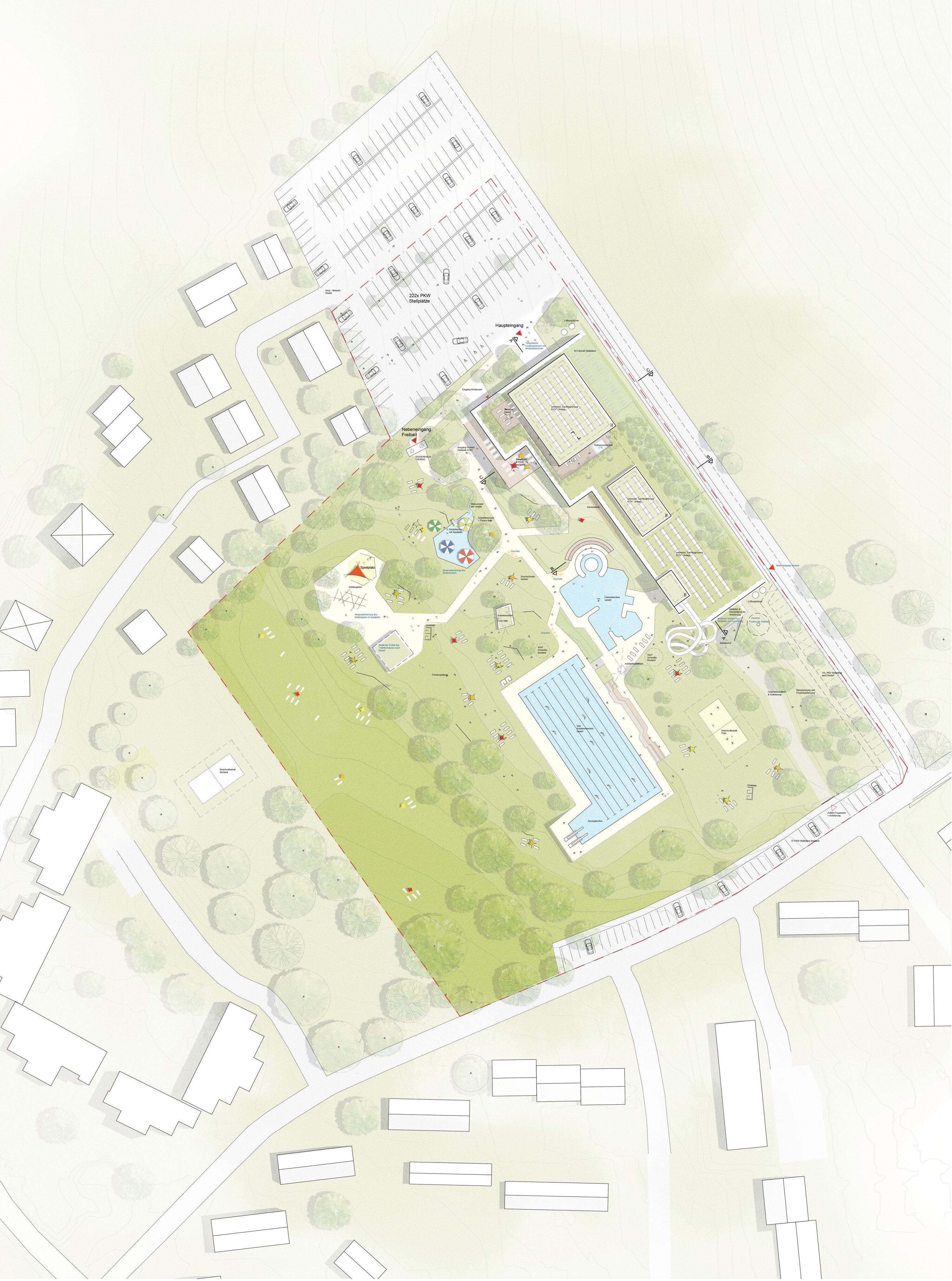 The proposal replaces the existing indoor pool with a new terraced building while largely preserving the outdoor pool landscape. The architecture is embedded in the sloping site and organized as a sequence of accessible levels that open views toward the old town and Fortress Rosenberg while maintaining a low and landscape like presence. A clear circulation concept structures the building with a central entrance hall that connects indoor pools outdoor pools sauna and gastronomy in a logical and easily readable way. The pool hall is conceived as a differentiated spatial landscape with distinct zones for sport learning leisure and relaxation unified by daylight views and acoustic clarity.