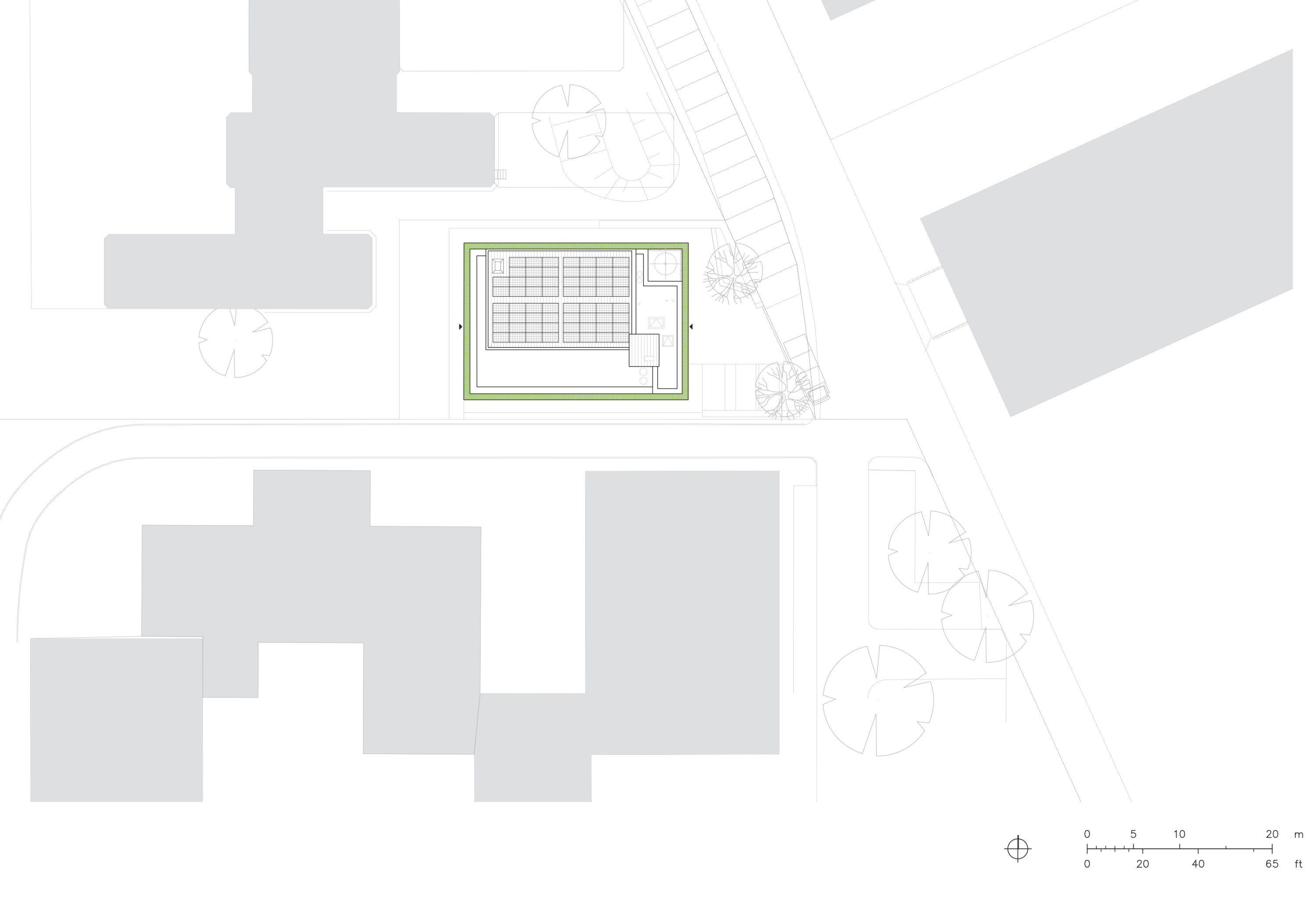 The only openings in the upper stories are those required for functional purposes: access points for storage containers, vents for supply and exhaust air, windows in the stairwell, and emergency exits with ladders. The facade system enables vertical greening with a network of climbing supports and a trellis that extends to the top of the building. This support structure is designed to guide evergreen climbing plants chosen specifically for their suitability to the varying growing conditions on each side of the building. The nitrogen is stored in an external tank nestled between the building envelope and the green facade.