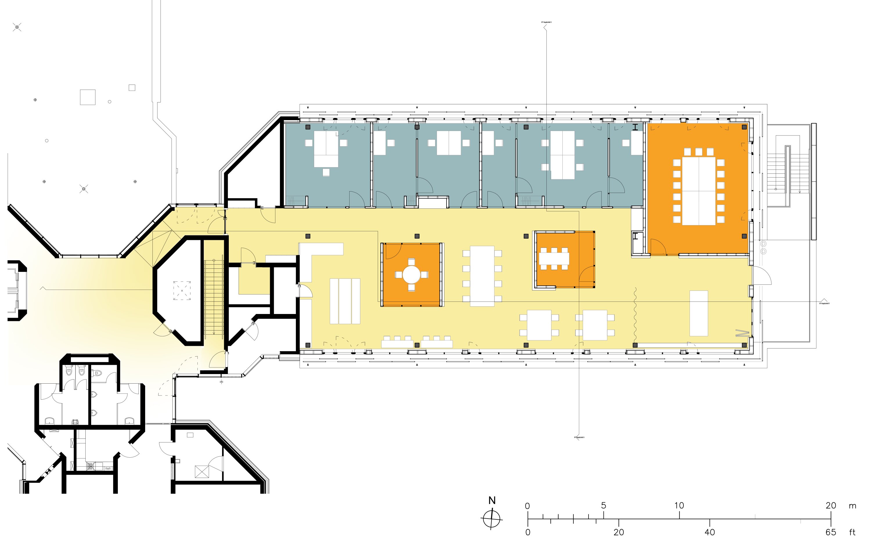 The extension offers new offices for the business faculty as well as open space and creative areas for all students. The Münster UAS has around 592 square meters more space available at this location. Visually, the new fifth floor is set apart by a striking façade with fixed solar shading made of expanded metal, which reduces solar heat gain in summer.