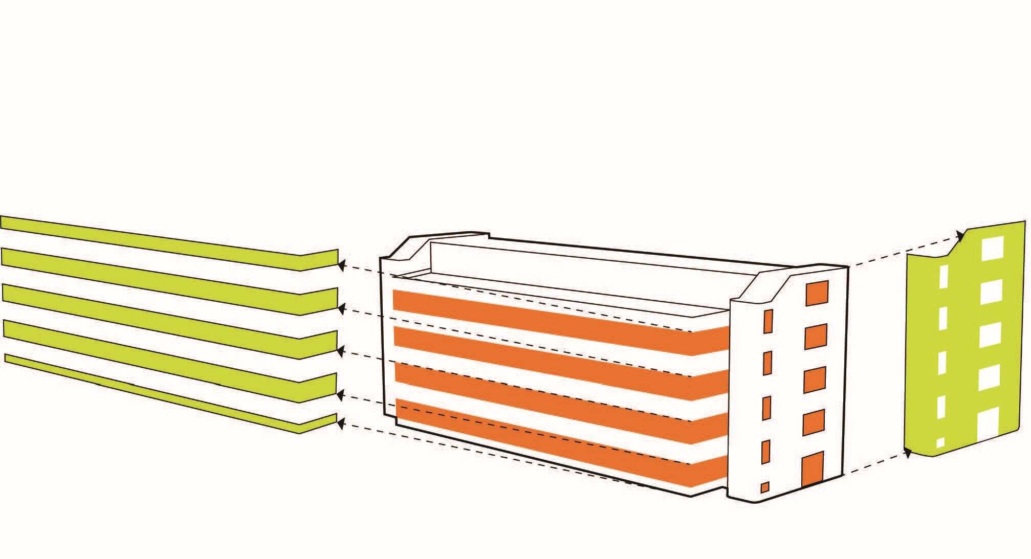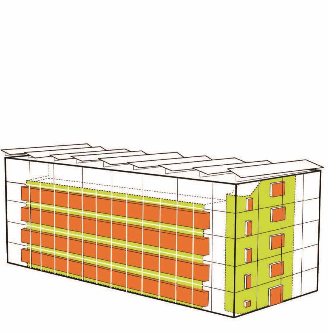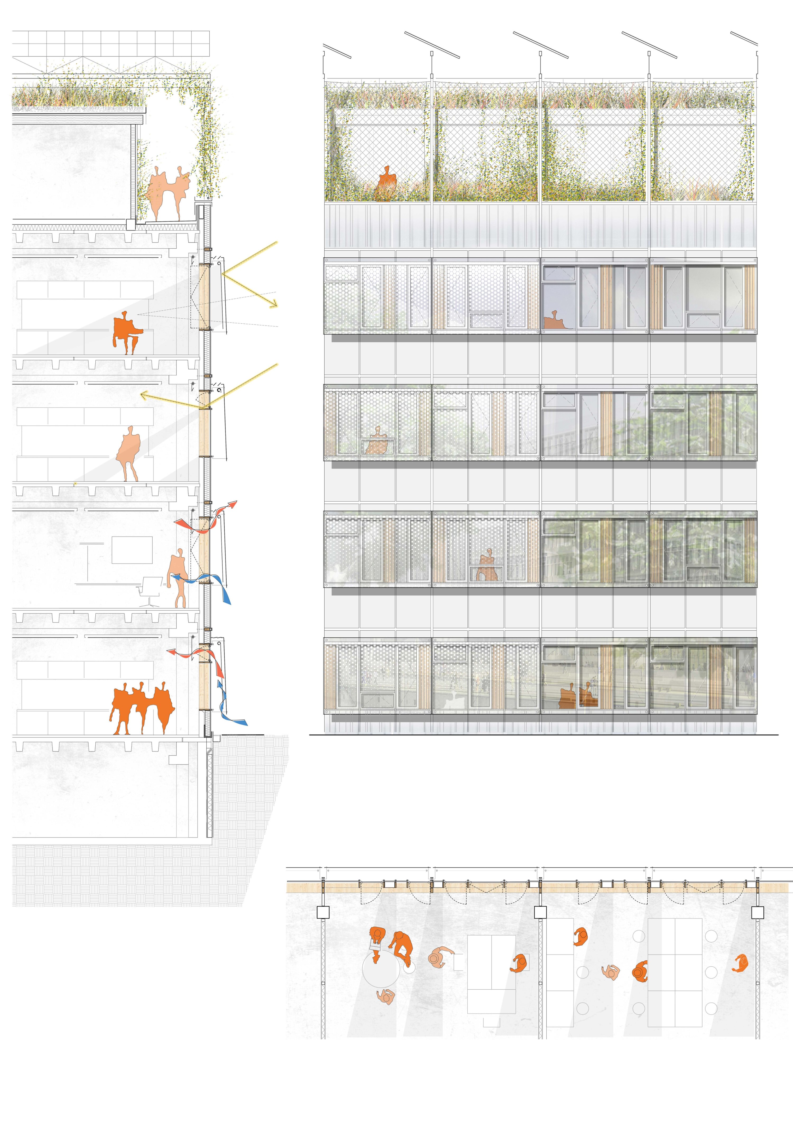 A modular facade system enhances energy performance and adaptability. A prefabricated post-and-beam structure integrates new window bands, external shading, and a layered “climate facade” that improves thermal comfort through passive strategies such as natural ventilation and solar control. The intervention reduces heated volume by relocating staircases the thermal envelope and activating existing thermal mass. Green facades, balconies, and rooftop terraces extend usable space while improving microclimate and user comfort.