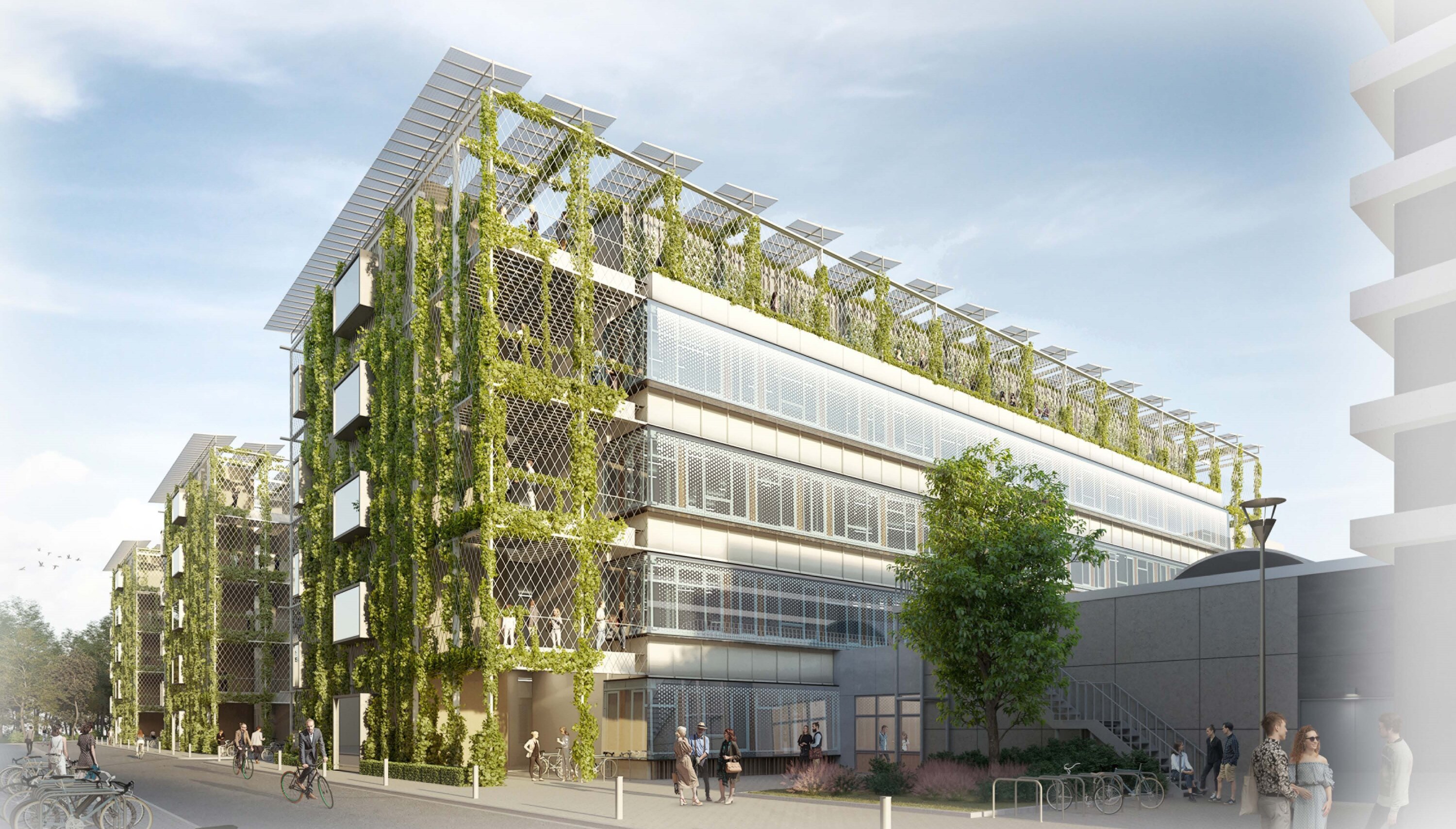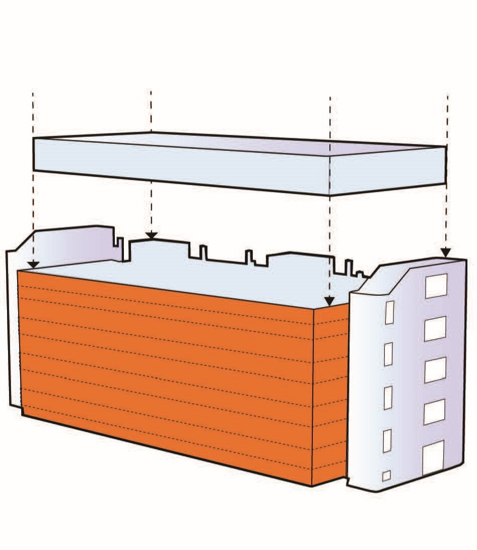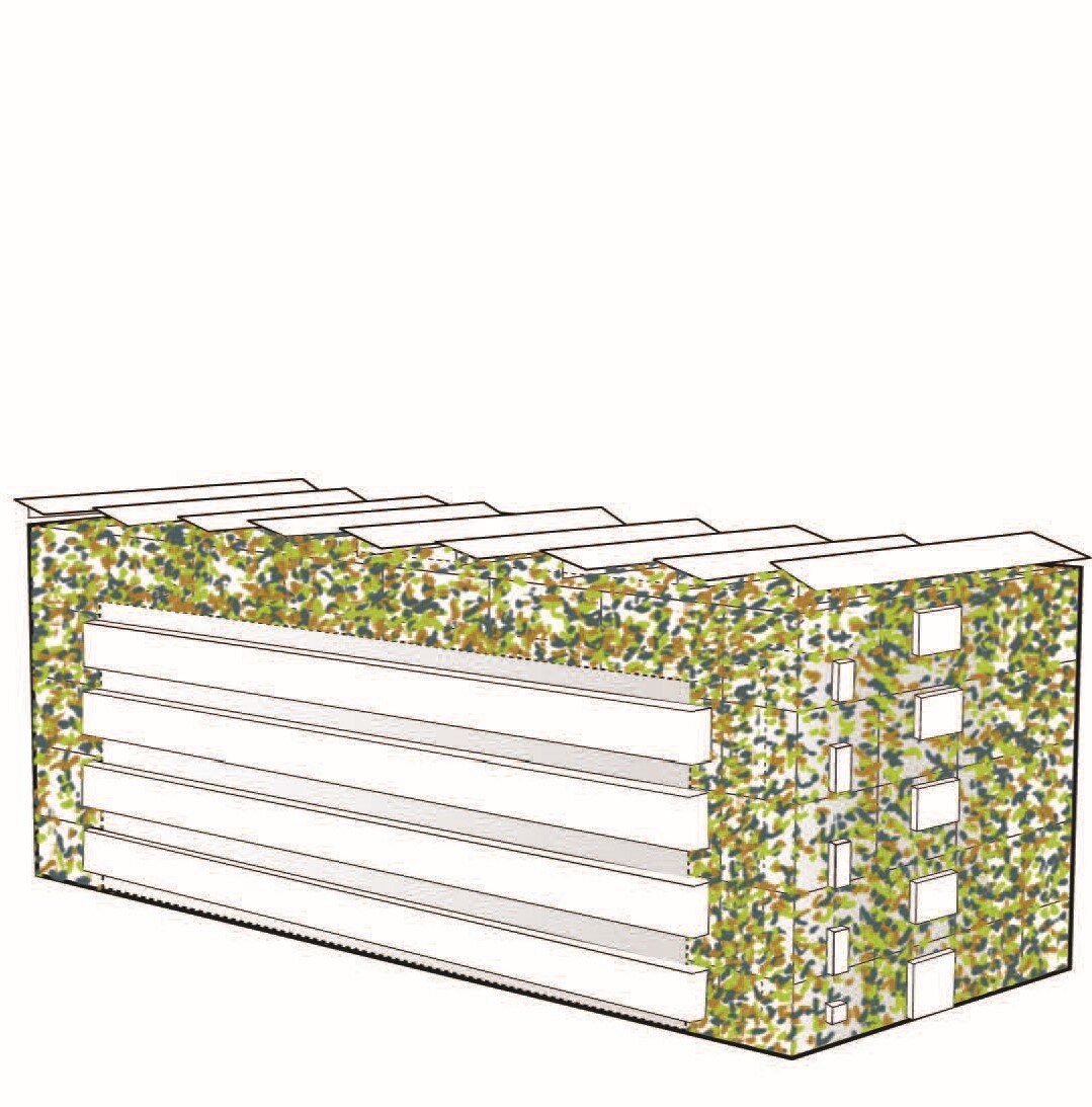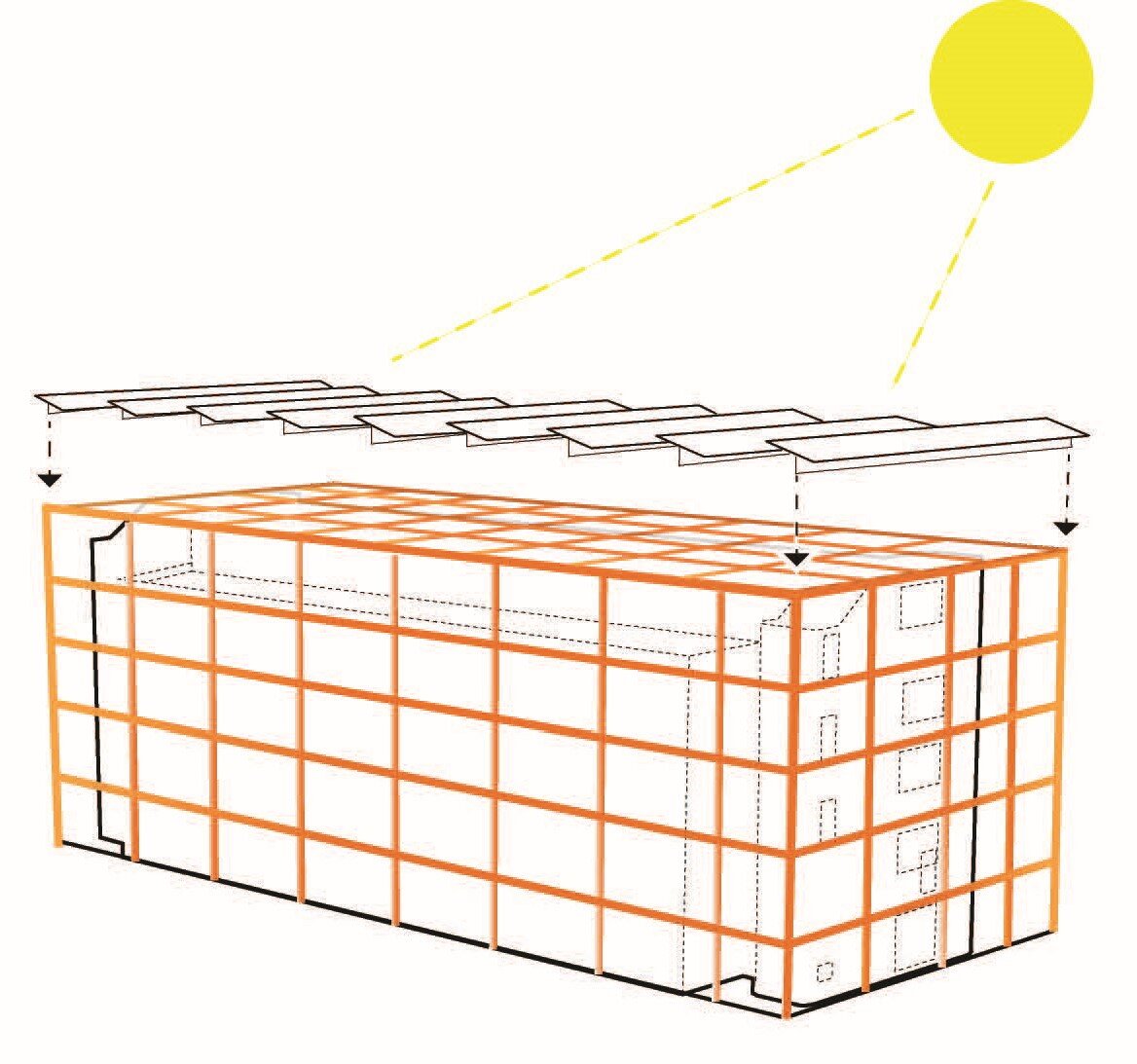 A modular facade system enhances energy performance and adaptability. A prefabricated post-and-beam structure integrates new window bands, external shading, and a layered “climate facade” that improves thermal comfort through passive strategies such as natural ventilation and solar control. The intervention reduces heated volume by relocating staircases the thermal envelope and activating existing thermal mass. Green facades, balconies, and rooftop terraces extend usable space while improving microclimate and user comfort.