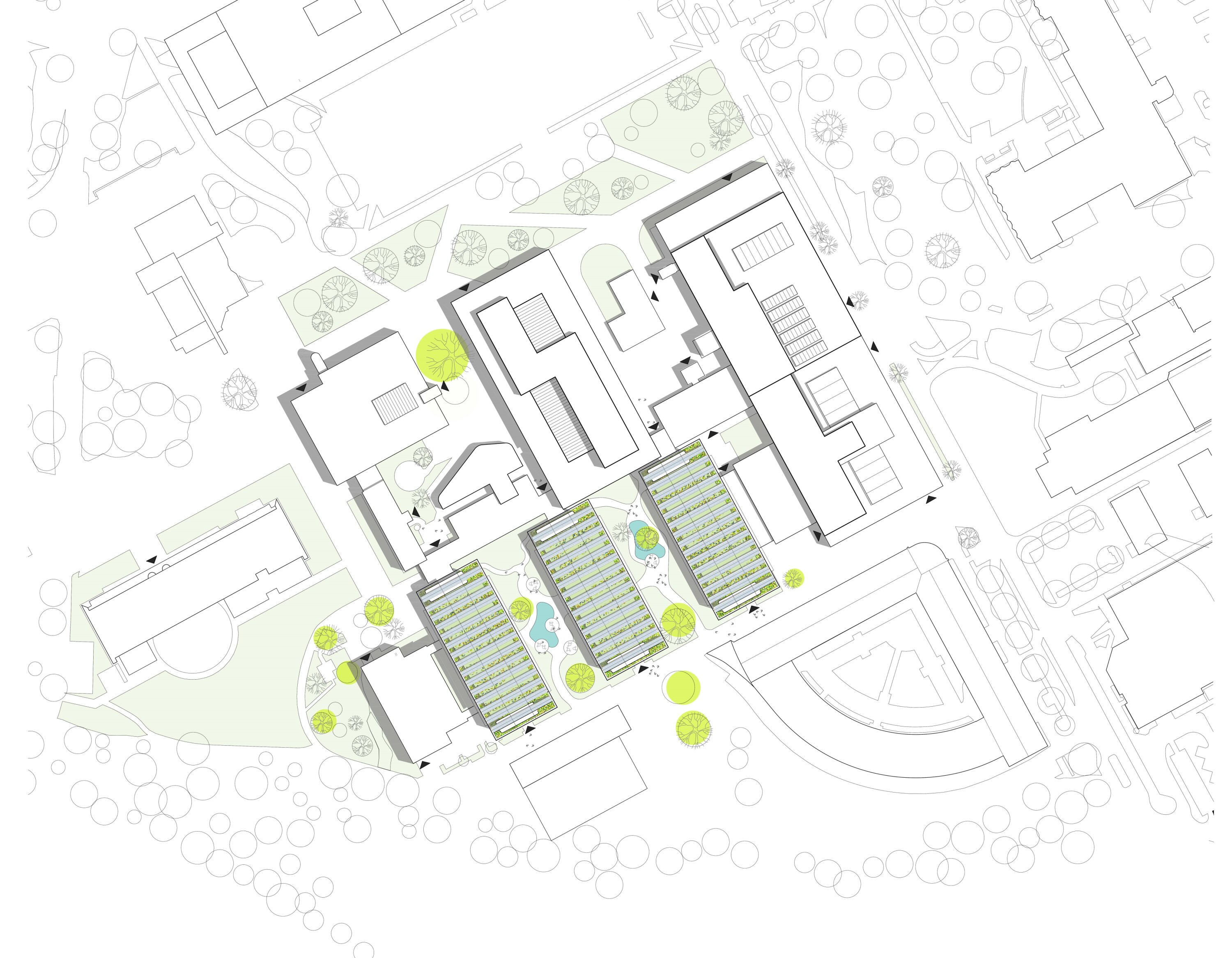 The upgraded ensemble gains a clear architectural identity and integrates harmoniously into the campus. Flexible layouts based on a regular grid allow for various uses, while prefabrication ensures efficient construction with minimal disruption. Passive energy strategies, combined with photovoltaics and optimized daylighting, significantly reduce energy demand and operational costs. The result is a resource-efficient, adaptable, and high-quality research environment with long-term sustainability.