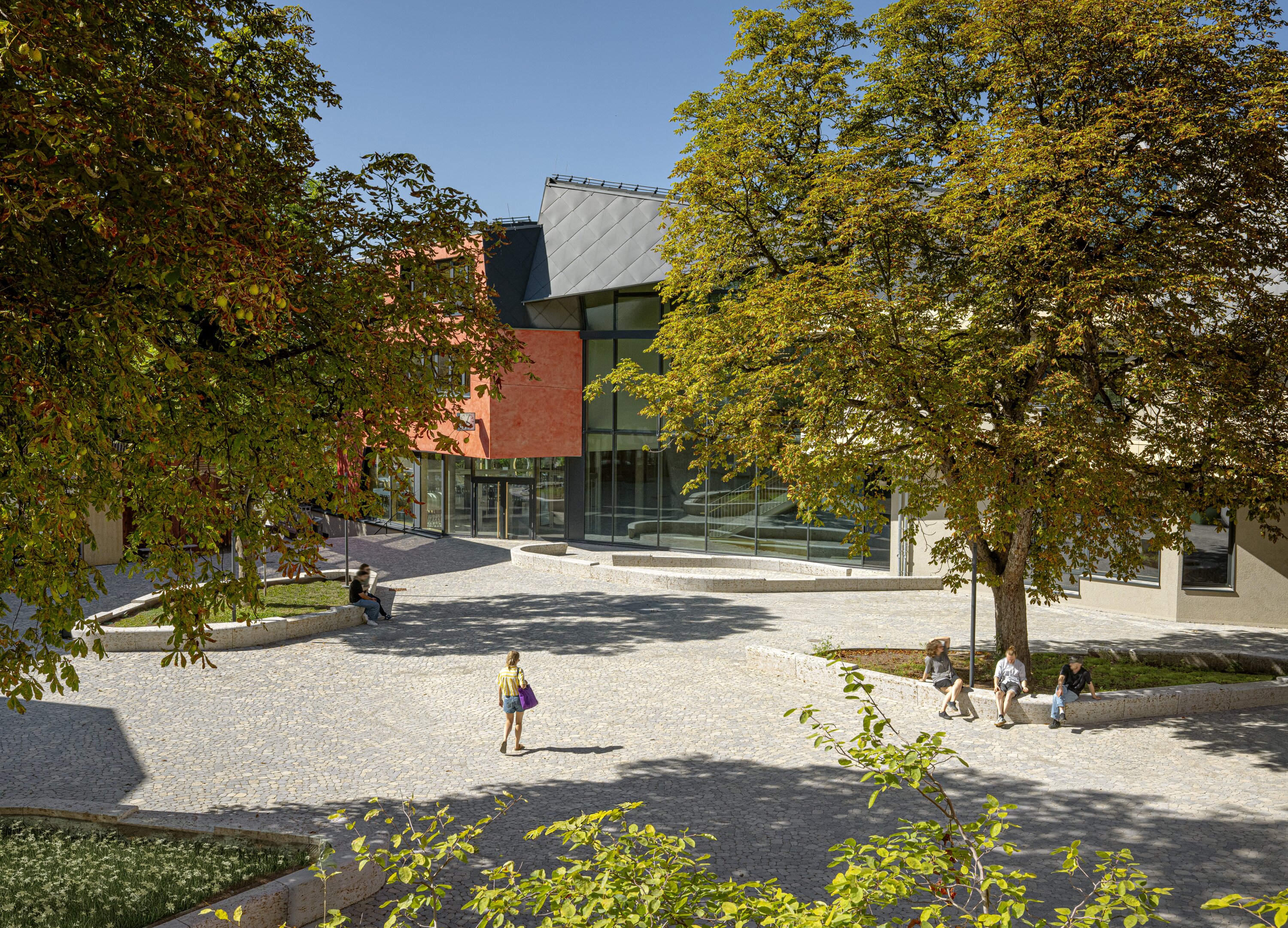 The distinctive black roof—composed of four folded, polygonal segments—echoes the varied roofscape of the campus, including a brutalist performance hall. Its form and the mansard geometry are shaped by local building codes, while its black surface results from integrated solar panels that seamlessly blend into black sheet metal. The red color of the northwestern part nods to the prevailing color scheme of the buildings on campus and enhances visibility from afar.