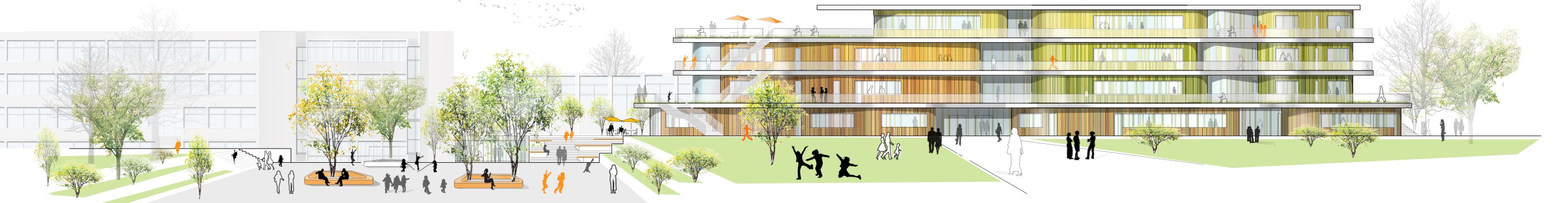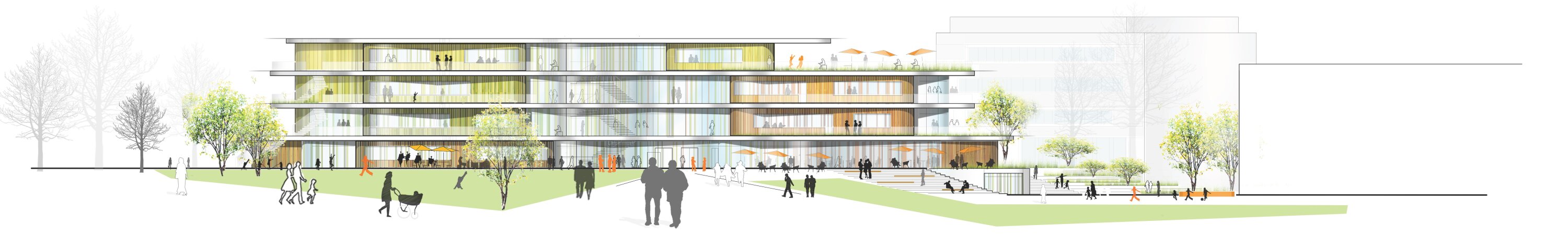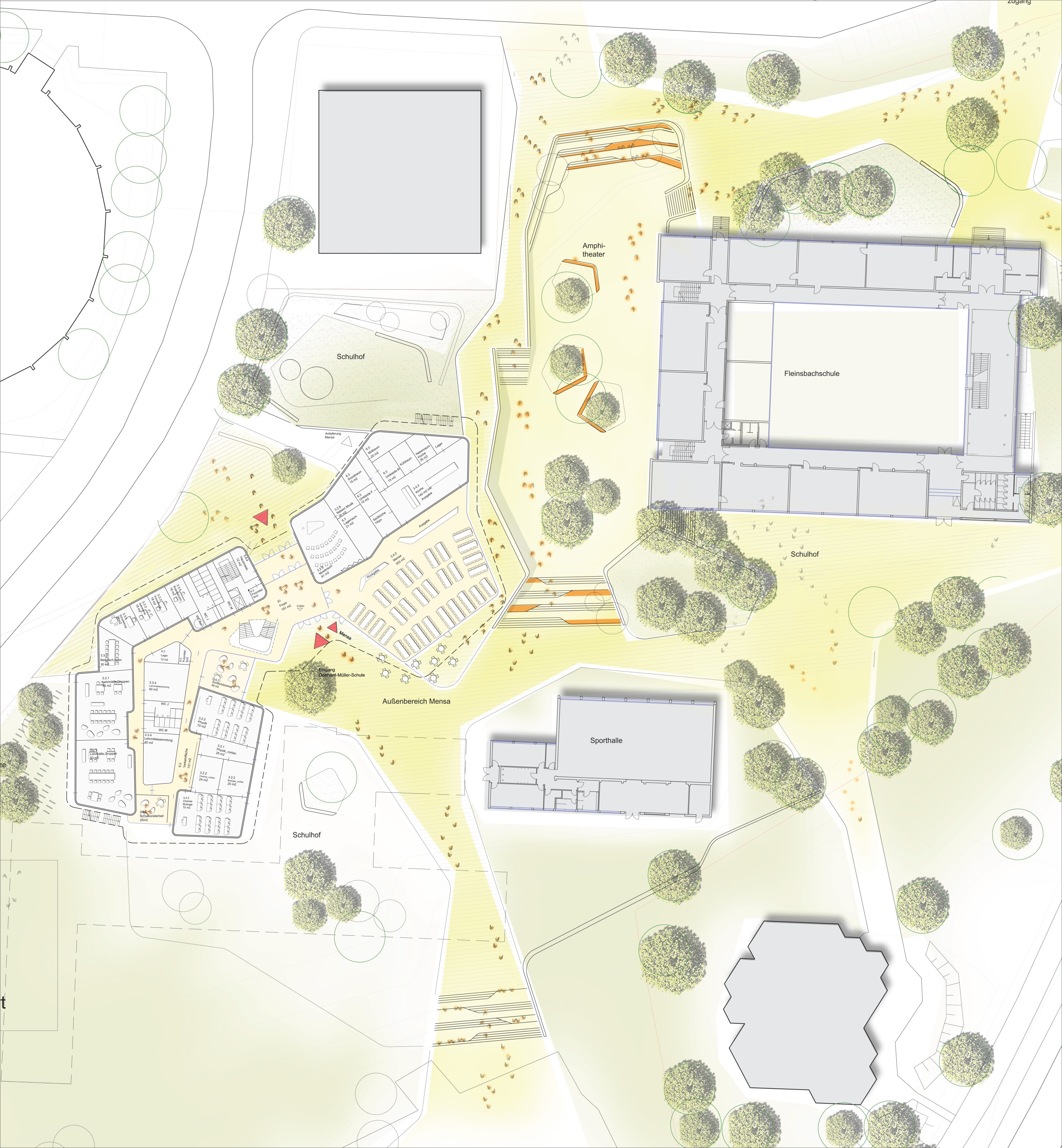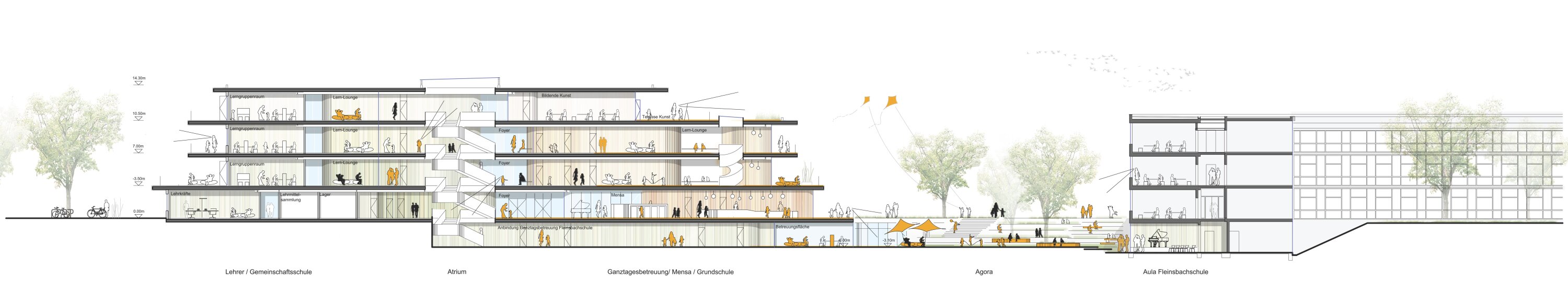 Upper levels are organized into distinct learning clusters for primary and secondary education, structured around a central atrium that acts as a vertical marketplace and orientation space. Circulation areas are conceived as extended learning environments, supporting contemporary, flexible teaching methods. Outdoor terraces and direct connections to the schoolyard enhance spatial quality and allow learning to extend beyond the classroom. Additional facilities for the Fleinsbachschule are integrated into the landscape.