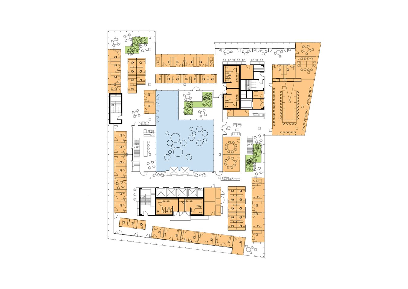 The Genzyme Center is located in the midst of other dynamic research institutions on a former brownfield site close to the Charles River in Cambridge. The design brief called for a forward-looking building that would serve as a distinctive point of identity for the Genzyme Corporation, its employees, guests, and visitors. From the initial architectural competition through a highly integrated design process, the primary objective was to develop the building from the inside out. It accommodates about 920 individual workplaces over 12 floors.