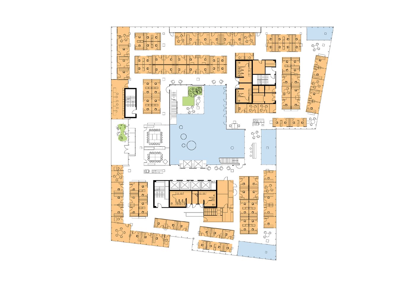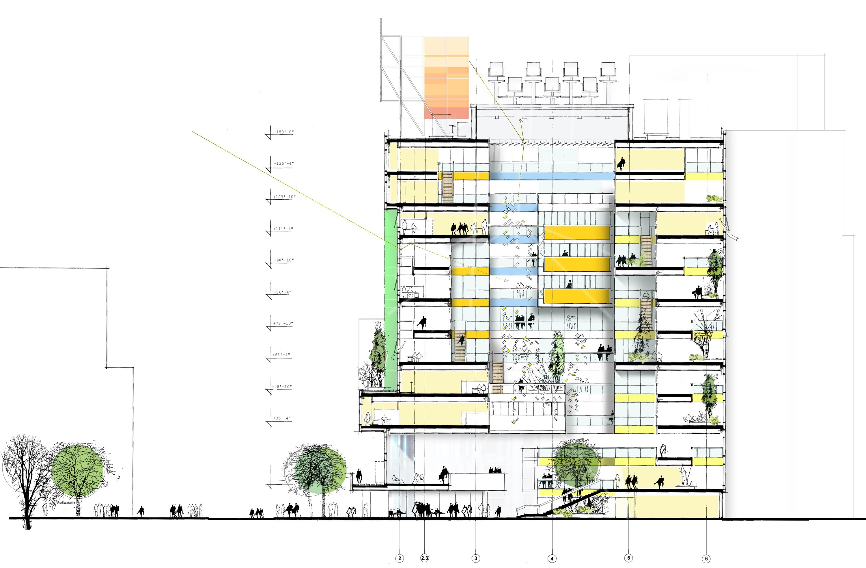 Organized as a vertical city with individual dwellings, public areas and indoor gardens extend up the full height of the central atrium, a space serving as a large return air duct and light shaft. Open stairs form part of a vertical boulevard, which starts at the ground floor lobby before proceeding upwards through various neighborhoods with open workstations and separate offices.