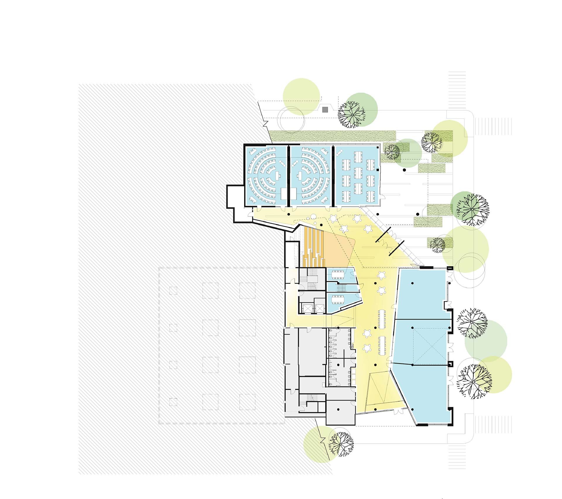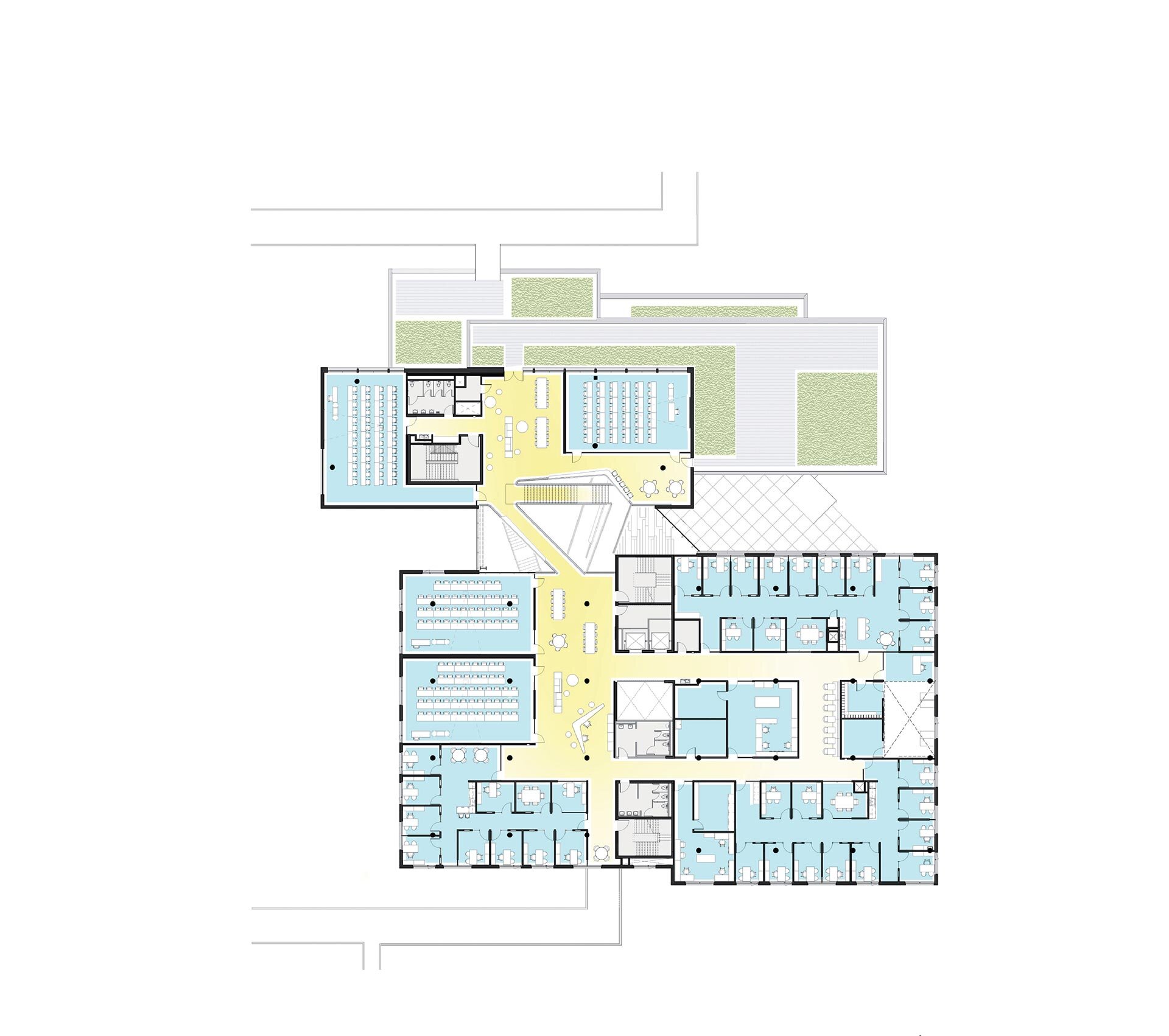 Centered around a five-story glass atrium animated with activities, the School of Business benefits from a diverse program. A wide range of spaces—informal meeting and study areas, gardens, classrooms, business incubators, student spaces, faculty and administrative offices, and retail—are strategically arranged to maximize communication and connectivity, promoting an inclusive approach to learning. Flexible, student-focused informal learning spaces are evenly distributed throughout the building, acting as social anchor points that transform a transitional corridor into a pedestrian-friendly space for students and the greater University community.