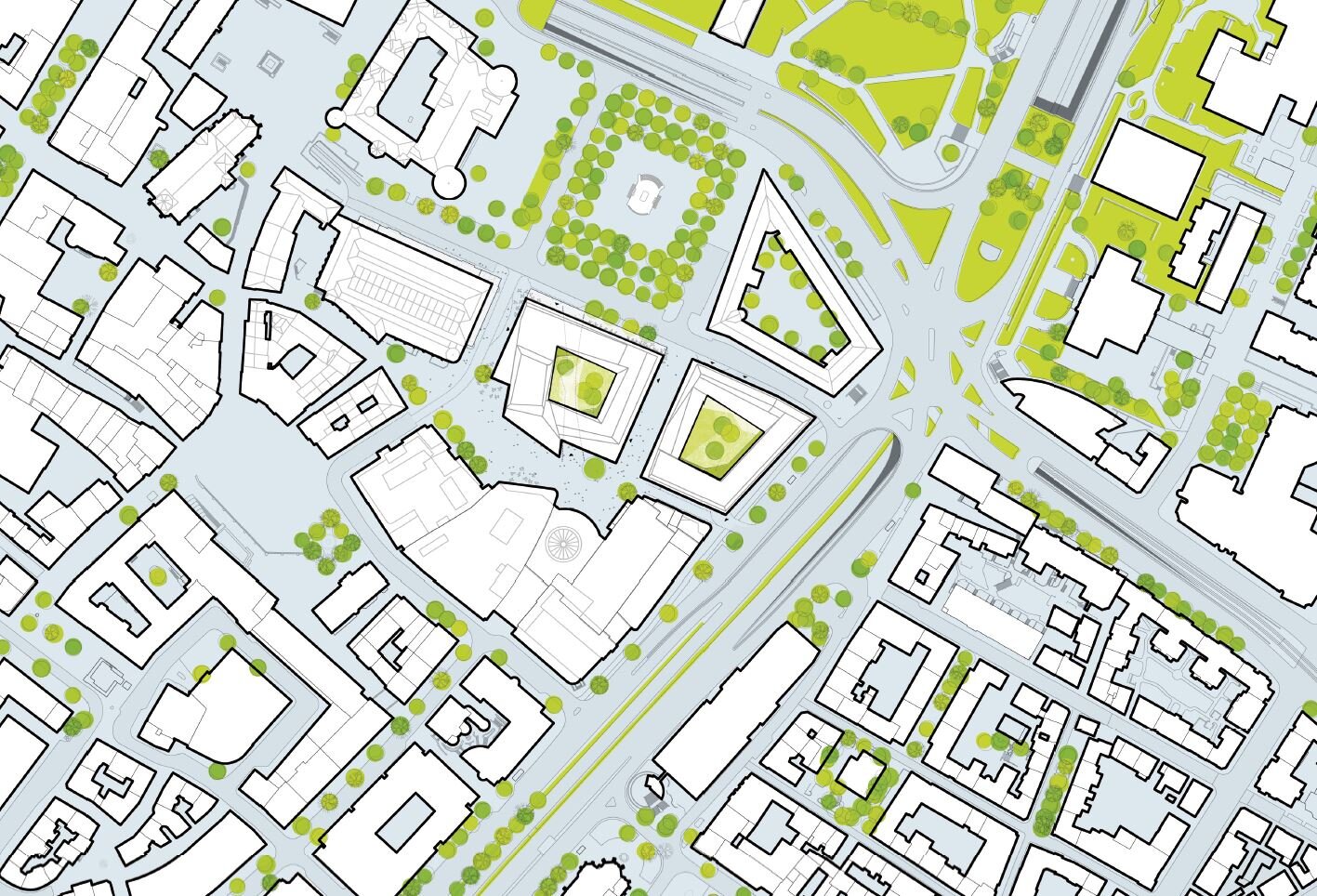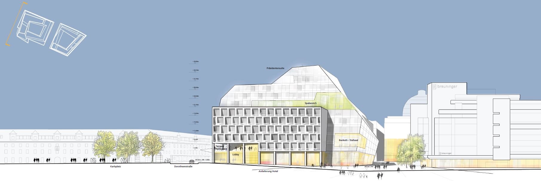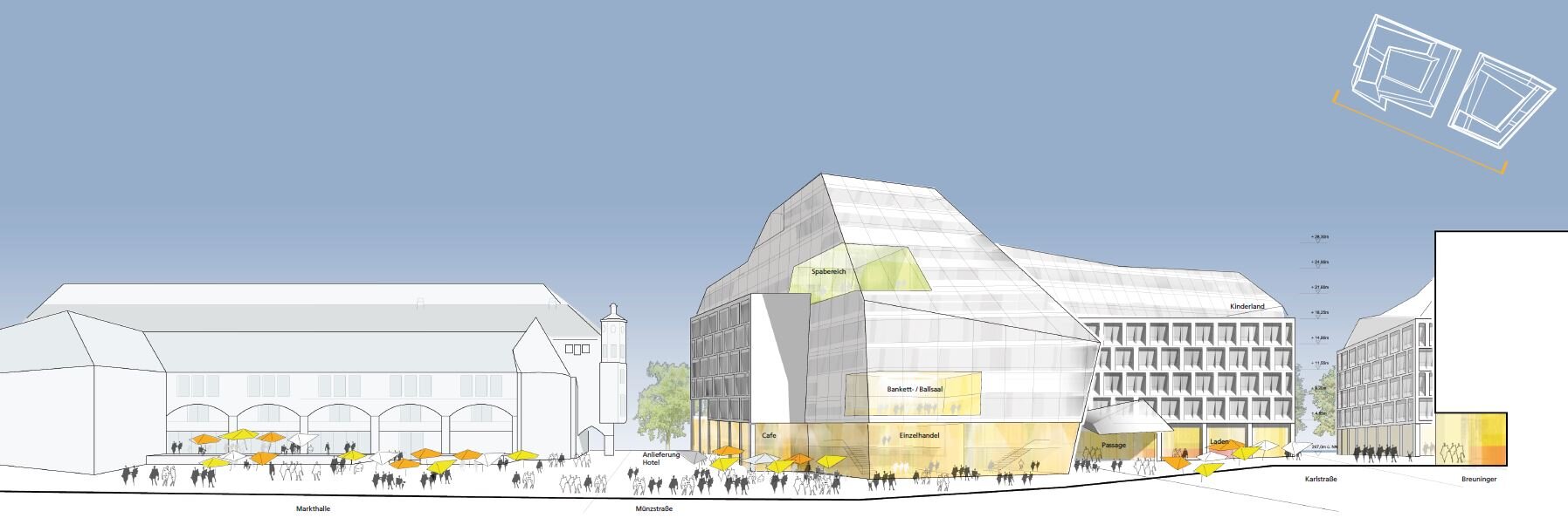 The redevelopment of the Karlsplatz quarter creates new urban qualities by transforming previously neglected back areas into active and well-connected public spaces. A key objective is to link surrounding destinations such as the market hall, Breuninger department store, and pedestrian zones through an open, inviting ground floor that encourages movement and interaction.