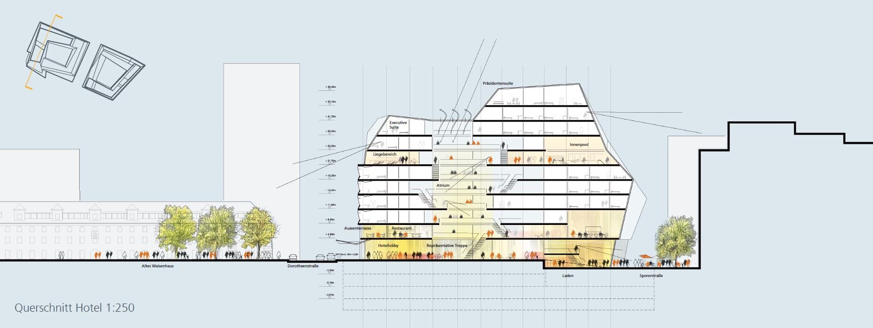 The reorganization of Sporerstraße plays a central role, establishing new visual and spatial connections that integrate the area into the broader urban network. The design follows the existing building lines of historic structures while creating a cohesive ensemble of contemporary architecture without “back sides,” ensuring consistently high spatial quality. The new buildings integrate naturally into the historic context while introducing a modern architectural identity through materiality and form. The roofscape is treated as a “fifth façade,” highly visible within Stuttgart’s topography. The hotel forms the tallest element of the ensemble, yet remains subordinate to the city’s historic towers. Its distinctive, uncluttered roof gives the complex a strong visual identity.