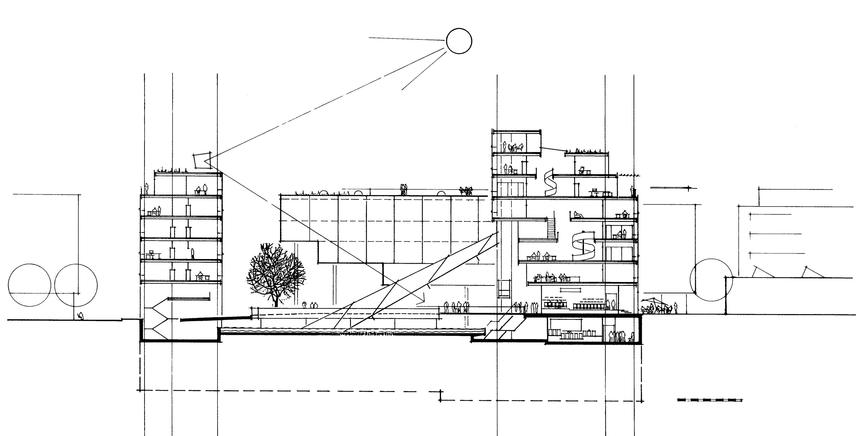 The classical perimeter block reinforces the street pattern while protecting a central courtyard from noise. Open to the public and set one level below the ground floor, the courtyard features a large expanse of water and a sloping glass roof that encloses the main entrance hall. The hall extends over four floors and also hosts exhibitions and events. The water extends into the hall—blurring the boundary between interior and exterior—and introducing reflected sunlight into unexpected areas. Rooftop heliostats intensify daylight and amplify reflections that lead to an interplay of light, color, and water—creating a new and uniquely animated urban space.