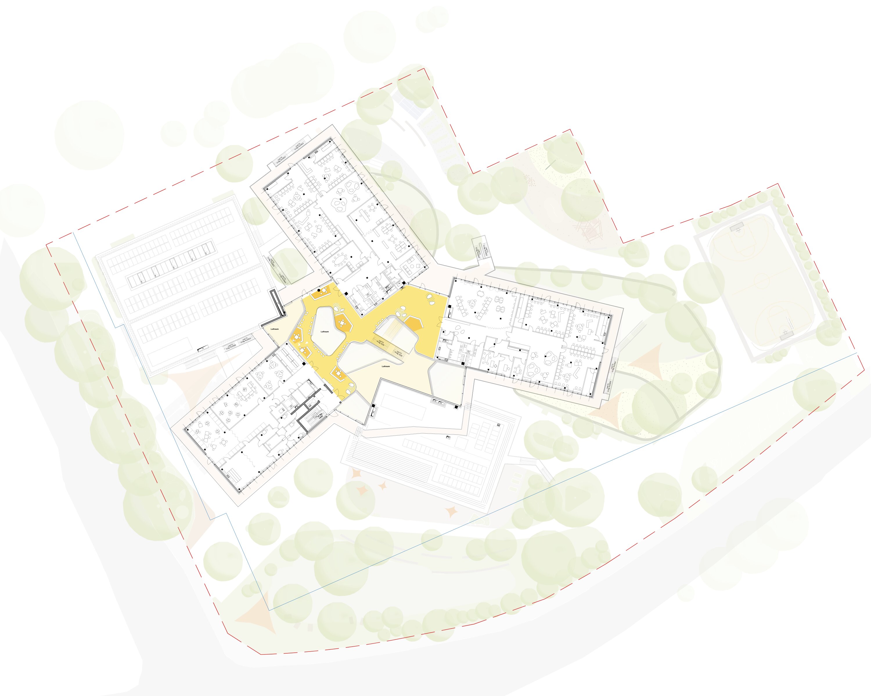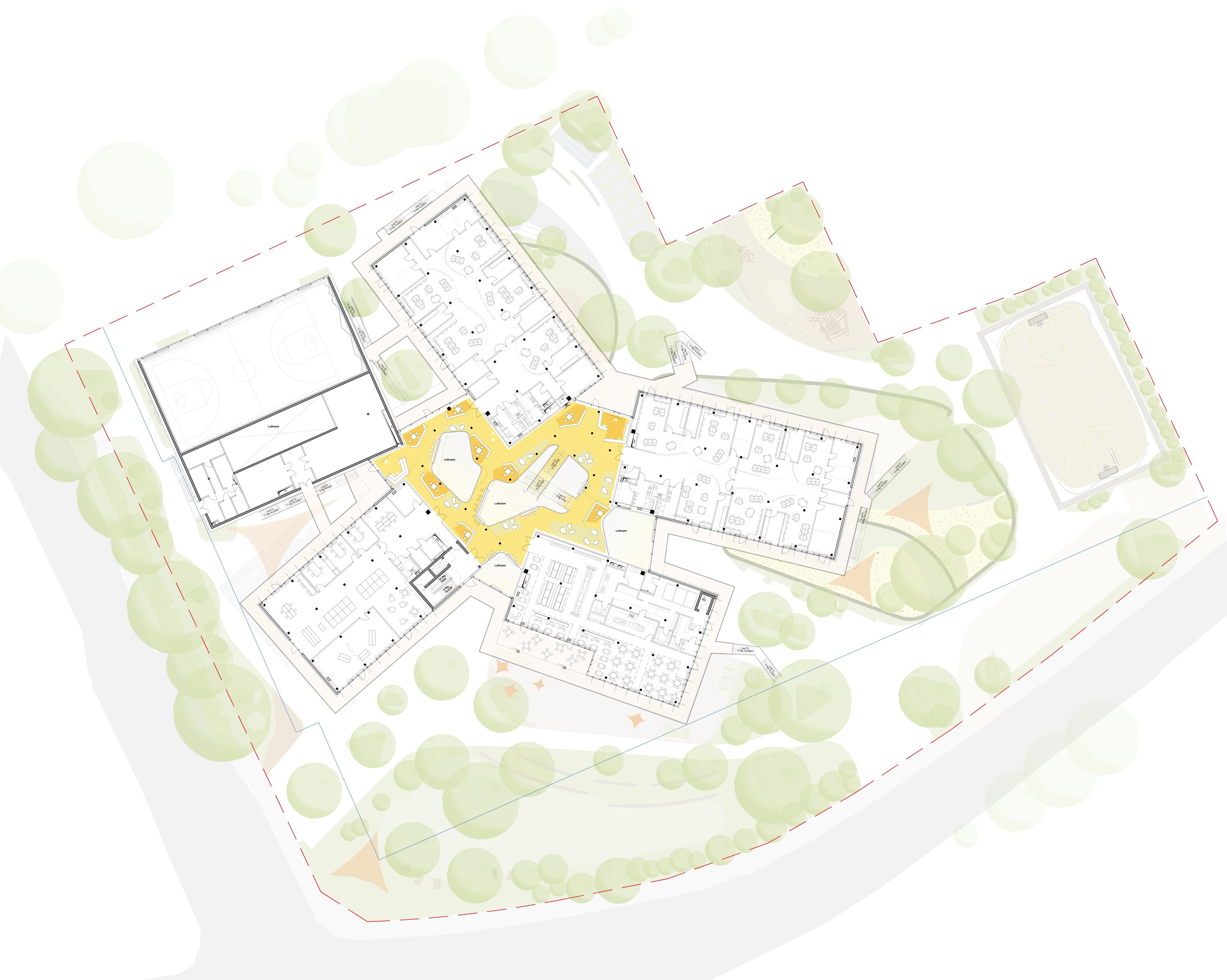The inviting building fosters activity, interaction, and discovery, offering ample space for experimentation and exploration. It combines diverse programs under one roof: a daycare center, school, workshops and creative labs, a digital learning center, health and fitness facilities, urban gardening areas, and a café. A variety of outdoor spaces with appealing amenities complements the scheme, seamlessly blending indoor and outdoor spaces.