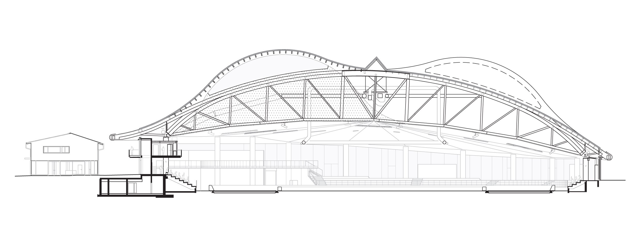 Unlike most ice speed skating stadiums, which typically require significant energy to cool the ice and heat the interior, the arena uses about 30% less energy than comparable facilities. This efficiency results from detailed digital analysis that shaped the stadium's design. The roof plays a critical role in optimizing the stadium's energy use. A “Low-E” membrane beneath the roof reflects the ice’s cold thermal radiation back onto the track, maintaining the necessary low temperature. Seventeen north-facing skylights allow ample diffuse, glare-free daylight into the space.