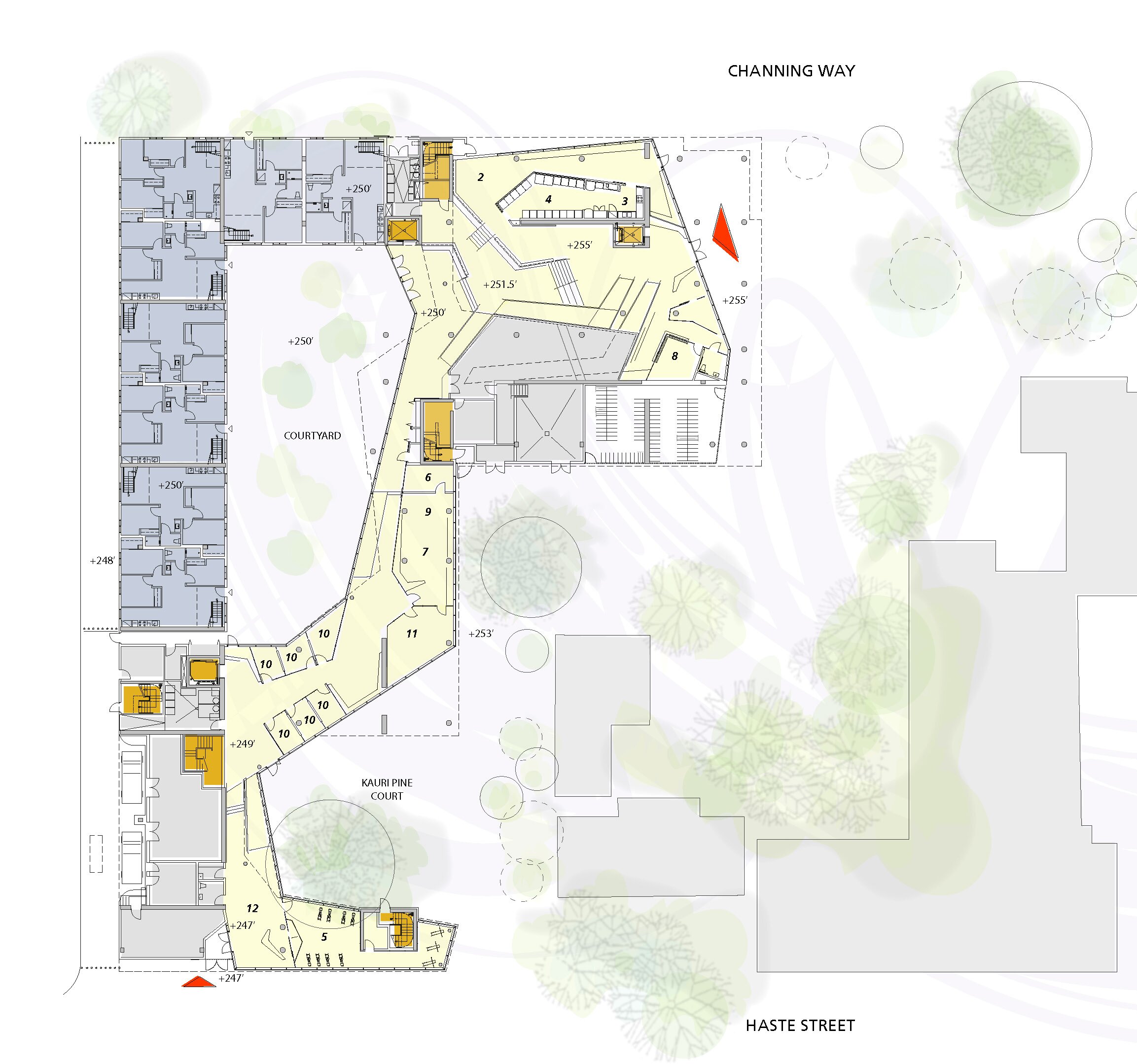 The project site includes the Anna Head Historic Structures Complex, a notable example of the brown shingle style in the Bay Area, a regional expression of the Arts and Crafts Movement. Rather than replicating the adjacent historic structures, the student housing complex presents a contemporary design that responds to their scale, orientation, and spatial organization. The building’s facade features durable, coated aluminum cladding, complemented by warm timber accents that add texture and depth.
