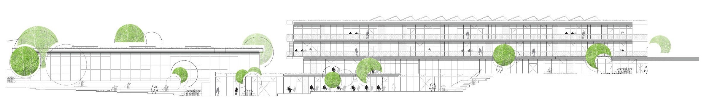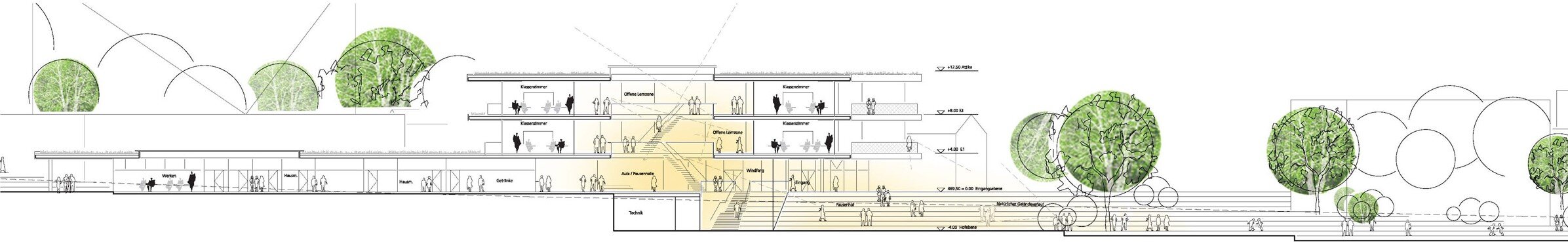 Classrooms and specialized learning areas are arranged in wings extending into the landscape as “green classrooms.” A compact upper volume organizes the main teaching areas around the atrium, enhancing orientation and community. Circulation zones act as extended learning spaces with strong connections to terraces and outdoor areas. The surrounding landscape forms a continuous green campus with tree groves, open spaces, and pathways linking the site.