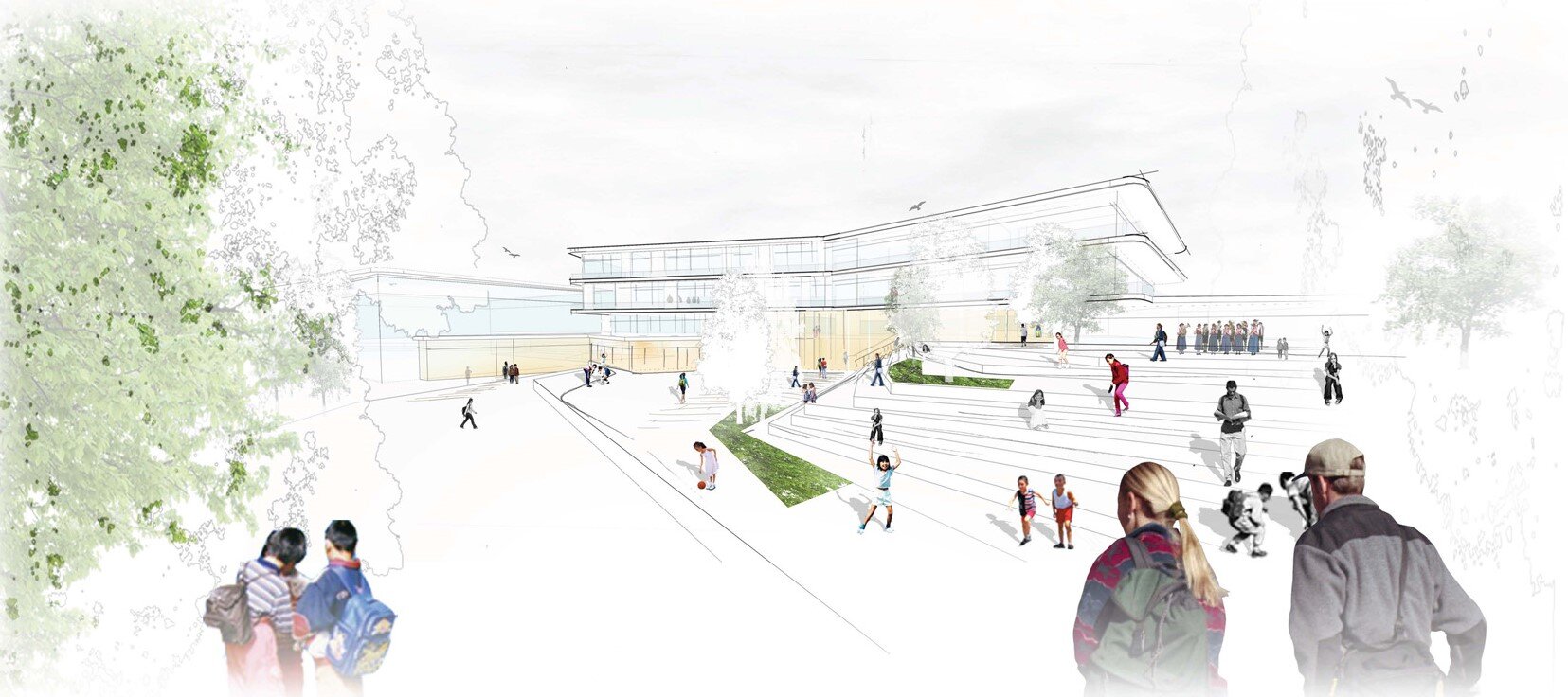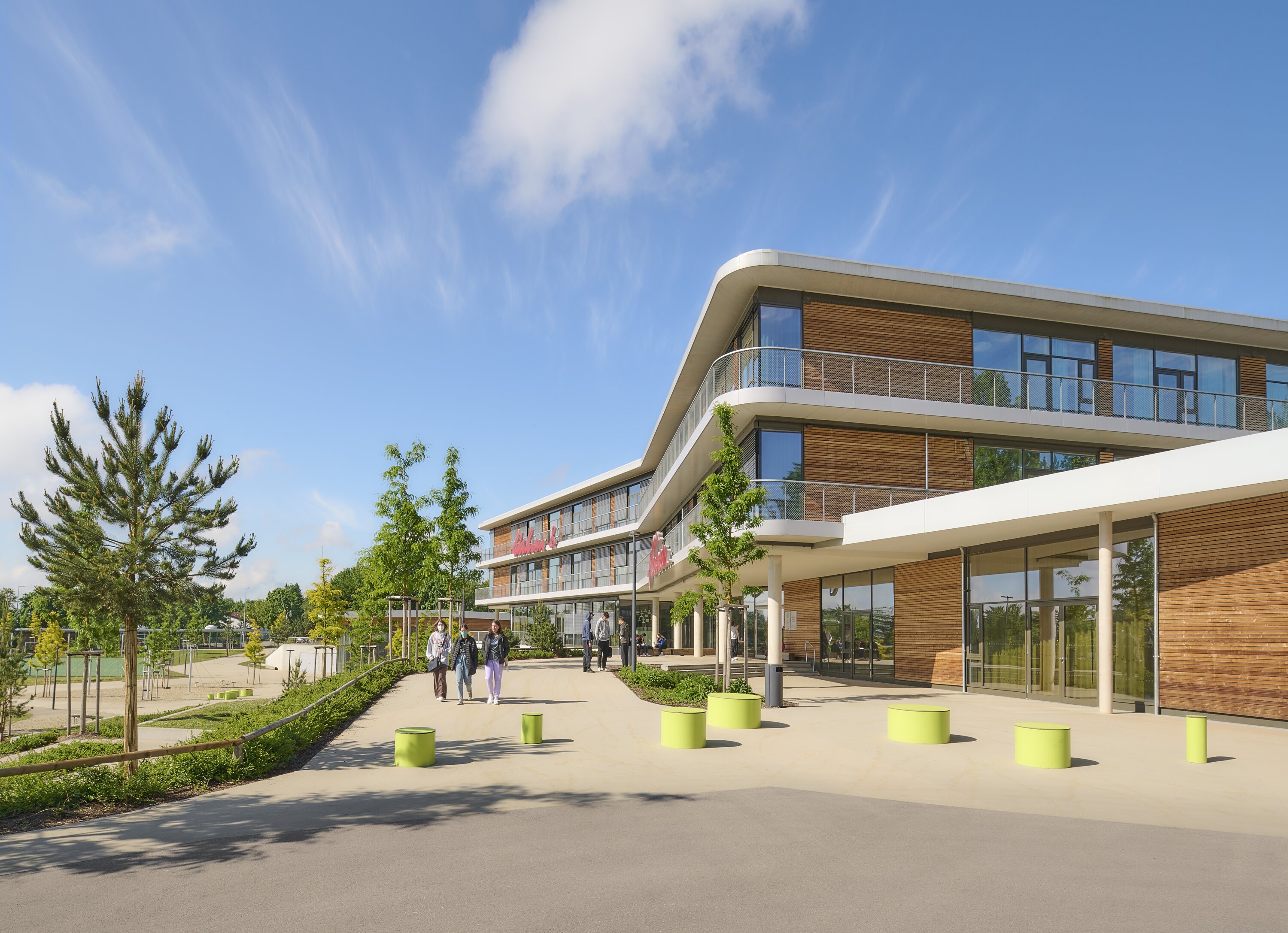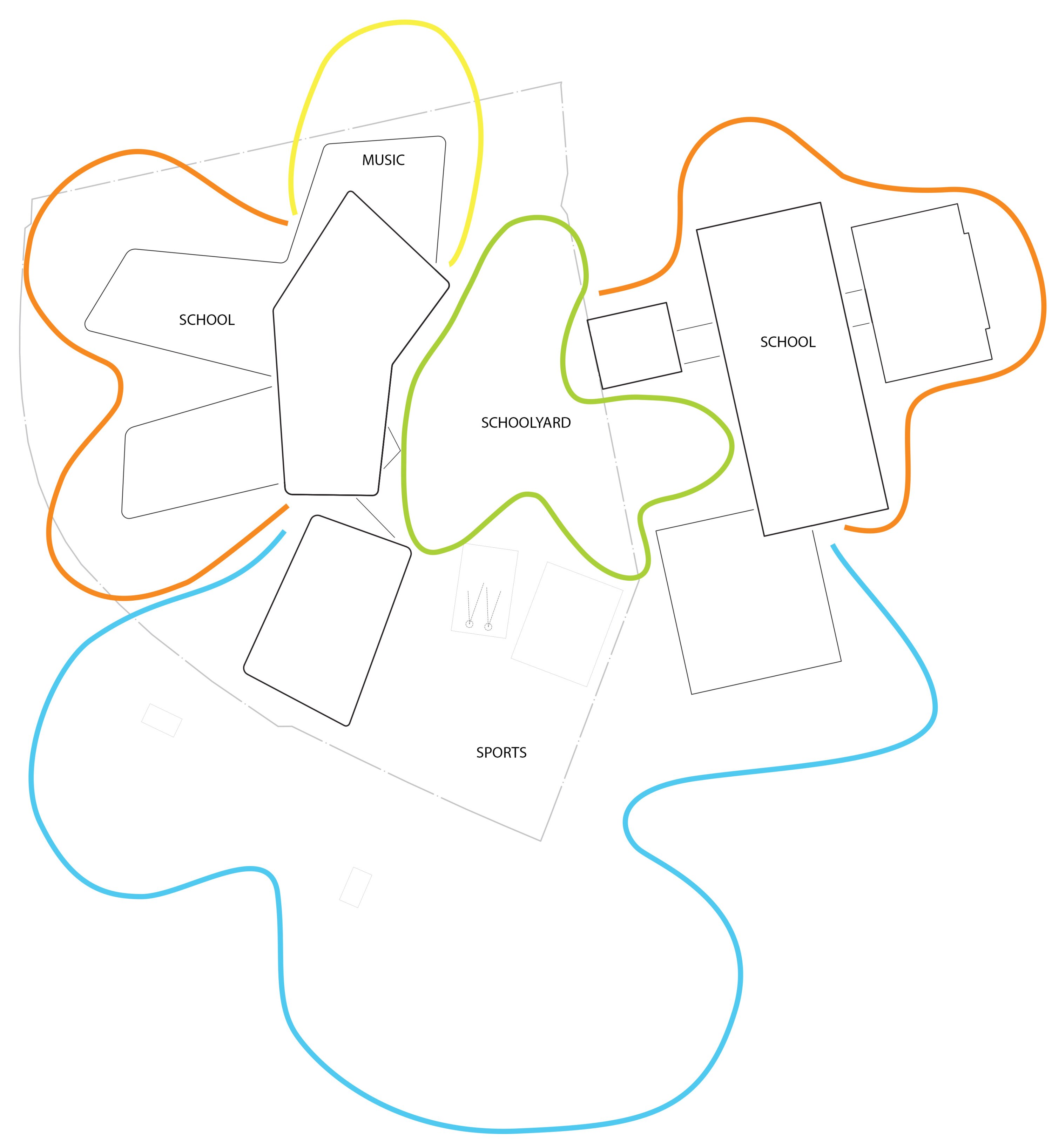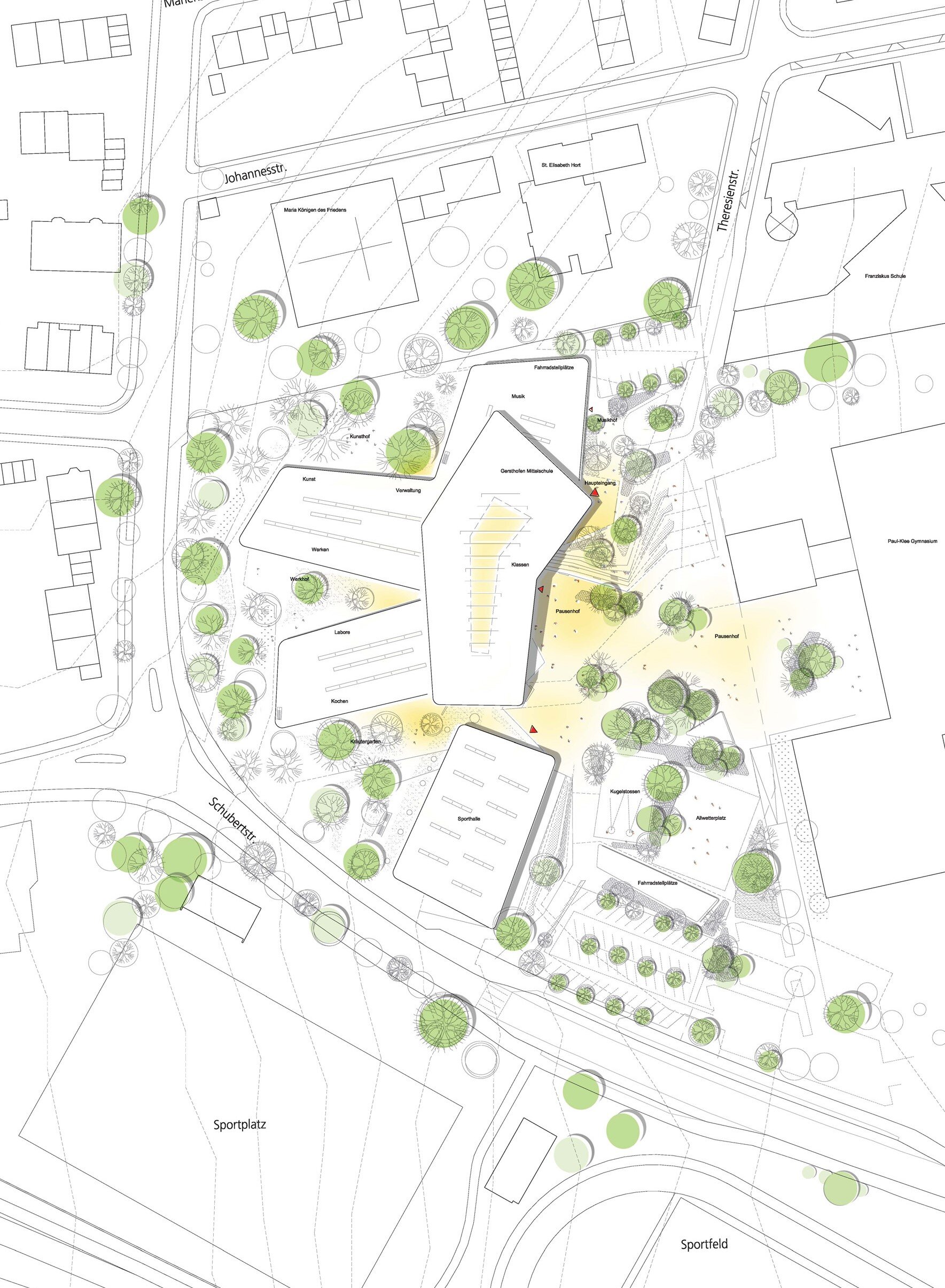 The project replaces the existing school with a new middle school complex including a triple sports hall, outdoor facilities, and spaces for local music groups. In response to the heterogeneous suburban context, the design avoids a monolithic structure and instead proposes a composition of smaller, interconnected volumes integrated into the landscape. The campus is developed in phases, ensuring uninterrupted operation during construction. Sports functions are concentrated in the south, while a shared central schoolyard links the new middle school with the existing high school within a largely car-free environment. Access from the north leads to a central atrium that forms the social and spatial heart, connecting all key functions. The natural slope is used to create a layered sequence of spaces, linking entrance, courtyard, cafeteria, and sports areas.