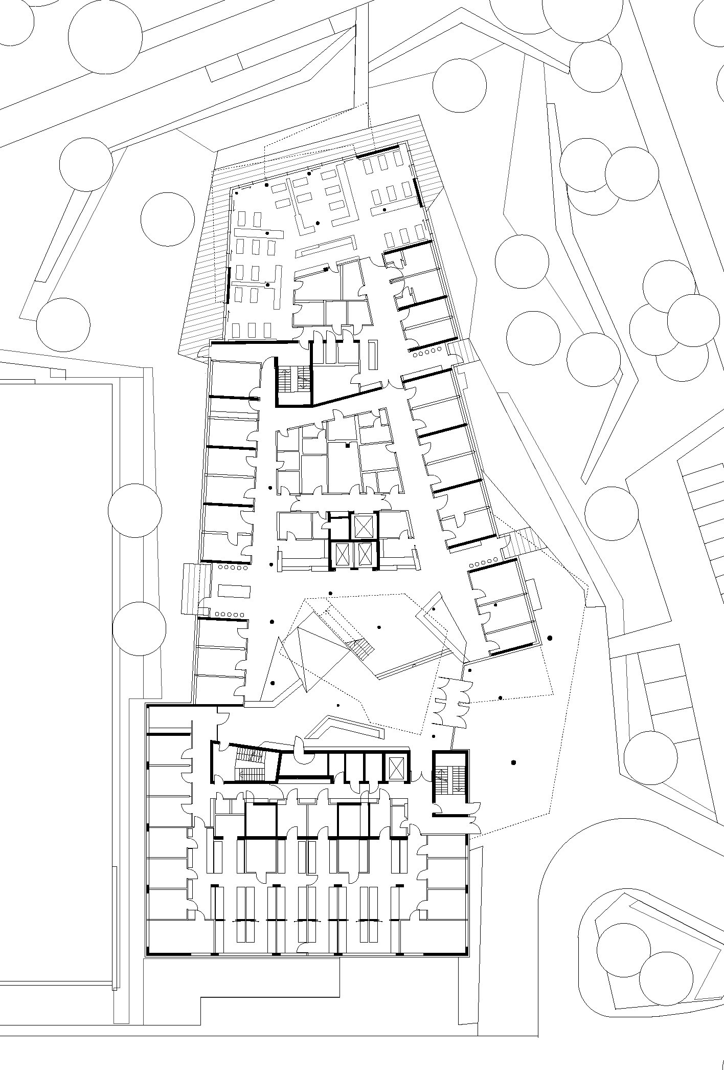 The building’s footprint is shaped by its context: the eastern wing aligns with the orthogonal geometry of the existing clinic, rising over three floors that contain lab spaces, while the western section tapers in plan, following the curve of the adjacent road. Here, day clinic programs are located, featuring comfort-oriented niches whose interior design with soft colors and materials creates a welcoming environment. Above, a two-story, polygonal volume cantilevers over the north entrance and western edge of the building. Accommodating consultancy suites, conference rooms, and offices for both research and clinical staff, this structure serves as a defining element that ties the building together.
