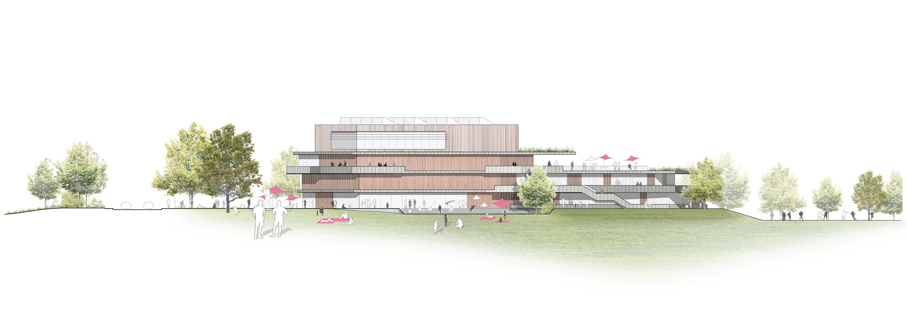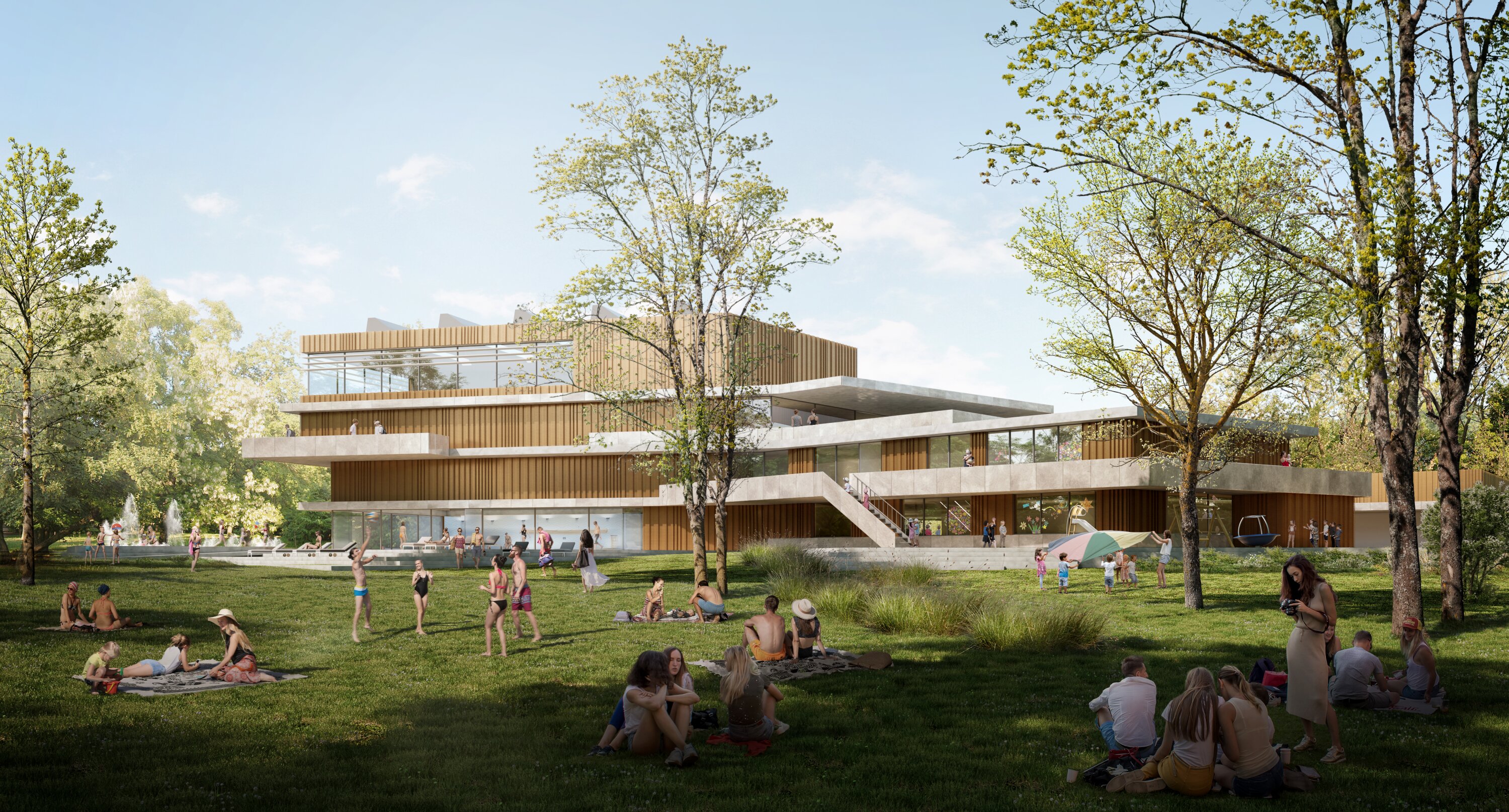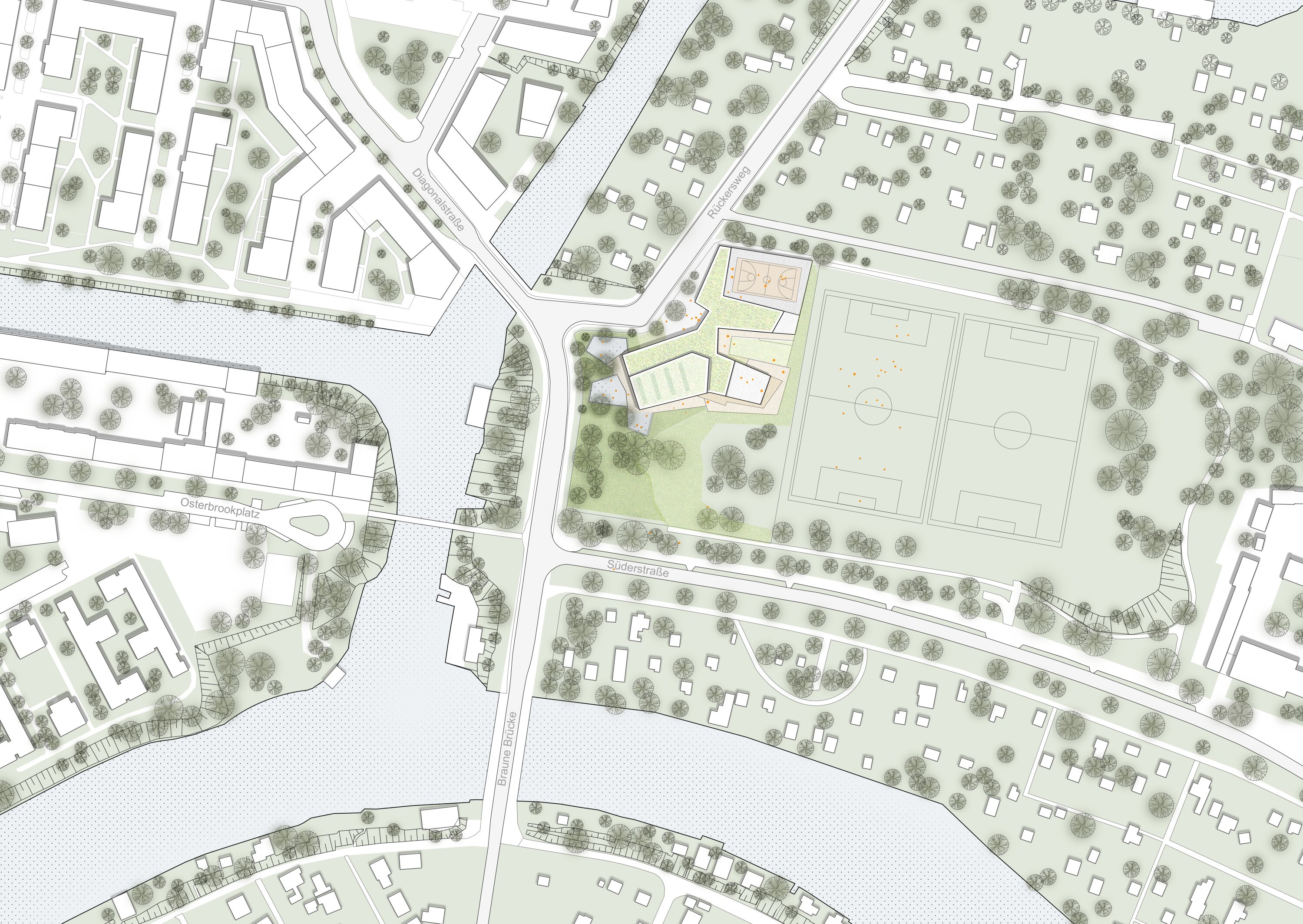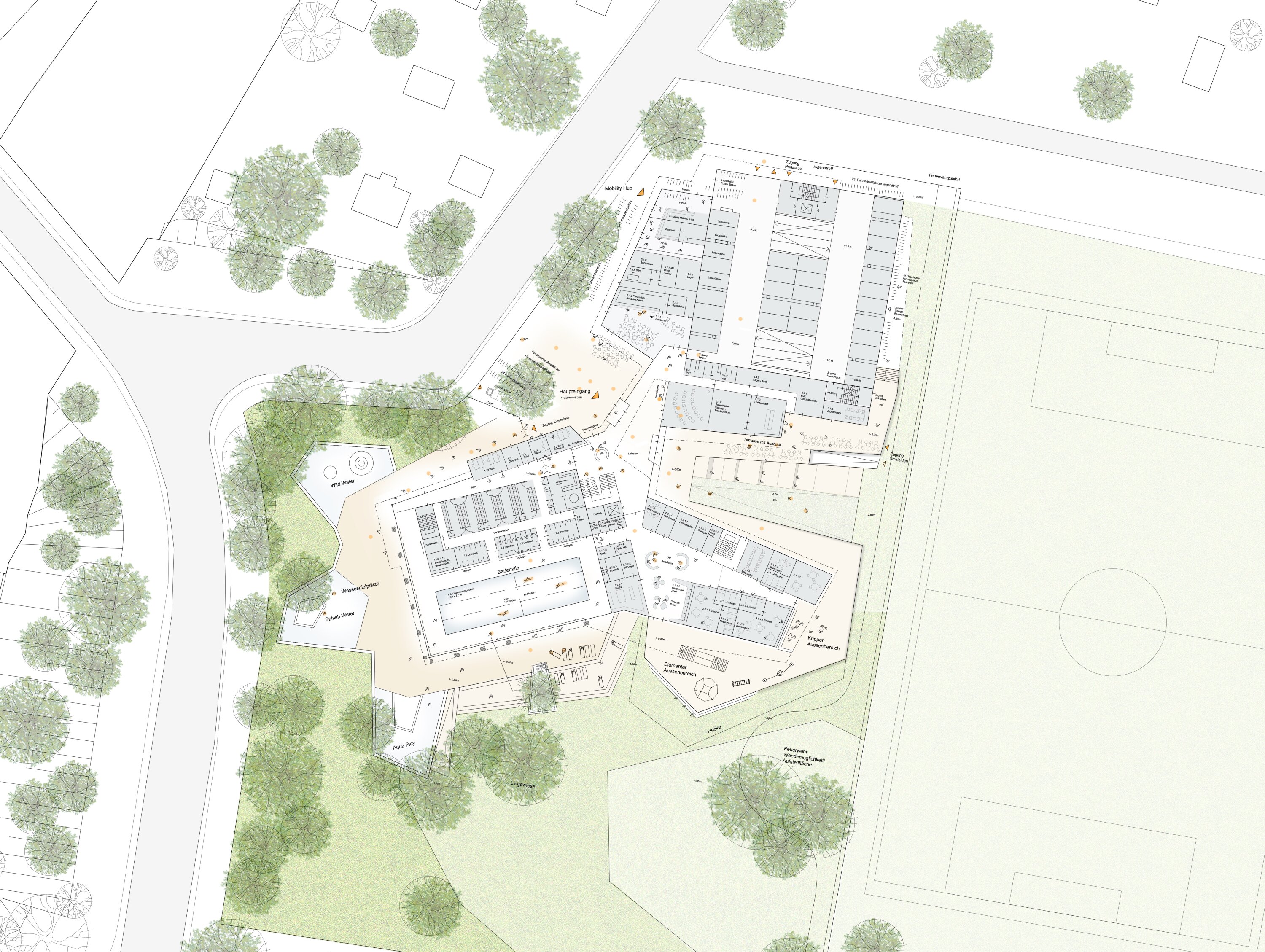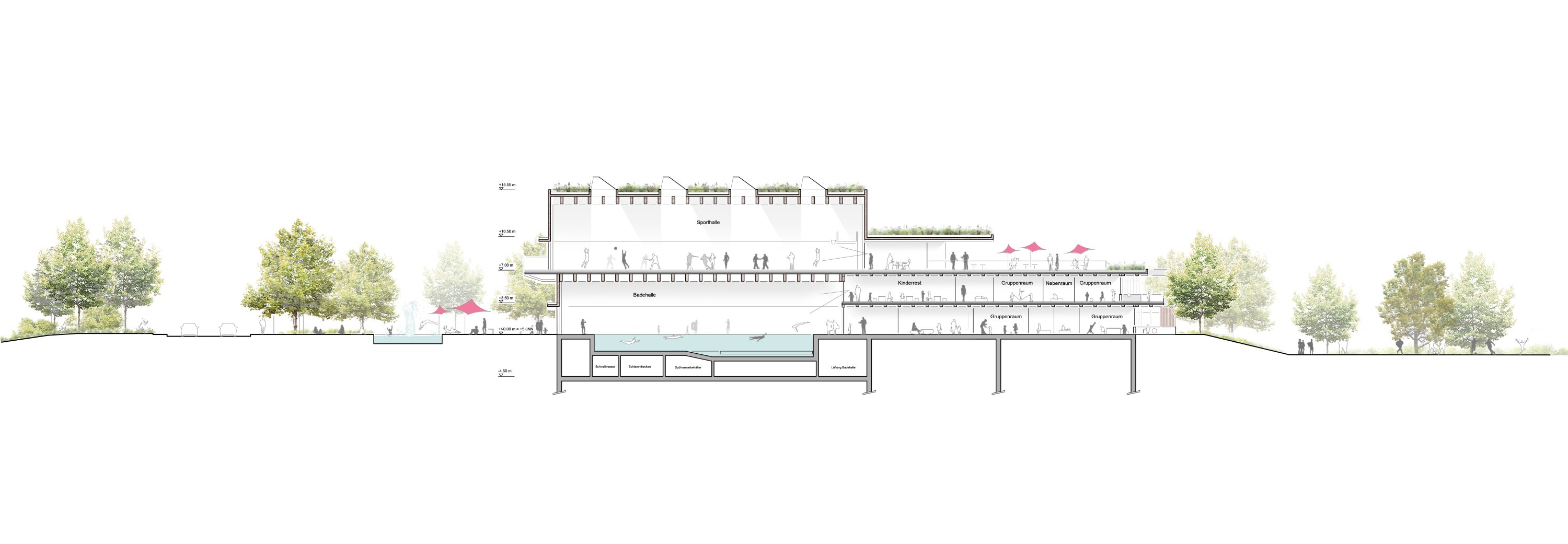 As part of the redevelopment of the former outdoor pool site, the project establishes a new urban sports hub that combines swimming facilities, a movement daycare, sports hall, club spaces, youth center, gastronomy, and a mobility hub. The building is articulated to form a landmark towards the city while stepping down towards the sports fields, creating a landscape-oriented structure with accessible and usable roof areas. A central foyer with vertical openness connects all levels and acts as a social core.