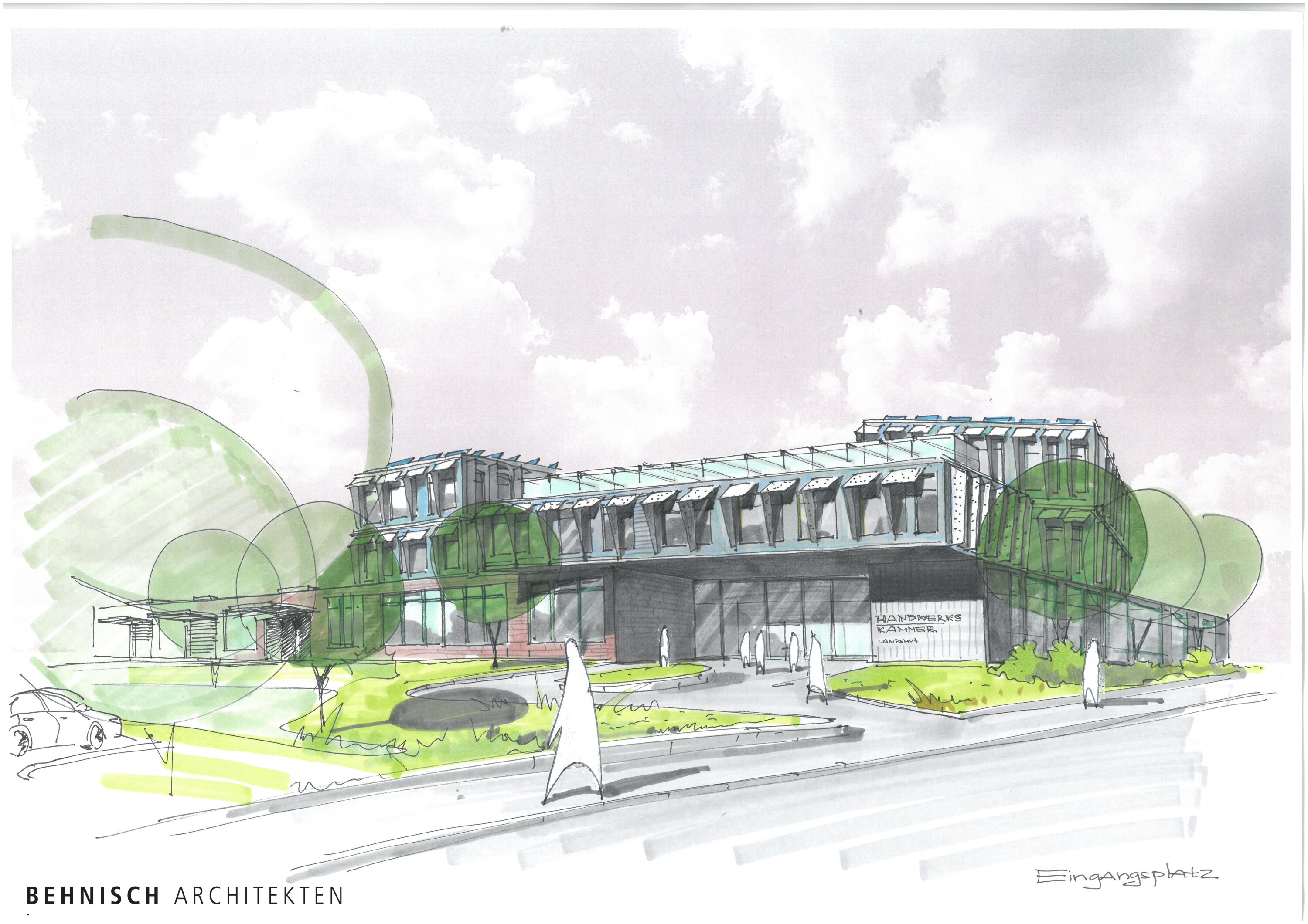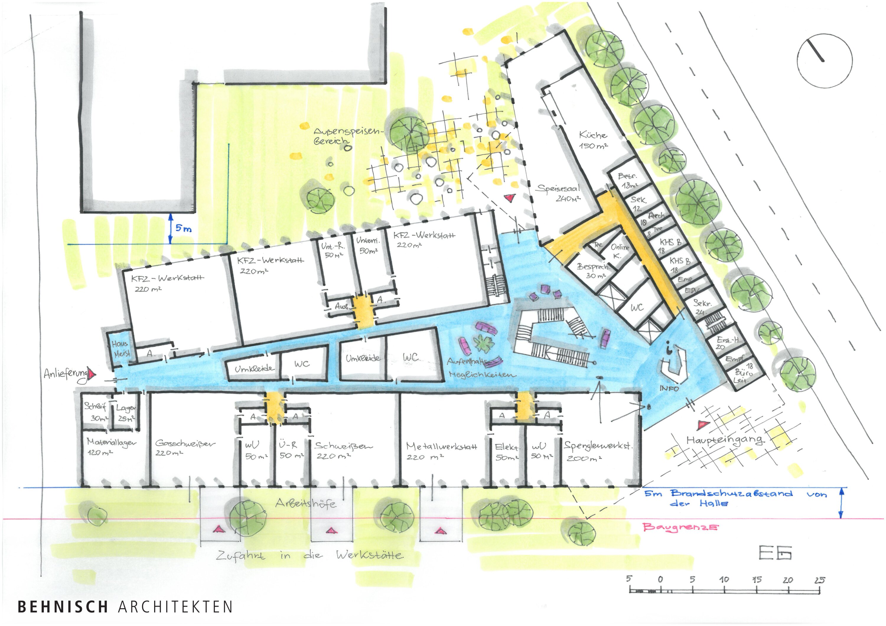 The design organizes diverse functions into clearly structured and stacked volumes, generating distinct spatial qualities inside and out. A visible main entrance in the southeast connects to green spaces, parking, and workshop areas, while a protected cafeteria garden is located on the opposite side. An atrium links both zones, turning the building into a connective element rather than a barrier. All functions are arranged around an open circulation system, enabling intuitive orientation and creating multifunctional spaces for interaction, exhibitions, and events. Each department gains a clear address while benefiting from shared synergies.