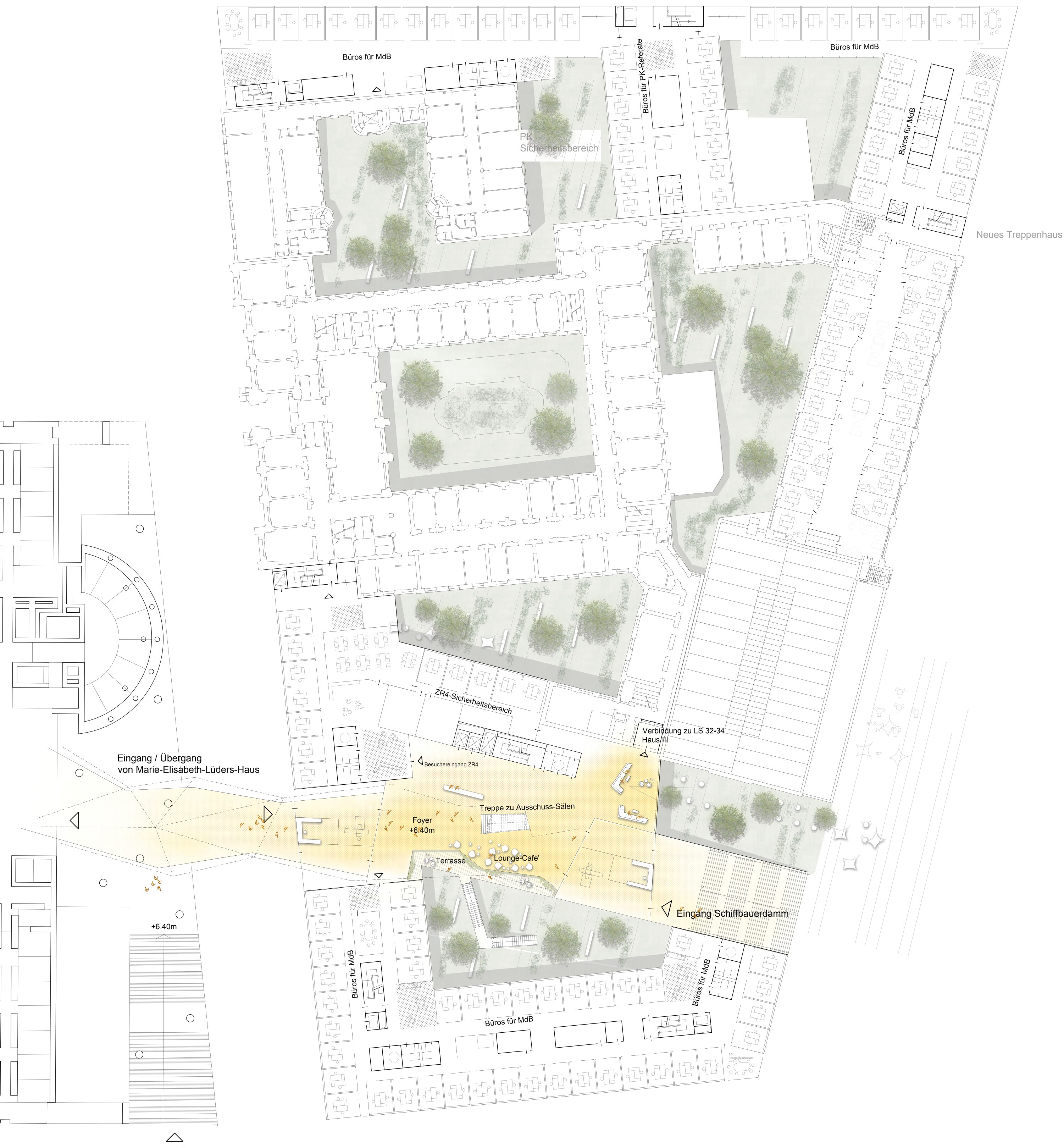 Rather than continuing the Band purely as a formal gesture, the project extends its internal organizational principle: a dominant circulation and communication spine connecting the parliamentary buildings. Movement and encounter spaces are continued as a programmatic and conceptual extension rather than as a rigid urban axis. Urbanistically, the project adopts the Berlin block typology with a staggered system of inner courtyards, carefully integrating the historic buildings into a coherent ensemble without overpowering them. A freely formed roof structure spanning the new northern and southern building wings mediates between the historic fabric and the new architecture, completing the closed block.