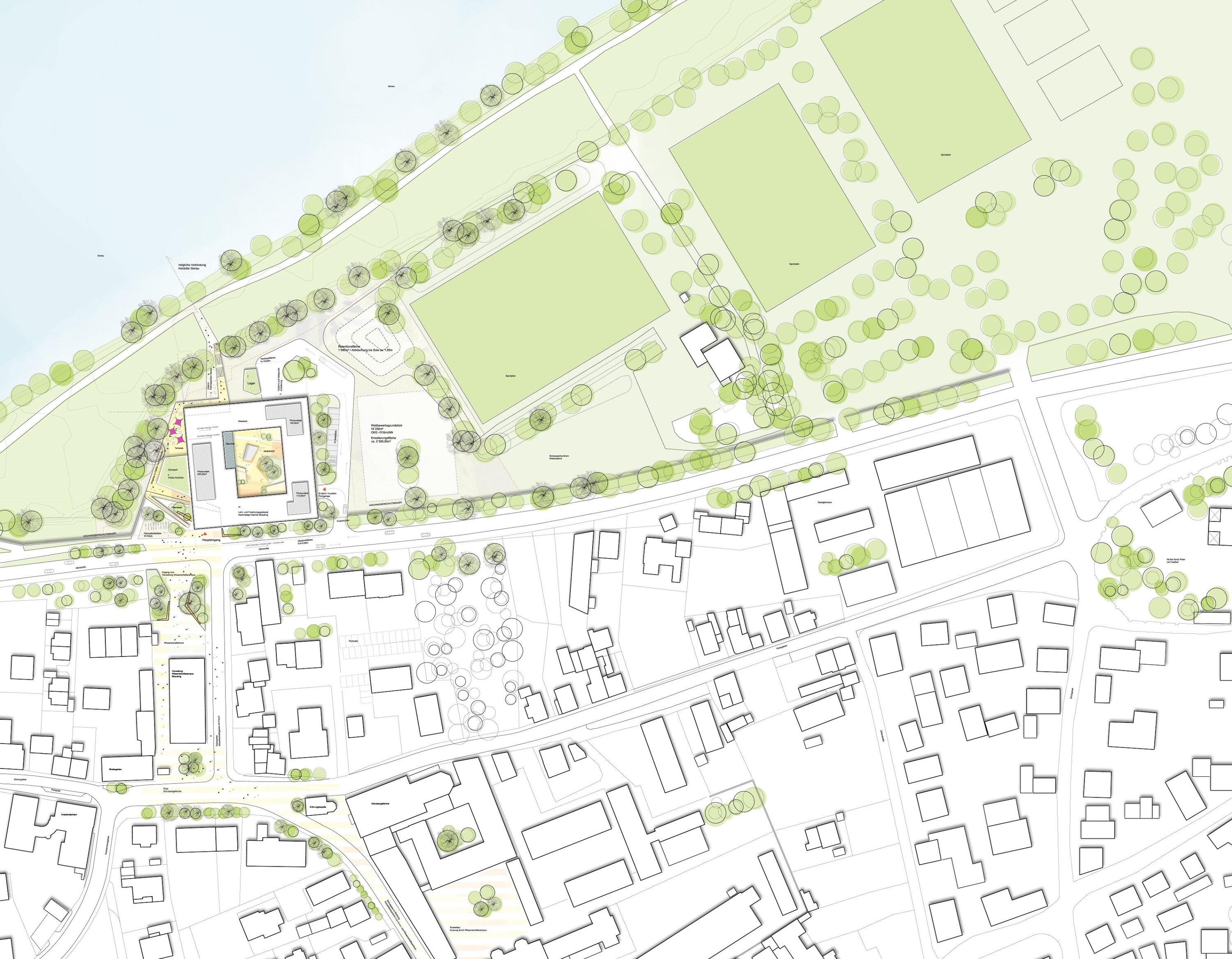The design follows the idea of a self-contained unit, with all functions arranged around a green inner courtyard that serves as a protected and communicative core. While office and laboratory areas are efficiently organized, shared spaces open towards the courtyard, fostering exchange and interaction.