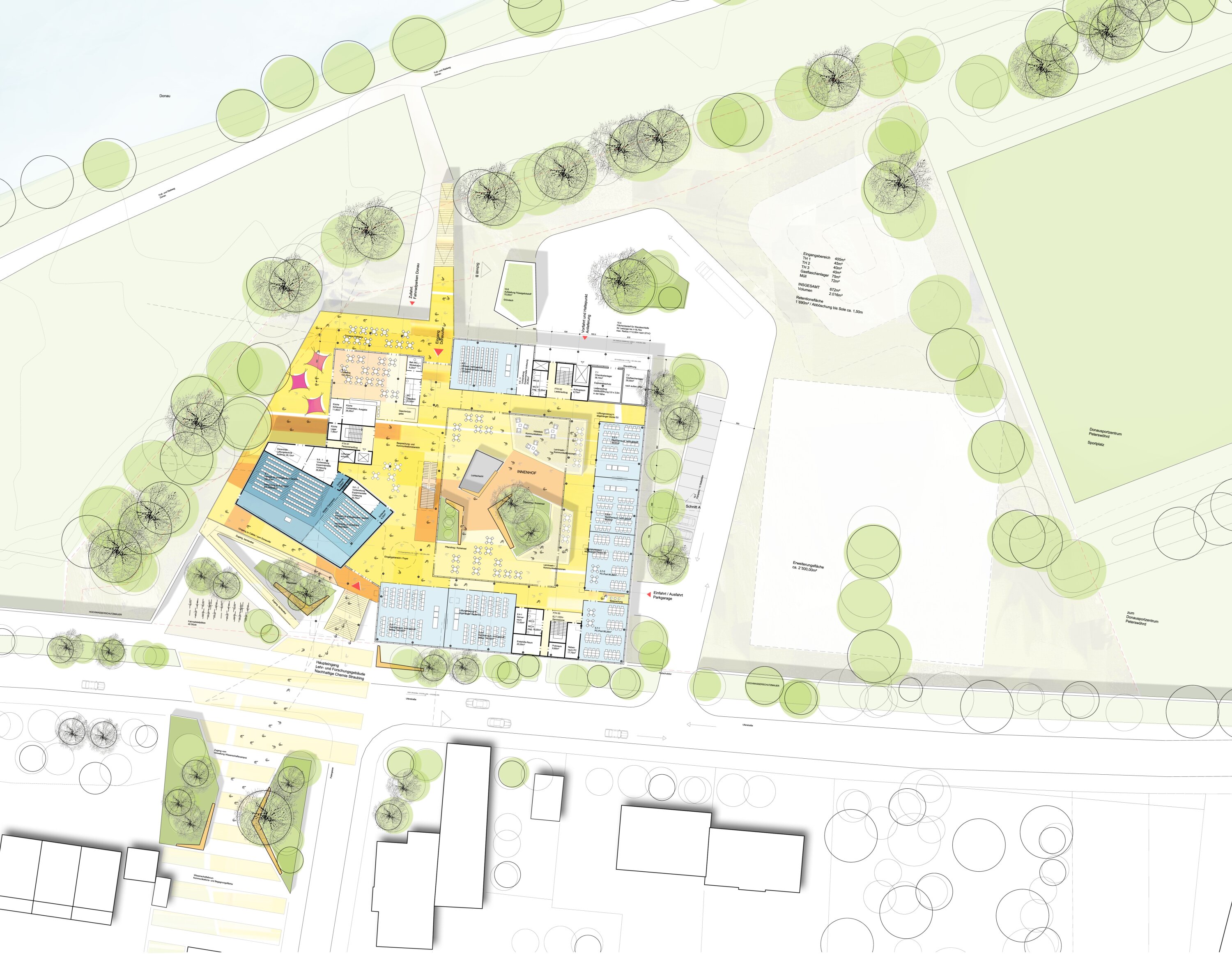 Due to its location in a flood-prone area, the building is elevated on stilts, with parking integrated below to preserve retention space. Access is provided via a generous entrance sequence leading to a central atrium, which acts as the main distribution and social hub. Functions are clearly structured by level, with lecture halls, student areas, offices, and laboratories organized in separate yet interconnected zones. Flexible layouts and open circulation spaces encourage interdisciplinary collaboration.