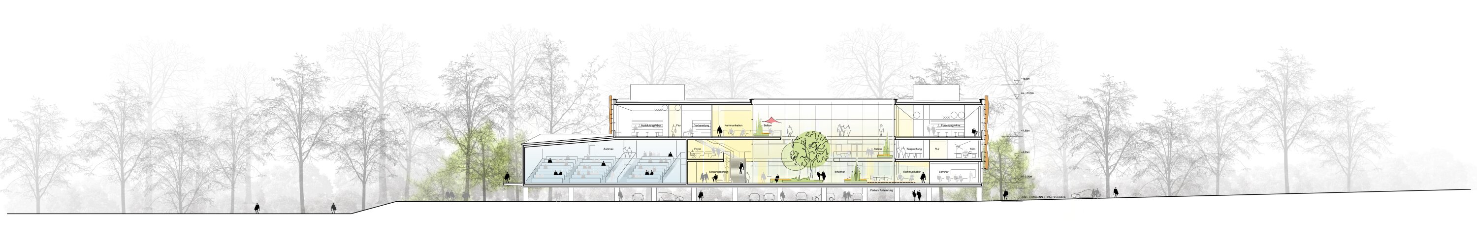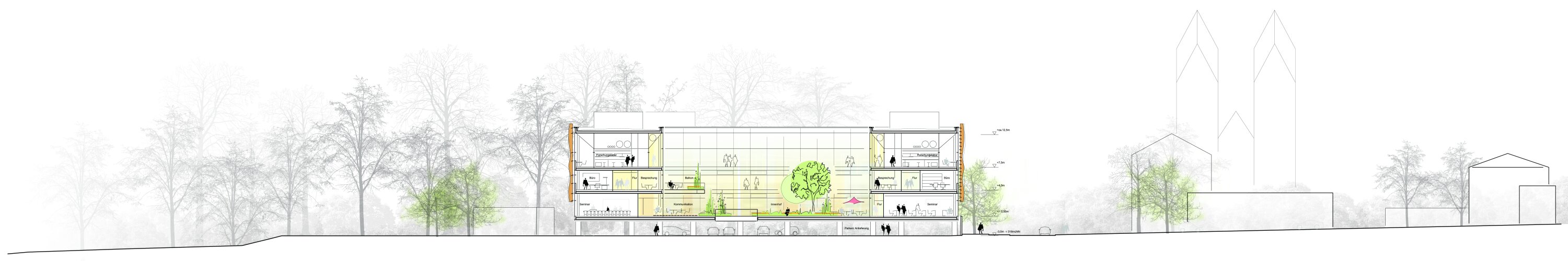 The structural concept is based on a reinforced concrete frame, allowing adaptable use over time. Lightweight timber-glass façades with integrated shading systems ensure energy efficiency, daylight quality, and a distinctive architectural identity. An integrated climate and energy concept combines passive strategies, natural ventilation, thermal mass activation, and renewable systems such as geothermal energy and photovoltaics. The result is a flexible, sustainable, and communicative research environment with a strong spatial identity.