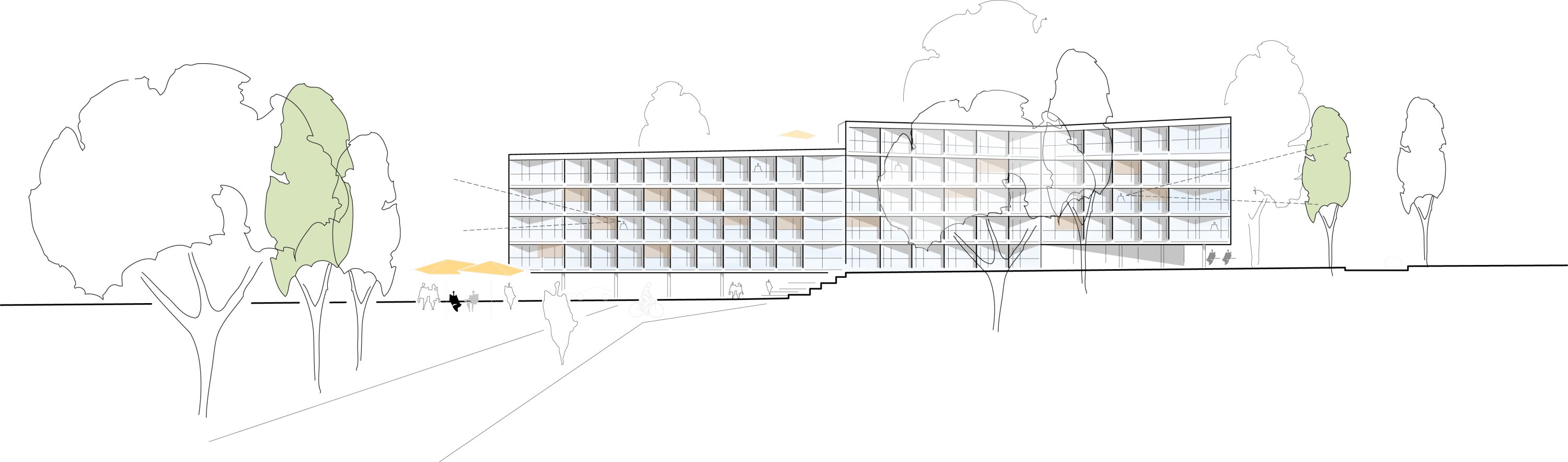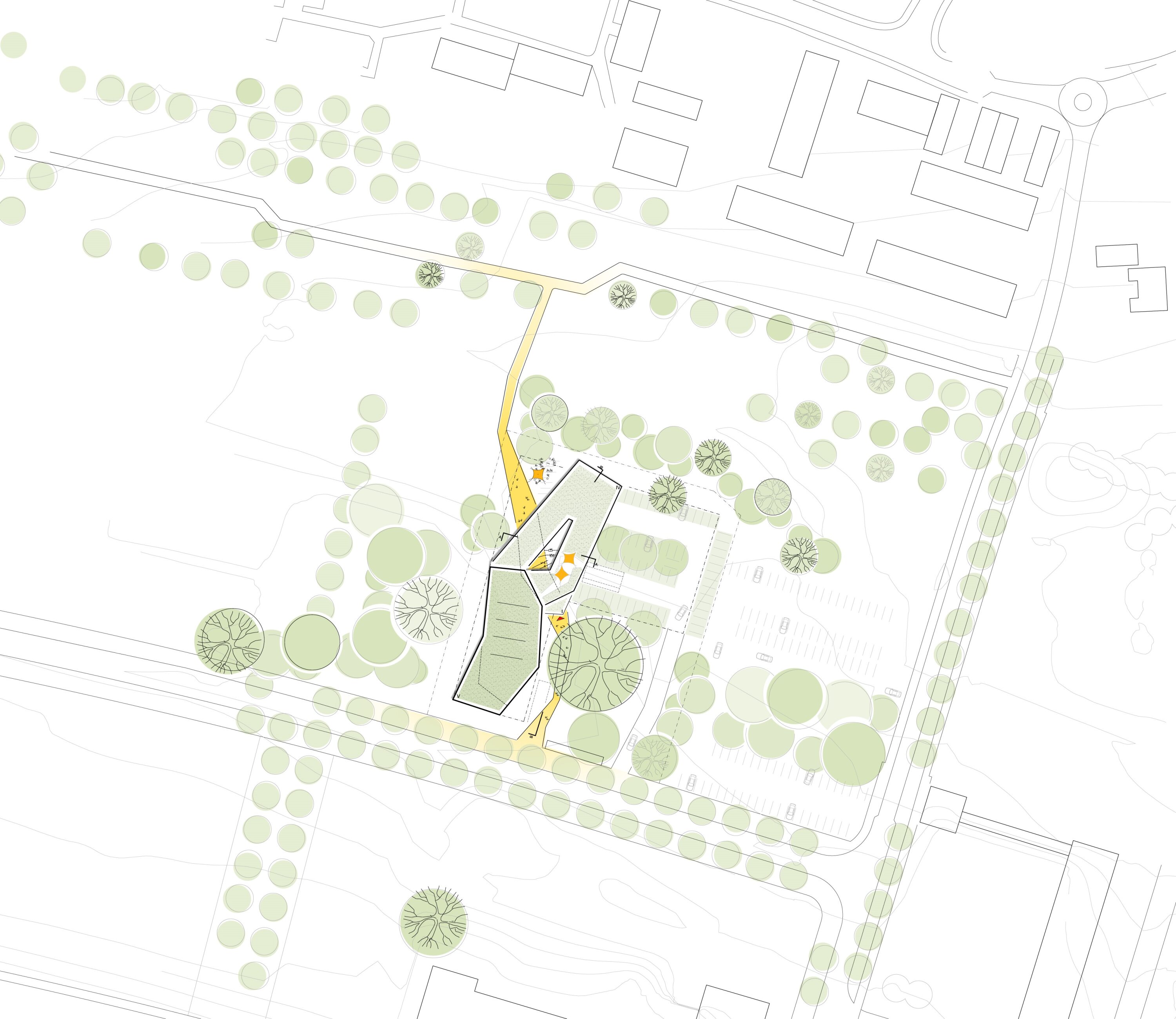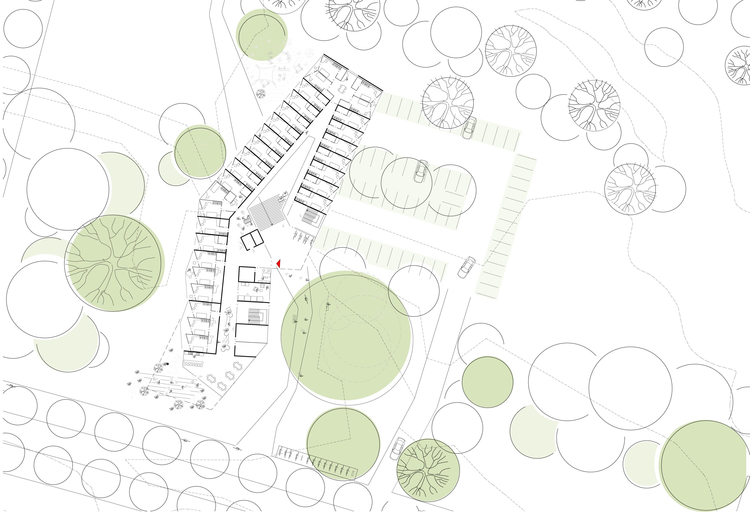 Outdoor areas are largely preserved as green space, with minimal sealed surfaces, structured parking, and new pathways connecting the site. Terraced outdoor zones and sheltered courtyards provide spaces for social activities.