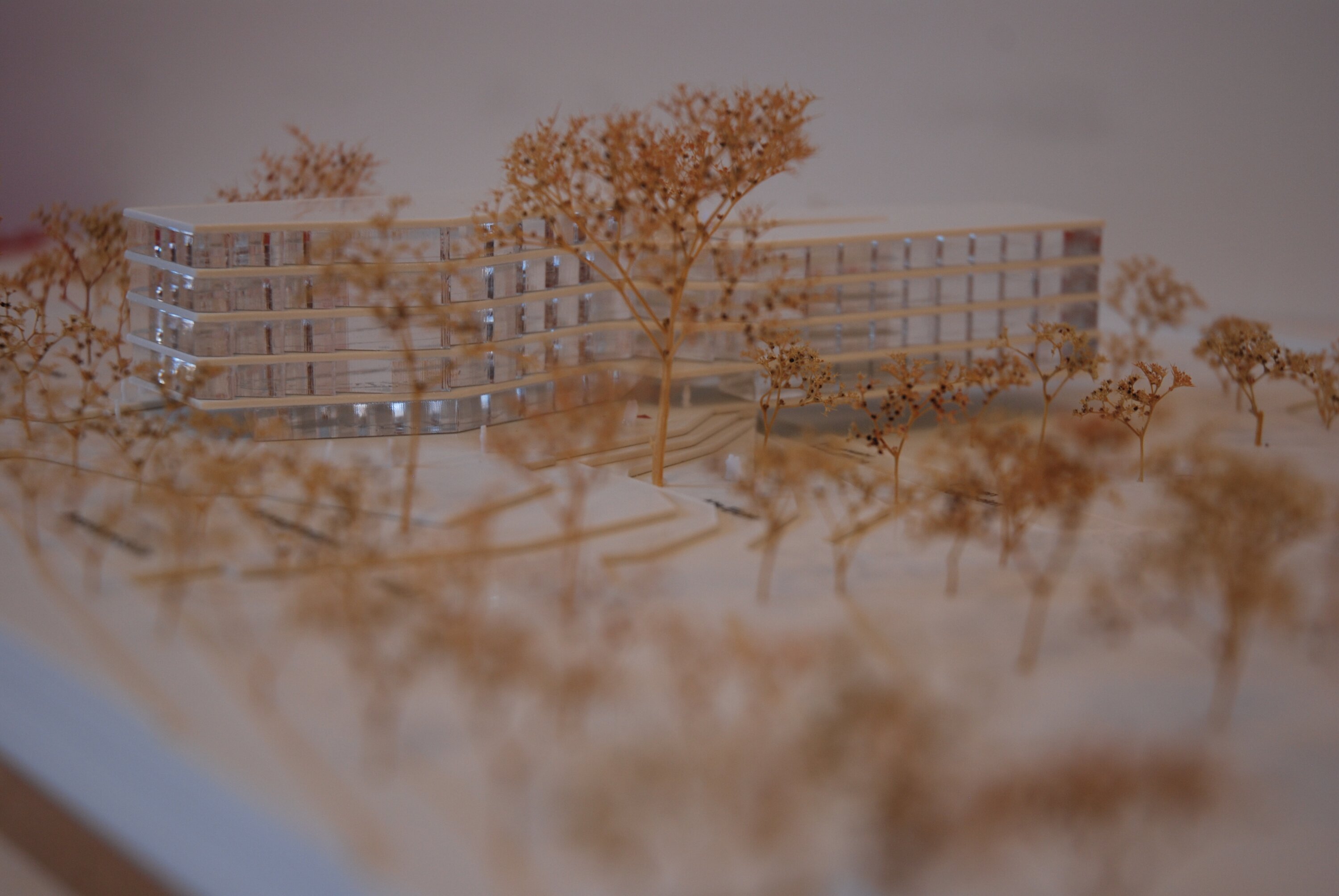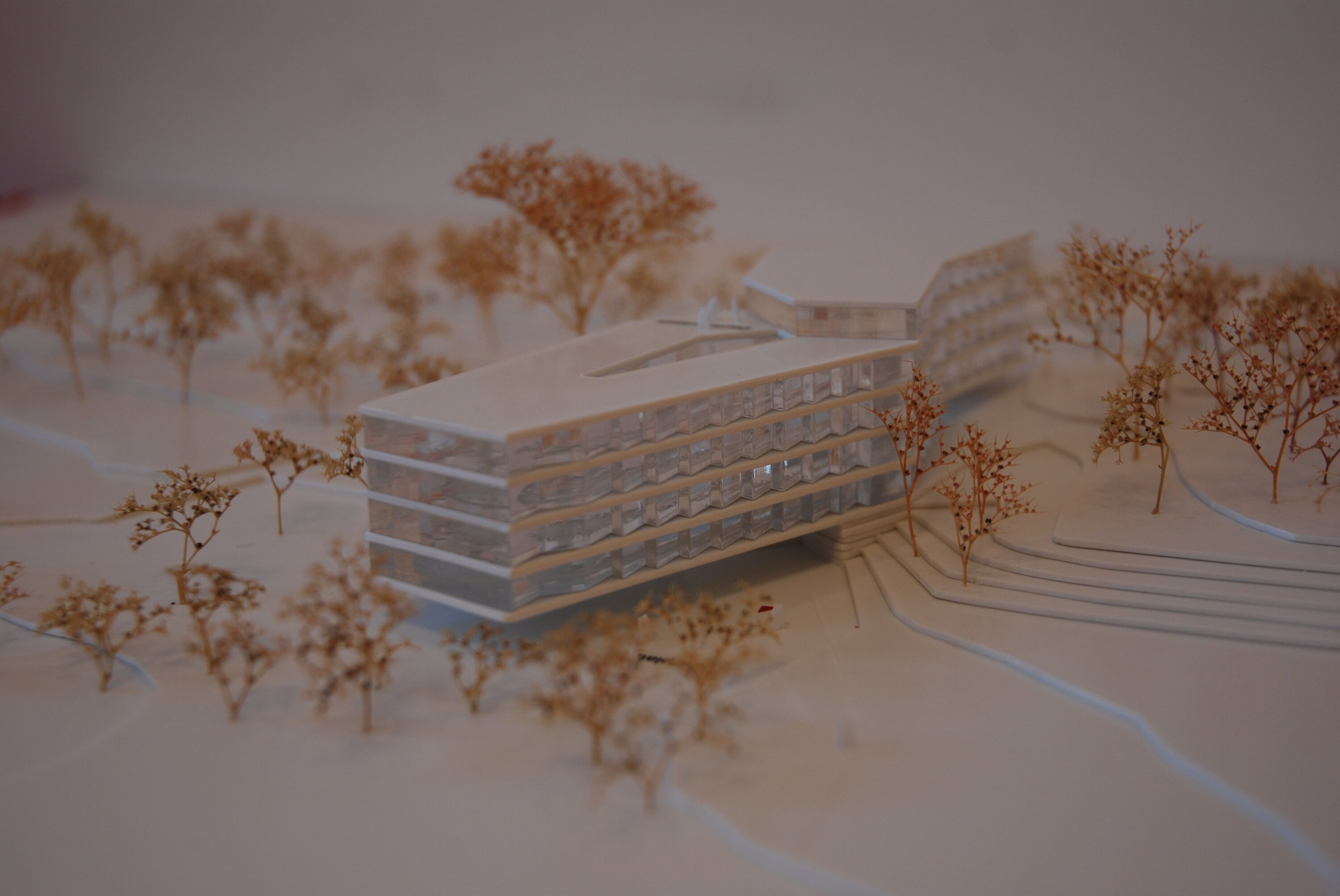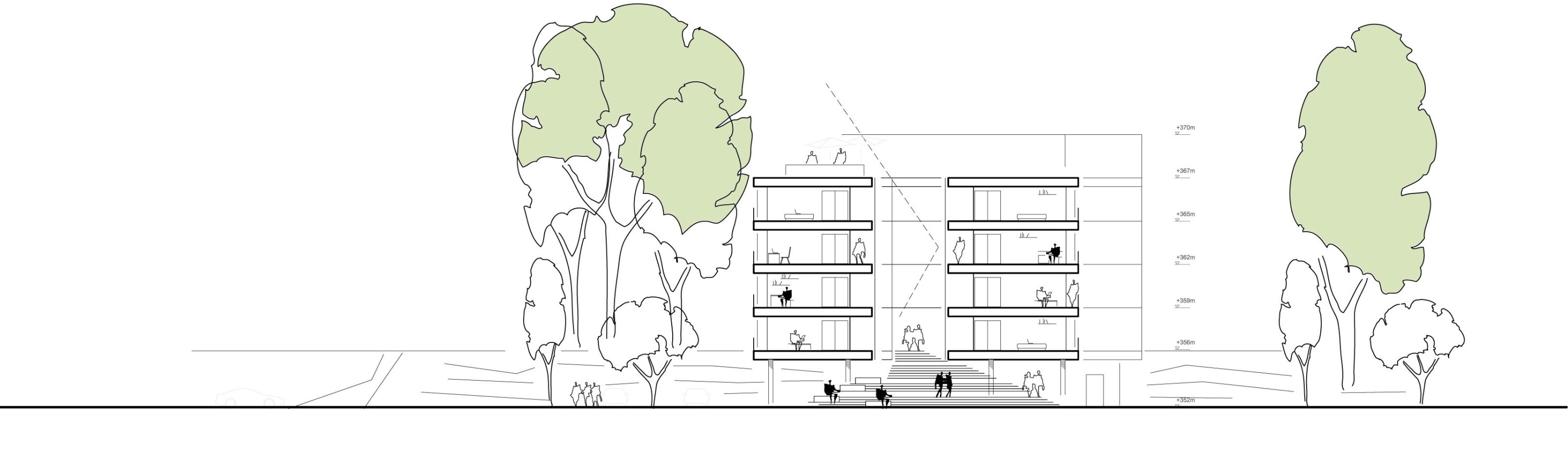 The building adapts to the sloping site and existing trees, forming a stepped and articulated volume that connects the street with adjacent green spaces. Its layout creates outdoor areas of high quality and establishes a dialogue with the surrounding landscape. Two main entrances connect the building from north and south, leading to a central access zone with shared spaces and administration. The housing program includes a mix of single apartments, duplex units, and shared flats, all organized along efficient circulation routes with accessible design. Corridors expand at key points to create social spaces, while an internal courtyard improves daylight and orientation. The project promotes a balance between private living and communal interaction.