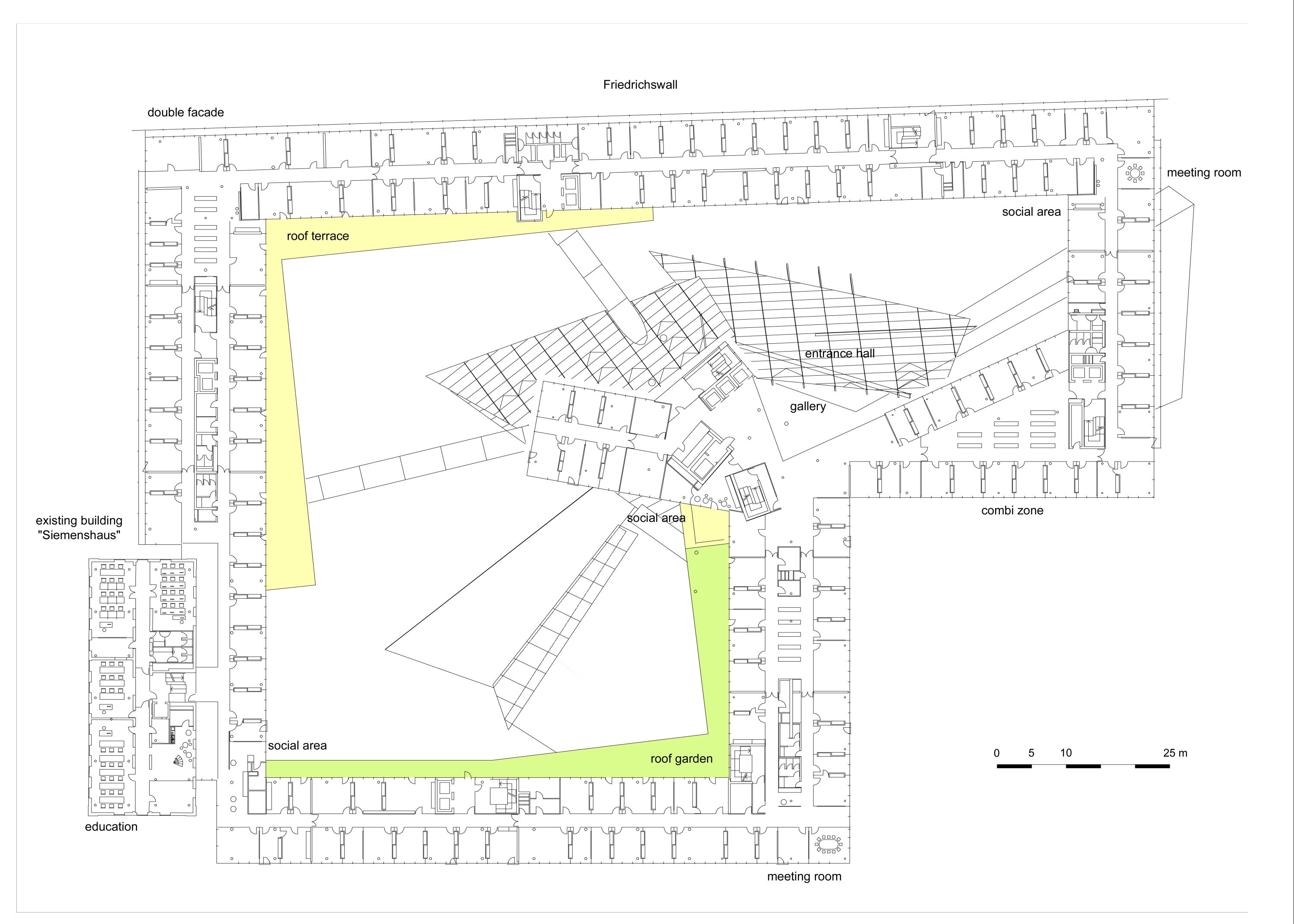 Rising from this central space is a distinctive 70-meter tower, which departs from the formal order of the perimeter building through a series of twists and shifts. Its expressive form establishes visual and symbolic connections to the broader city and references the geometries of the historic northern downtown rather than the surrounding post-war grid. This high-rise building features conference areas, lounges, restaurants and board offices.
