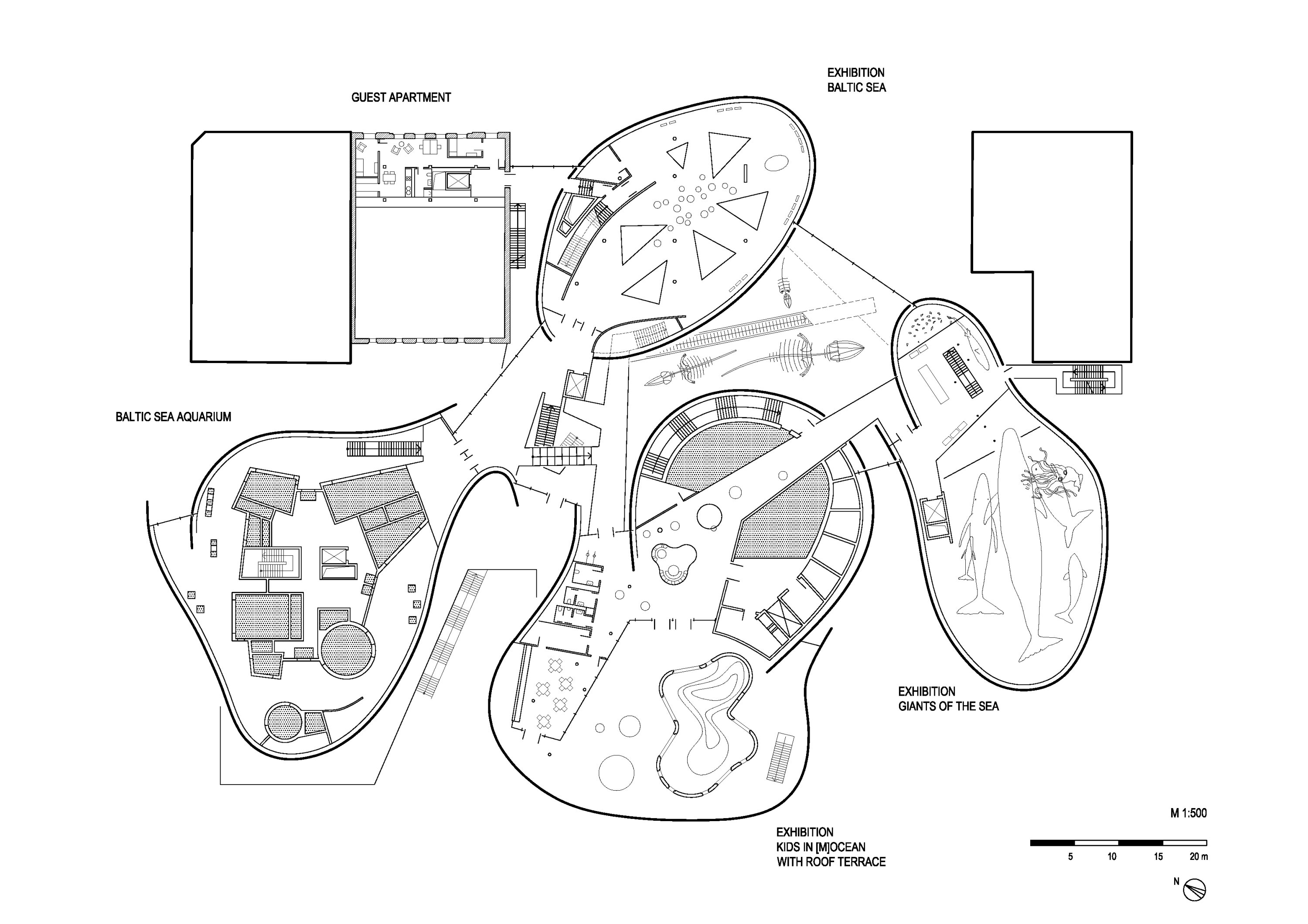 The OZEANEUM relates to the sea, rather than to the city. It is conceived as an open house, designed to be flooded with daylight and accessible to visitors from all sides. Reminiscent of stones around which water swirls, the building is divided into four individual sections, each of which is devoted to a particular exhibition theme including two aquaria addressing the North Sea and the Baltic Sea. This layout allows visitors to take a spectacular journey of discovery through and between the exhibitions. The centerpiece of the North Sea aquarium is a huge tank of schooling fish.