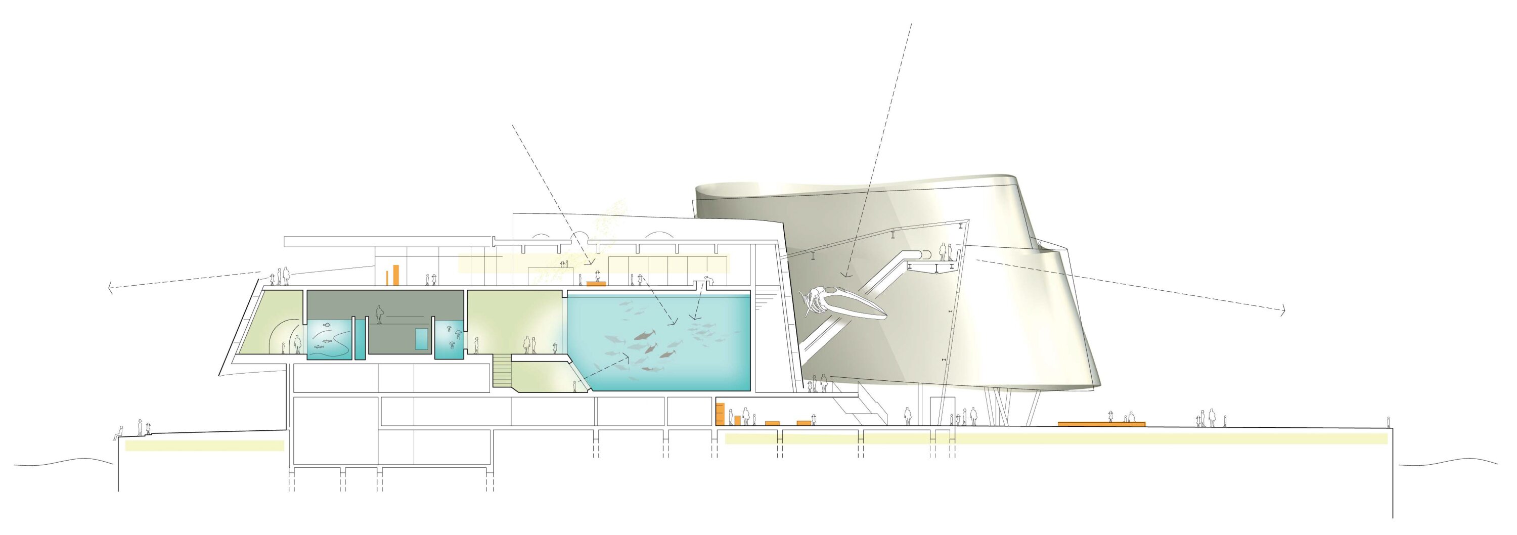 The exhibition areas are located on the upper floor and linked by footbridges and ramps. Exhibition tours are designed to bypass general visitor traffic. The aquaria are set around a central core of maintenance and technical amenities. The four volumes are wrapped in ribbons of pre-formed steel sheeting, fabricated by virtue of ship-building technology. They draw together the building’s various sections, lend it a unified profile, and evoke a sense of lightness through their projecting edges.