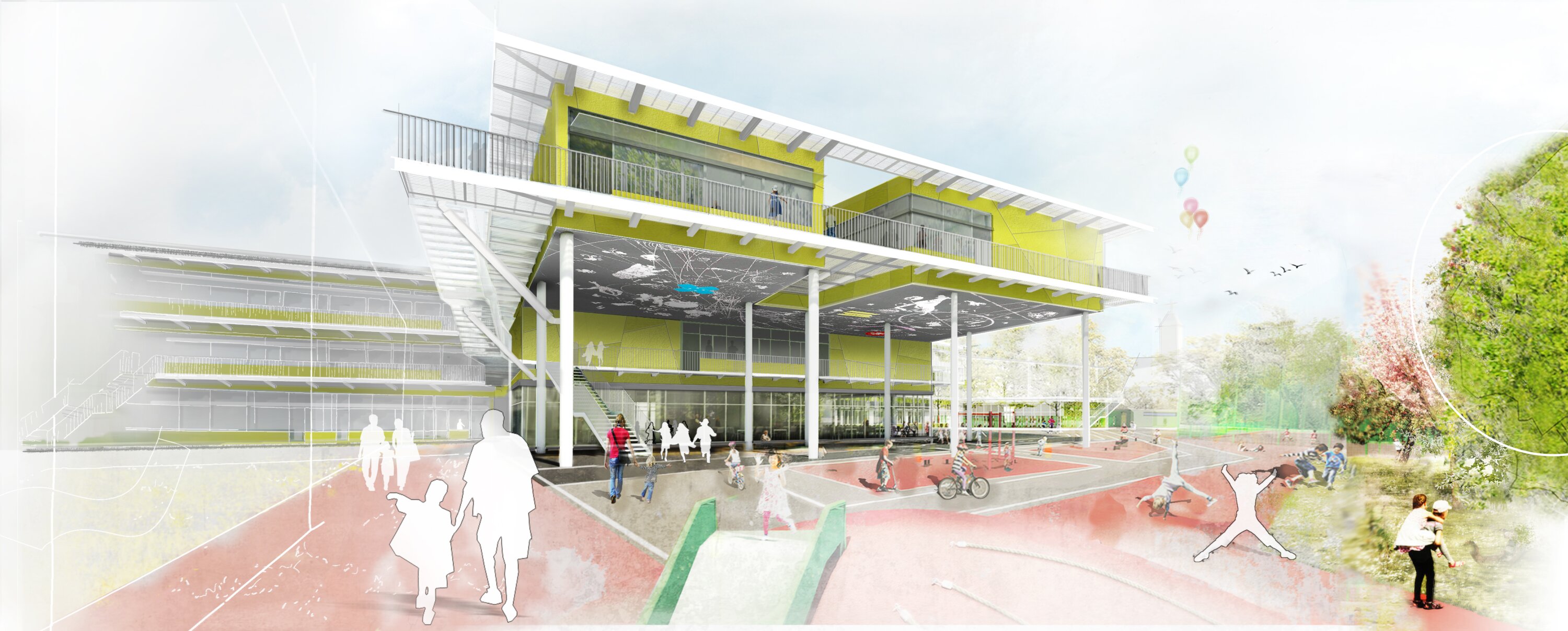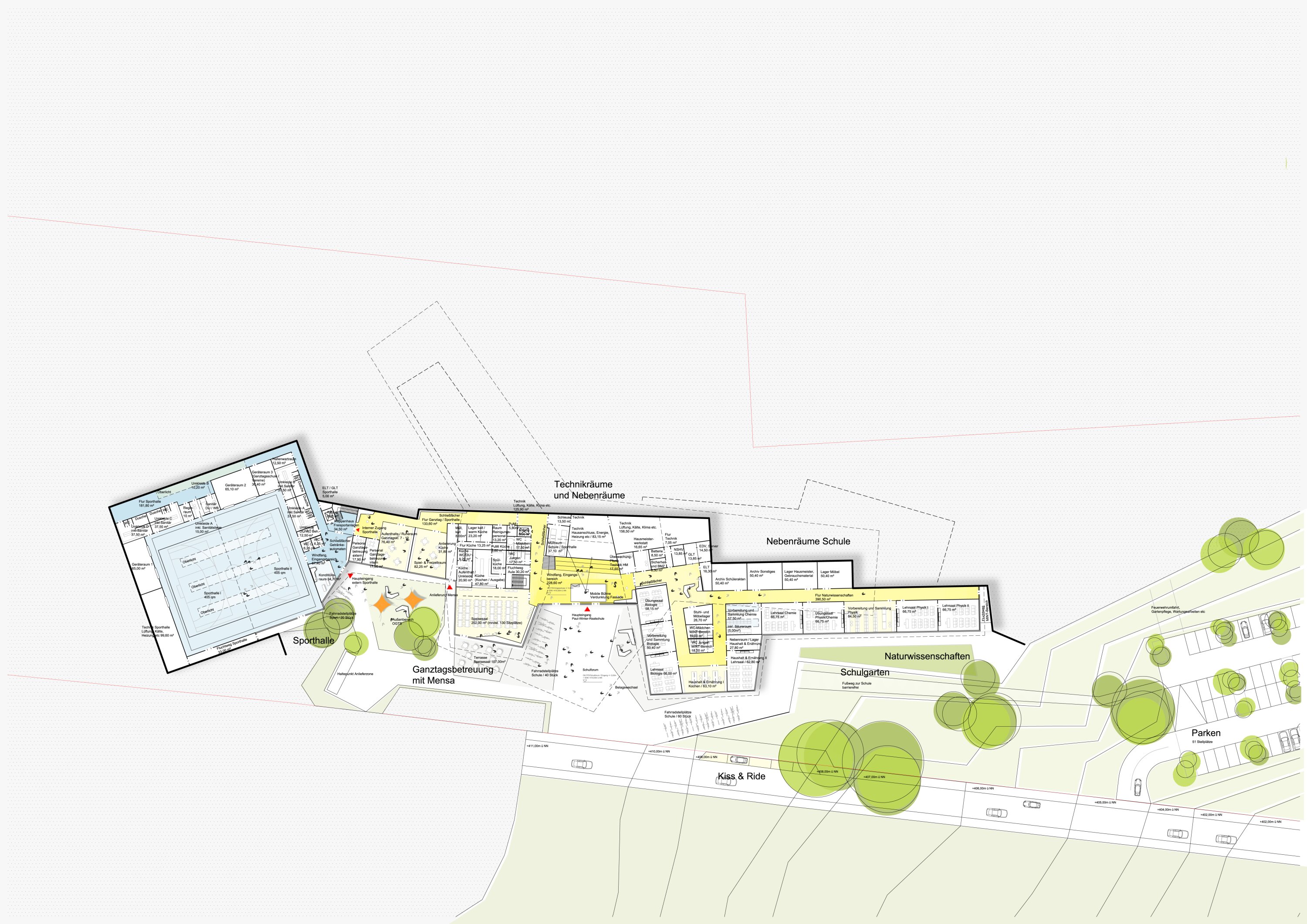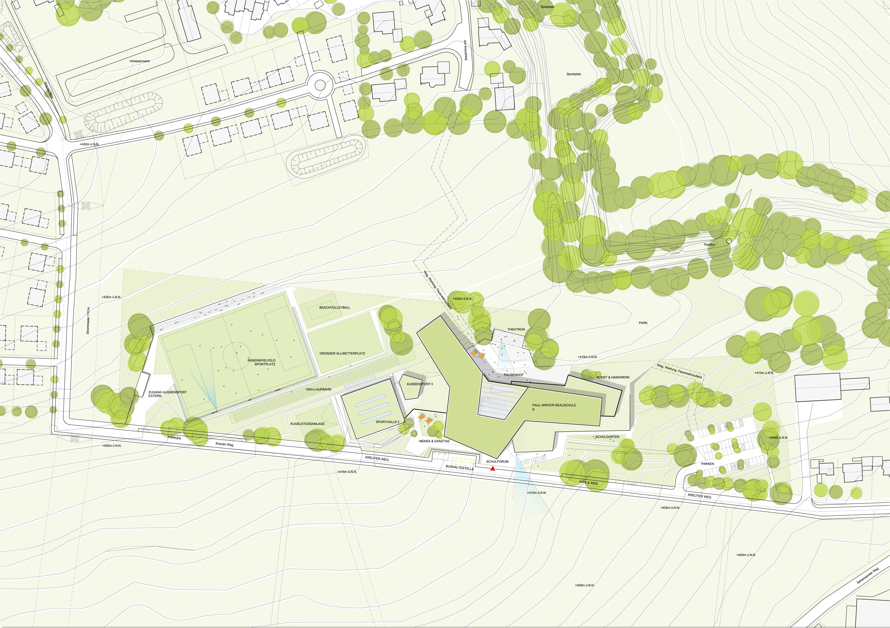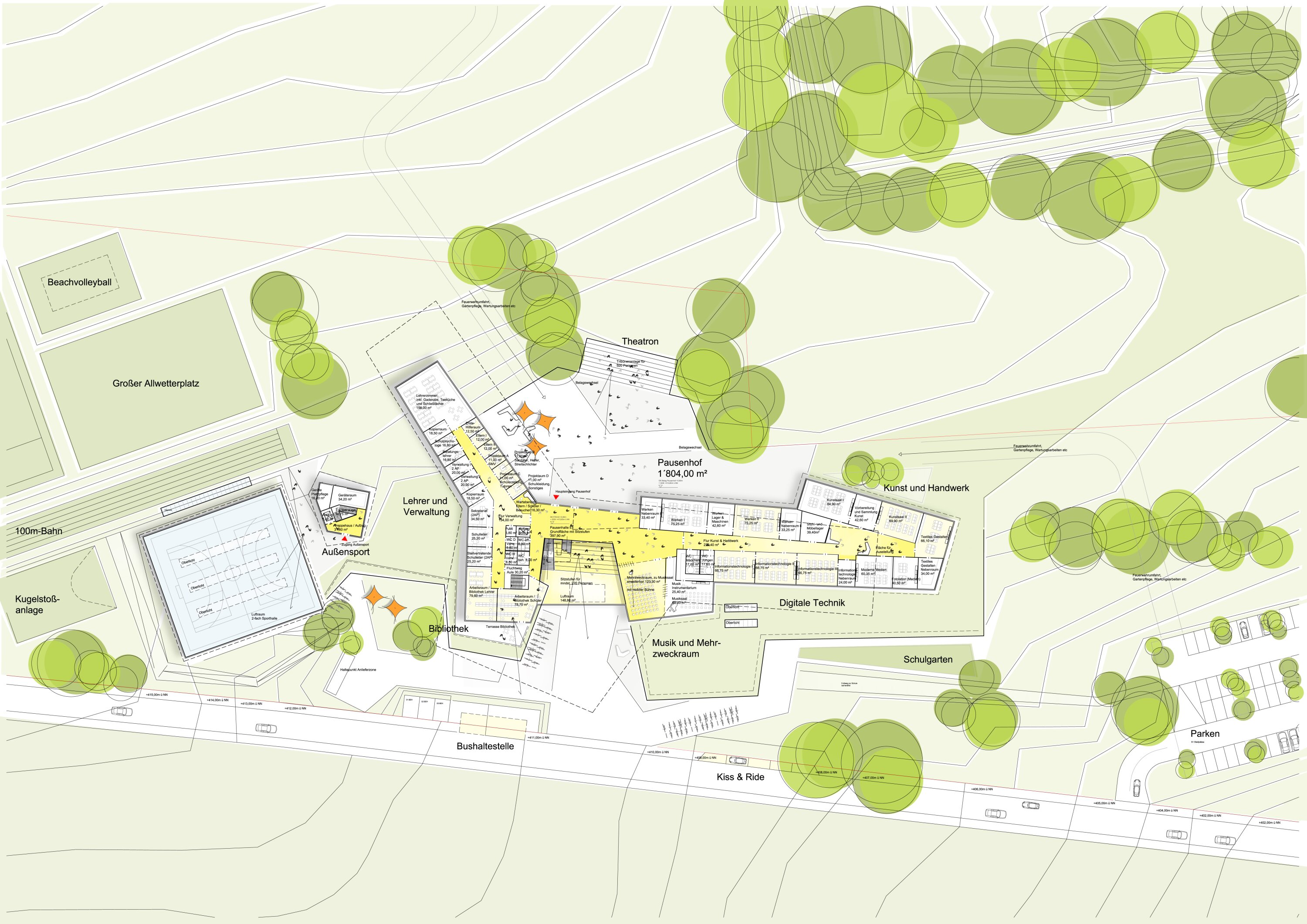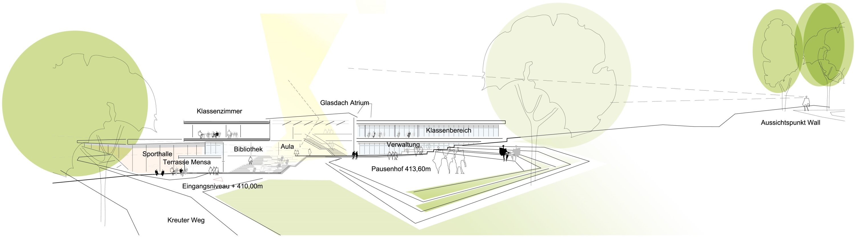 A central campus core, formed by entrance, auditorium, and schoolyard across two levels, acts as the social heart. Key functions such as cafeteria, library, multipurpose areas, and all-day facilities are arranged around this center, enabling flexible use and interaction. Teaching spaces are distributed in distinct wings that extend into the landscape as “green classrooms,” offering daylight, views, and opportunities for outdoor learning. Above, a compact ring of classrooms defines the overall structure and strengthens the sense of community. Circulation areas are designed as open, communicative spaces with high spatial quality, avoiding traditional corridors. Roof terraces and direct outdoor connections further enhance usability and orientation.