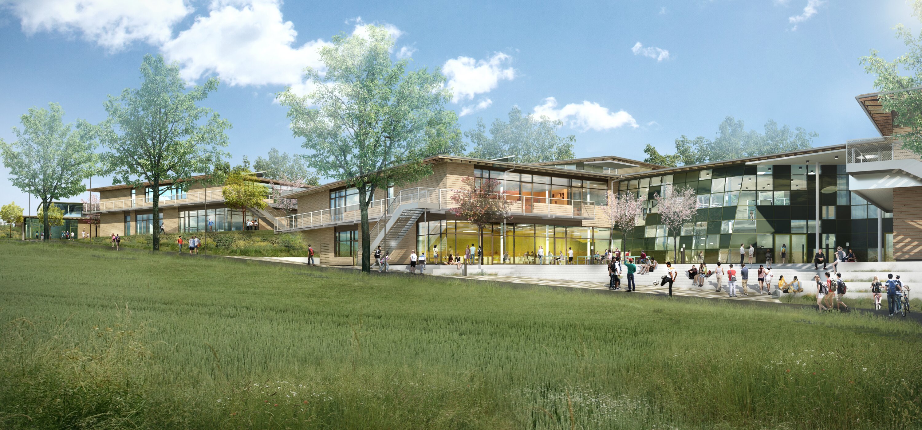 The sports hall is embedded into the terrain and combined with outdoor sports facilities, concentrating athletic functions in one area. The entire campus merges architecture and landscape into a continuous environment for learning, movement, and social exchange.