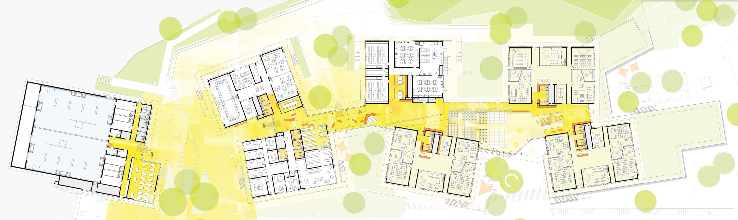 Subject-specific classrooms and labs are located in dedicated wings at entrance level, extending into the landscape. The gymnasium, partially embedded into the terrain, lies on the site’s western edge, with outdoor sports areas above.