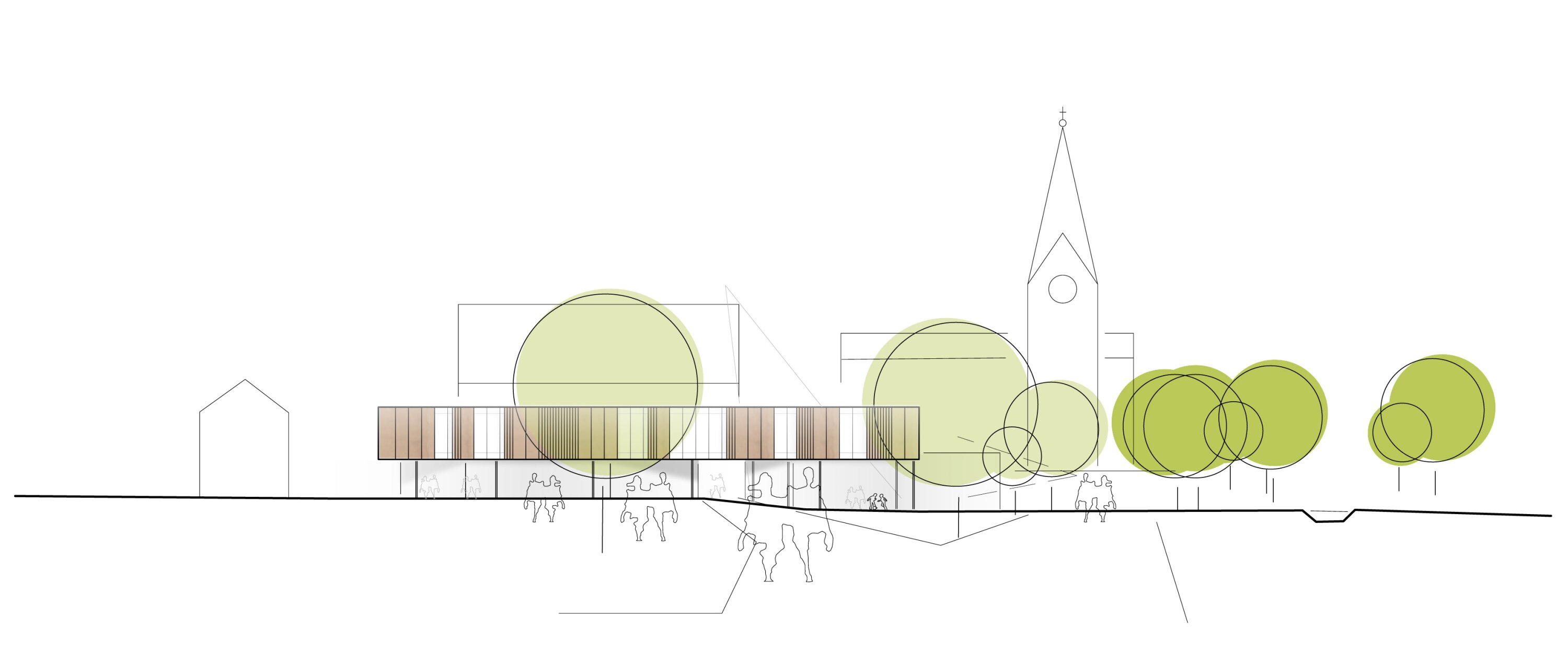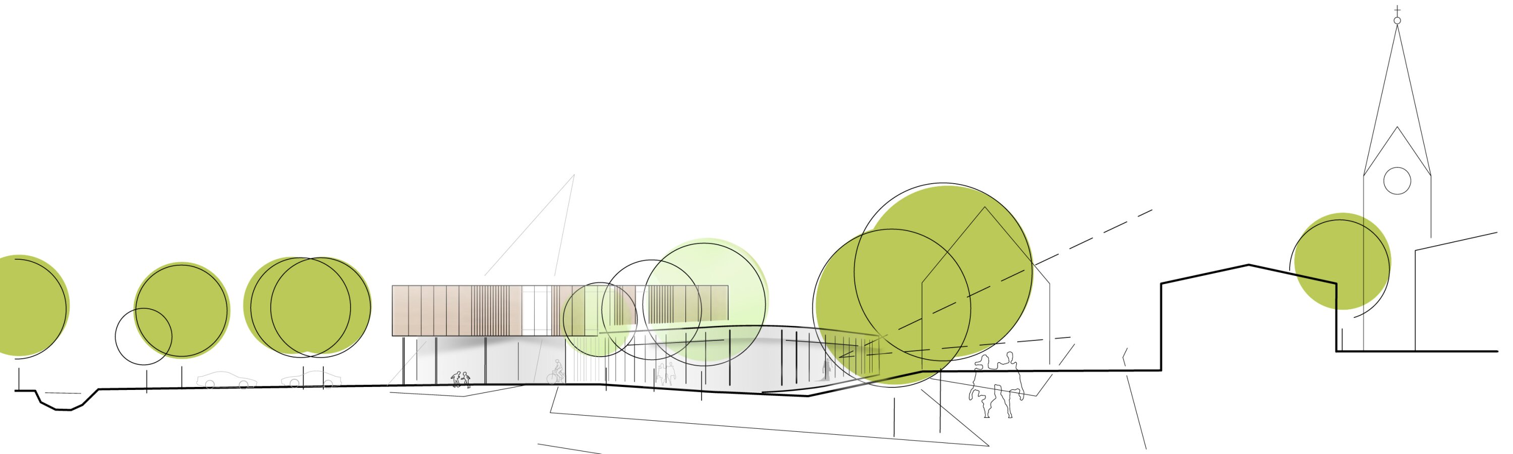 The facade reflects this organization, with open, glazed public areas below and a more structured timber-clad upper level with adjustable shading elements. Natural ventilation and simple systems ensure a robust and low-tech building operation. Green spaces, new pathways, and landscaped areas connect the center with its surroundings, creating places for meeting and recreation. An energy-efficient concept using passive strategies and renewable systems completes the design.