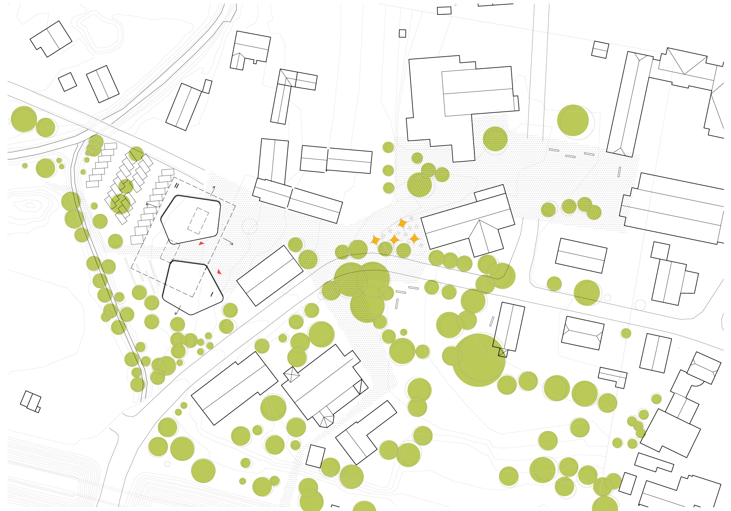 The urban concept transforms the fragmented town center into a network of public spaces, linking Kolbererplatz, the church forecourt, and a new Karolinenplatz. Traffic calming, continuous paving, and improved pedestrian connections enhance spatial cohesion while maintaining necessary circulation.