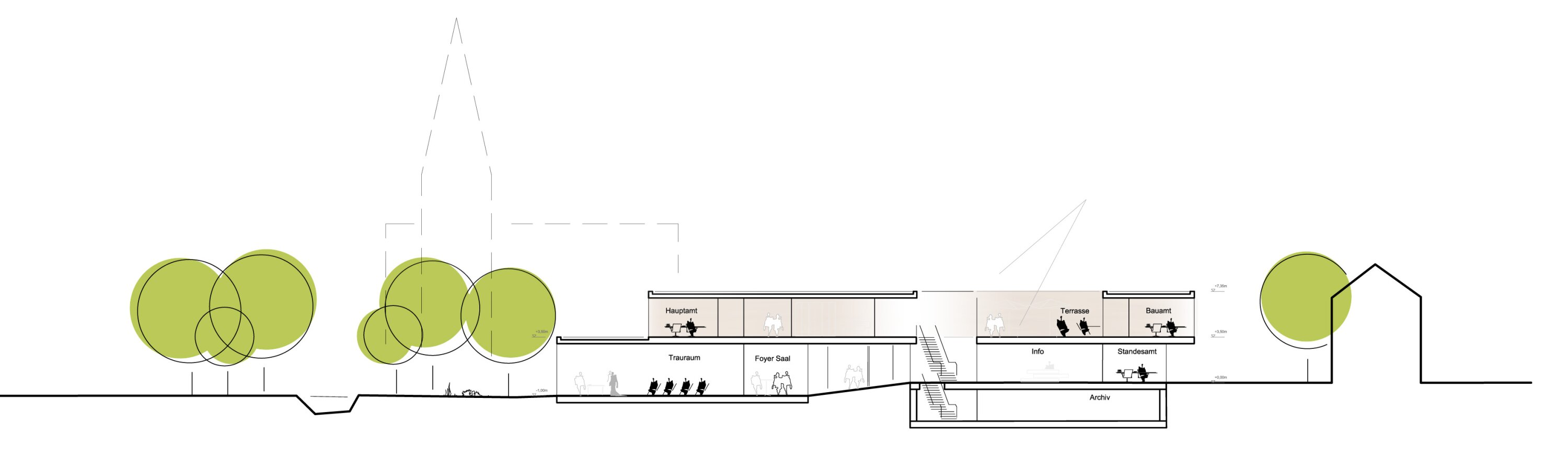 The new town hall, positioned prominently at the edge of the center, forms a civic landmark through its placement and interaction with surrounding buildings rather than height. Together with adjacent structures, it defines a new public square. Public functions such as the citizens’ office and assembly hall are located on the transparent ground floor, while administrative offices are organized above in a compact and efficient layout internal courtyards that provide daylight and orientation.
