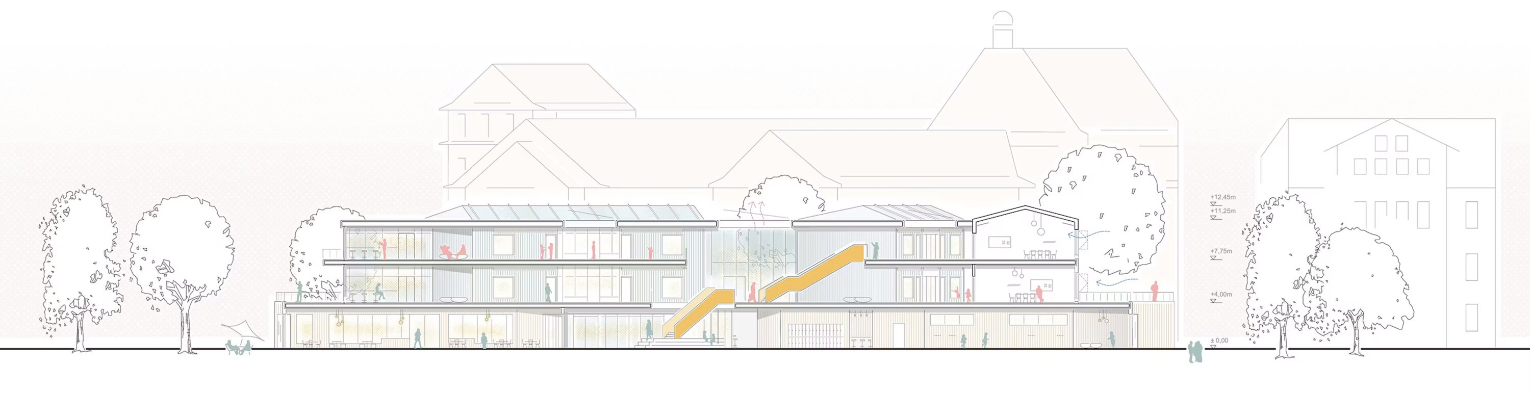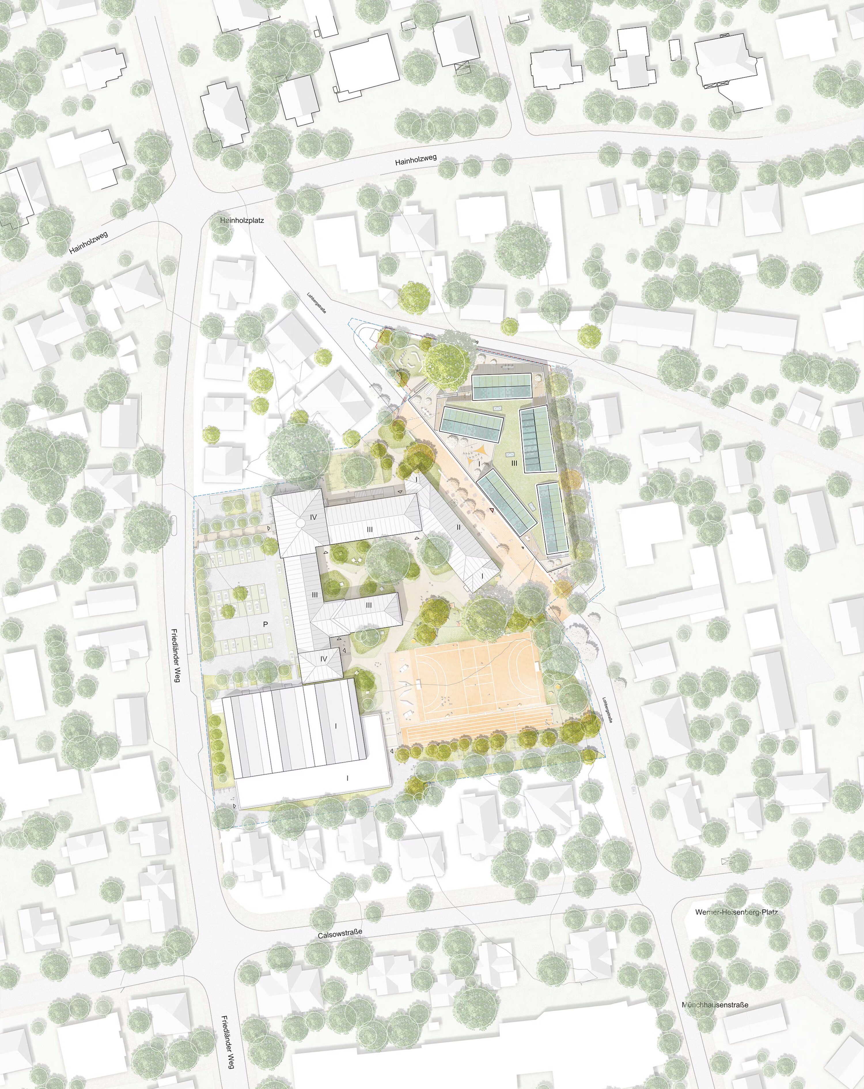 The design responds sensitively to the heterogeneous context between the historic school building and the surrounding residential fabric. Instead of a dominant volume, the new building is conceived as a series of small-scale, two-storey pavilion-like structures resting on a unifying plinth, referencing the former nursery use of the site. The plinth extends the outdoor space into the building and structures the schoolyard into a sequence of differentiated courtyards while preserving the majority of existing mature trees. A generous, covered incision marks the main entrance and establishes a new boulevard as the central connection between old and new buildings. Internally, the foyer functions as a central marketplace and orientation space with flexible multi-use potential. Shared functions such as the cafeteria and science departments are located on the ground floor for campus-wide accessibility. Learning is organized in clearly defined year-group clusters across two storeys, offering a variety of spatial situations for classroom teaching, collaborative learning, retreat, and outdoor education. The spatial concept supports flexibility, interaction, and the pedagogical profile of the school as a UNESCO Cultural School.