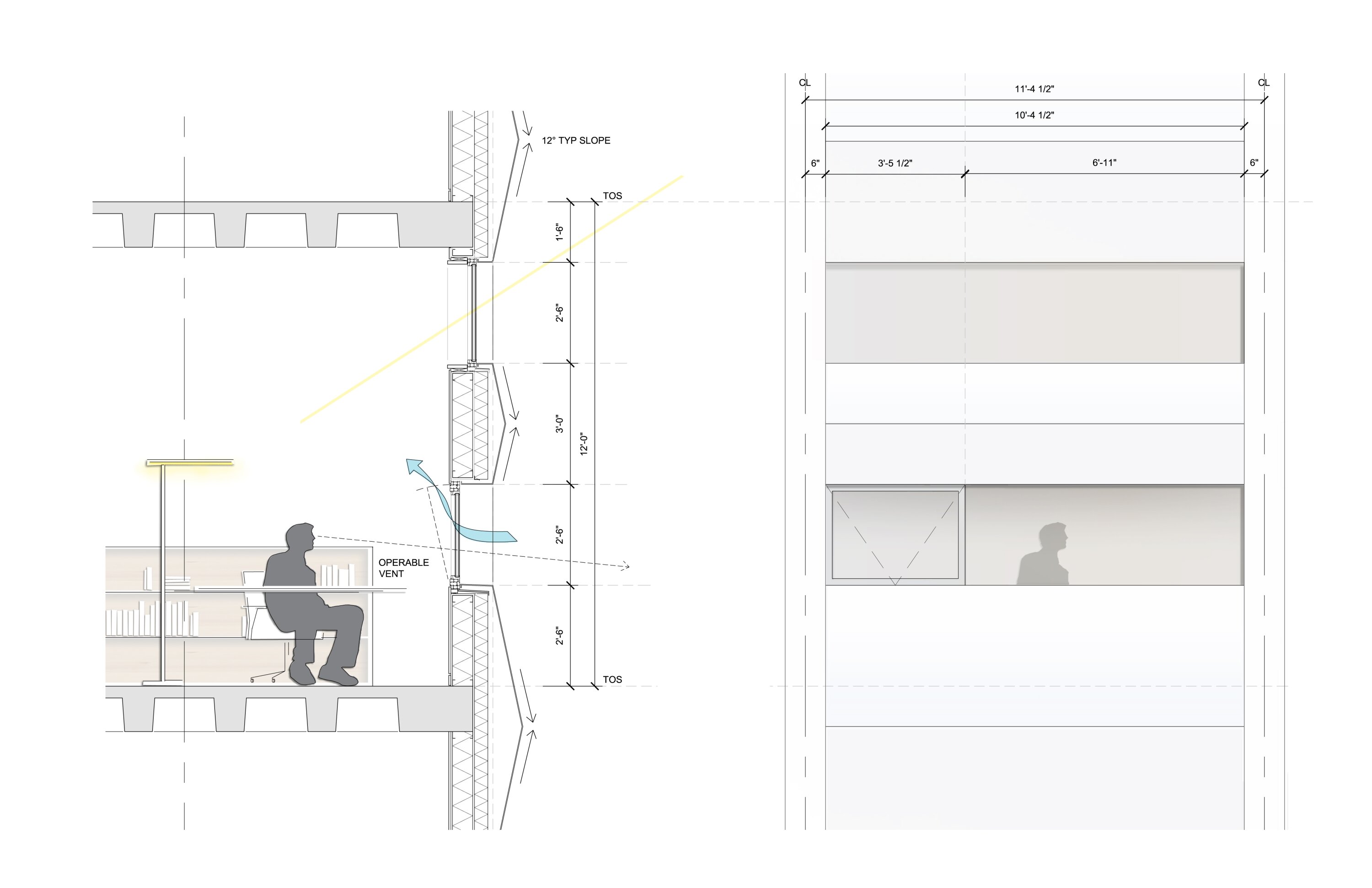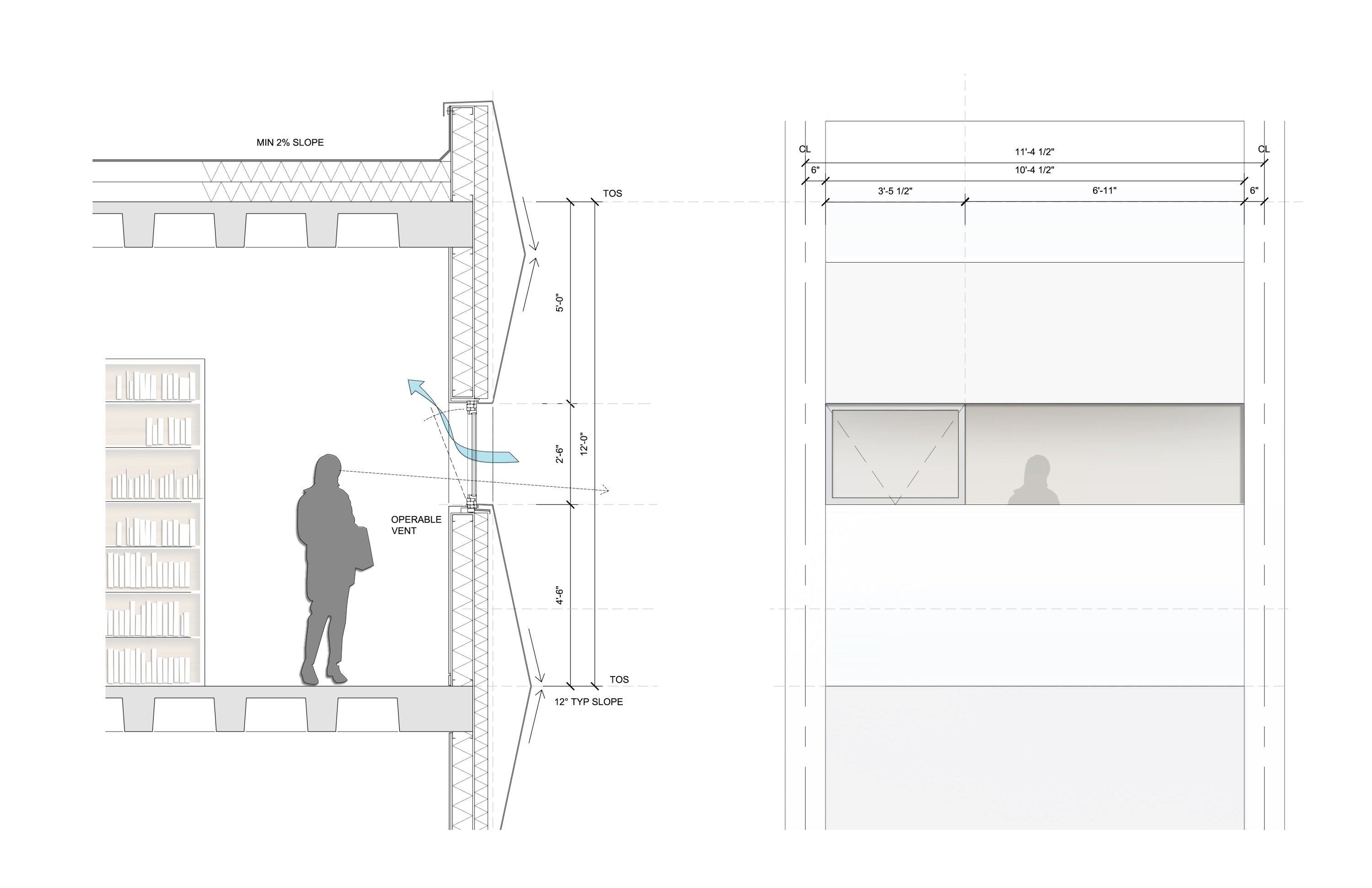 The stacks are located towards the interior zone of the floor, between the cores, to mitigate any impact of sunlight on the printed material. This also preserves perimeter floor space for more regularly occupied functions that are able to take advantage of the daylighting as well as the natural ventilation afforded by the new upgraded facade. Positioned deep within the plan, away from the facade, the glazed interior partitions maximize visual transparency and transmission of daylight. Within the waffle slabs, colored acoustic panels generate a gradient, pixelated composition that emerges from the cores, animating the ceiling as one walks across the space.