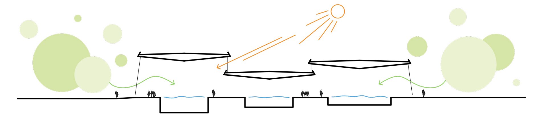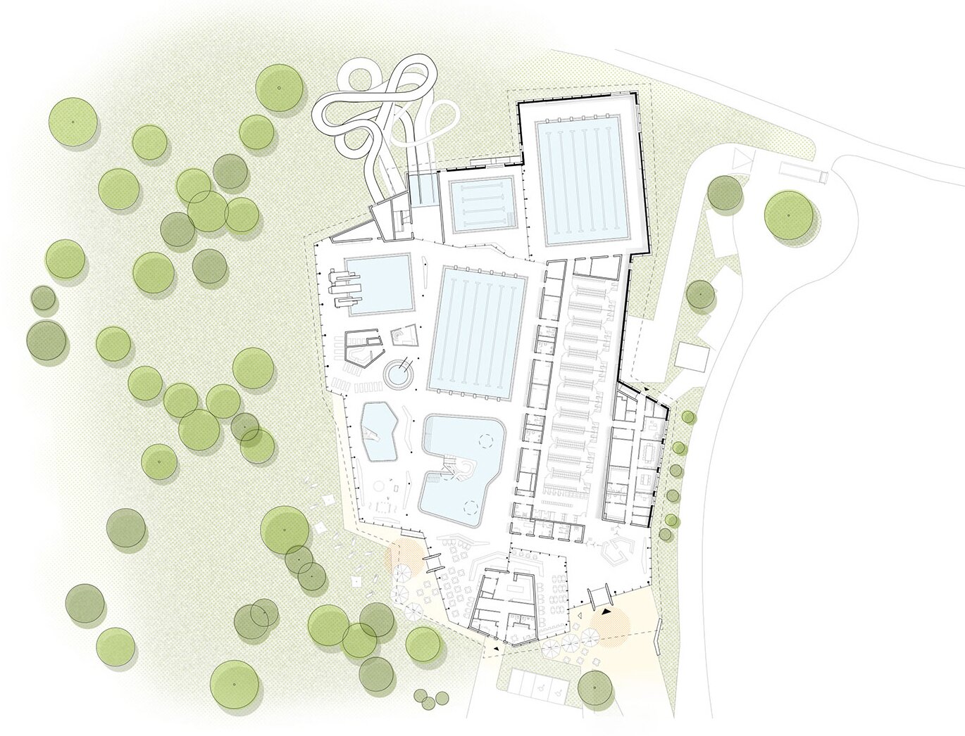 Inside, these roof surfaces delineate the various pool areas in a playful manner, while preserving the open character of the structure. The layout of the pools has been carefully arranged to chime with the site’s unique location and allows for easy orientation. In the center, swimmers can enjoy lap lanes. The adjacent non-swimmer and toddler pools, along with the water playground, face the southern facade. This area also features the food court with an adjoining terrace and a grassy space for sunbathing. Lightweight glass dividing walls define the quiet zone, screen the slides’ landing area, and offer a high level of privacy for the learning pool and the second 25-meter swimming pool.