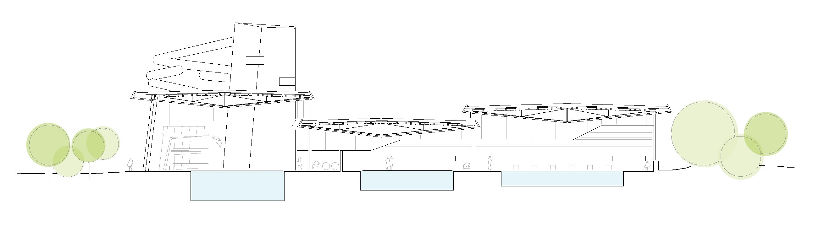 This vibrant aquatic landscape features two 25-meter swimming pools, a non-swimmer’s pool with a slide, a toddler pool, a warm-water pool, a learning pool with a movable floor, diving facilities, two giant slides, and a water playground. Varying ceiling heights accommodate the specific needs of each area while creating a dynamic spatial composition that balances a sense of security with expansive open spaces encouraging visitor interaction. The harmonious arrangement of three distinct roofs gives the building an inviting, sculptural character.