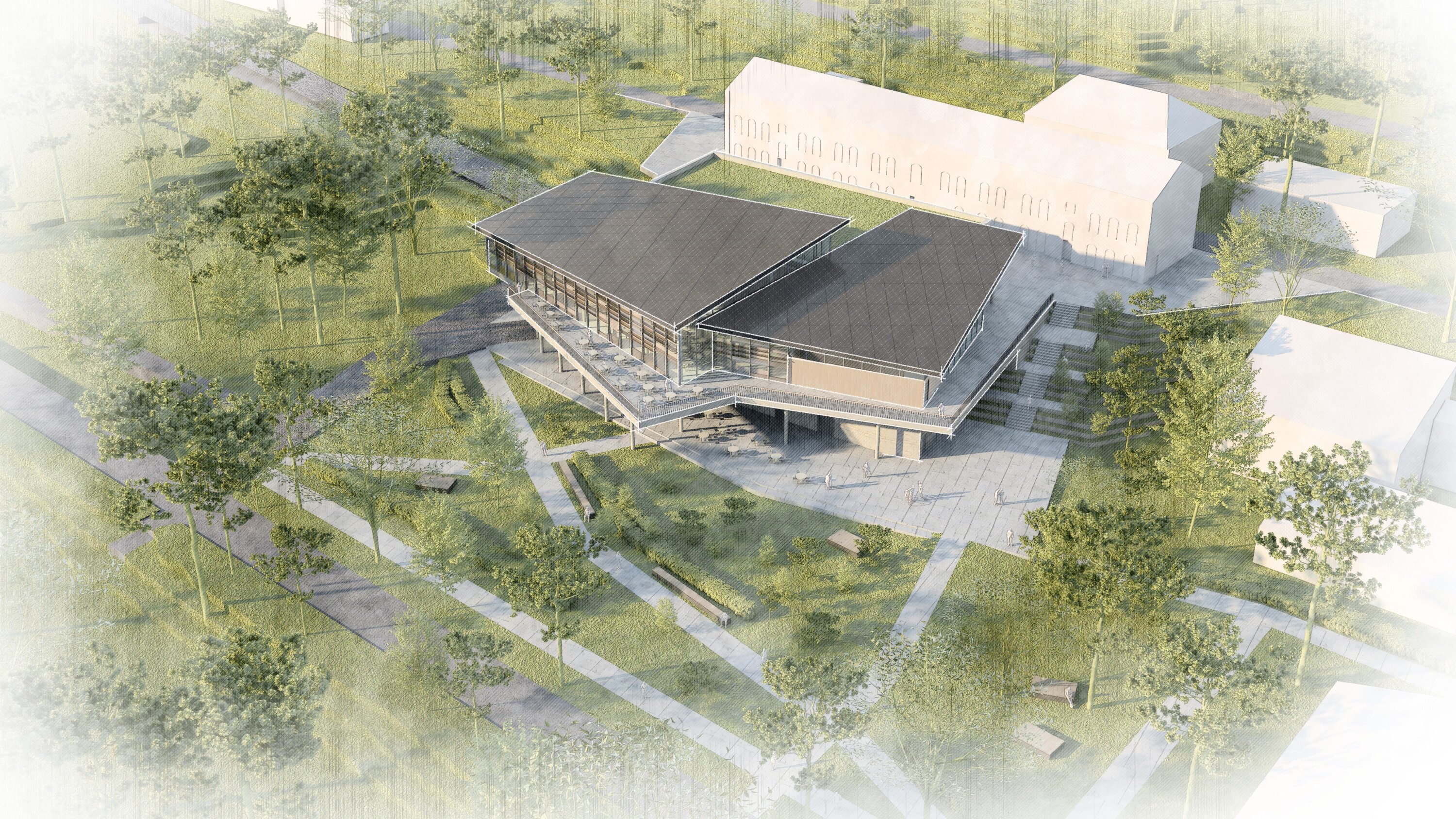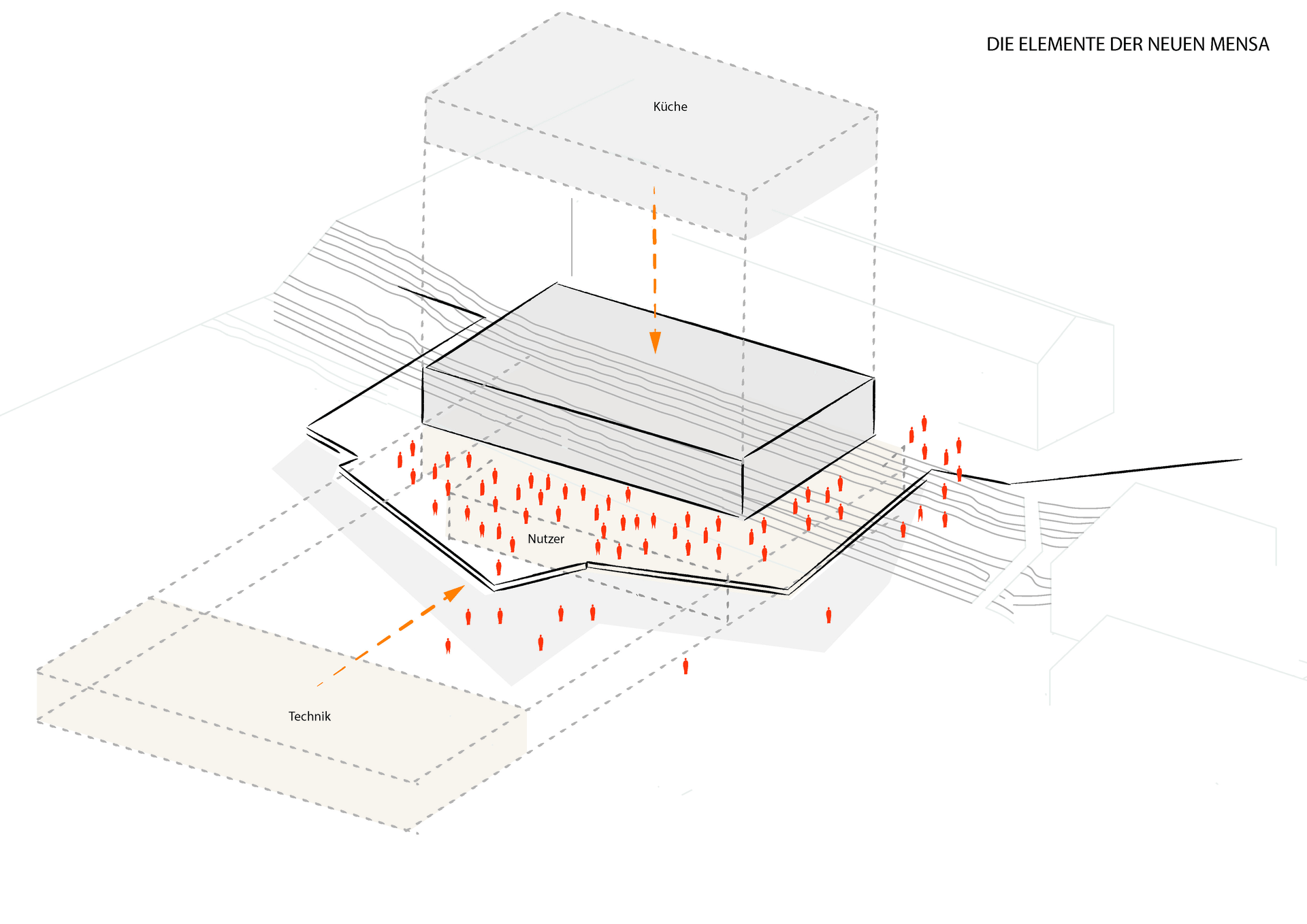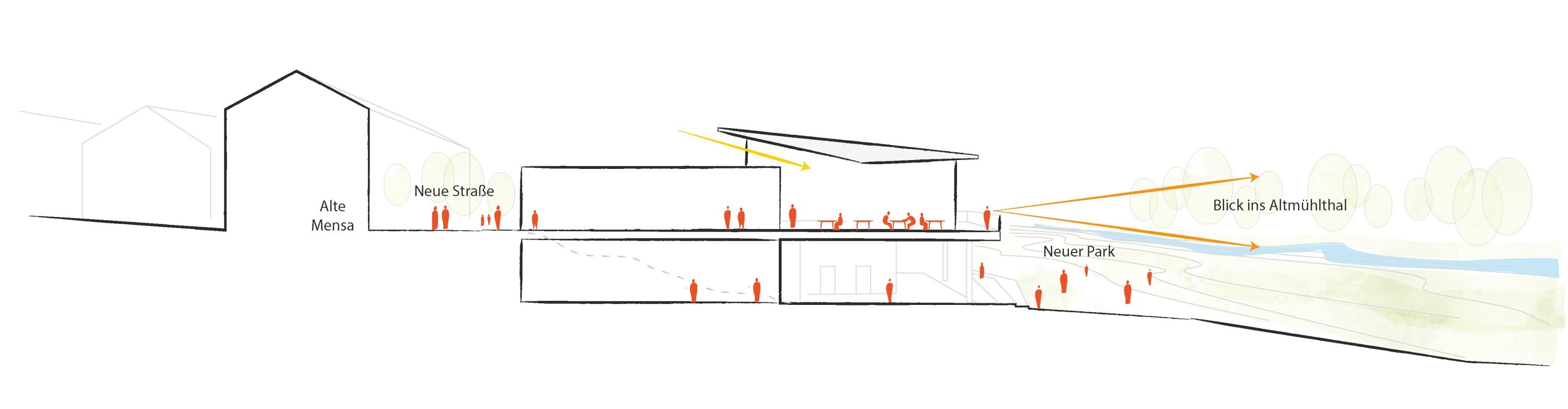 The three-part building, with each section rising to a different height, makes skillful use of the sloping site to create two levels, each of which can be accessed from ground level. The free forms of the foyer and canteen on the upper level are arranged around the kitchen facilities located further up the slope, while the service areas on the lower level are embedded within the topography. The building’s edges guide visitors toward the entrances and give rise to new outdoor areas.