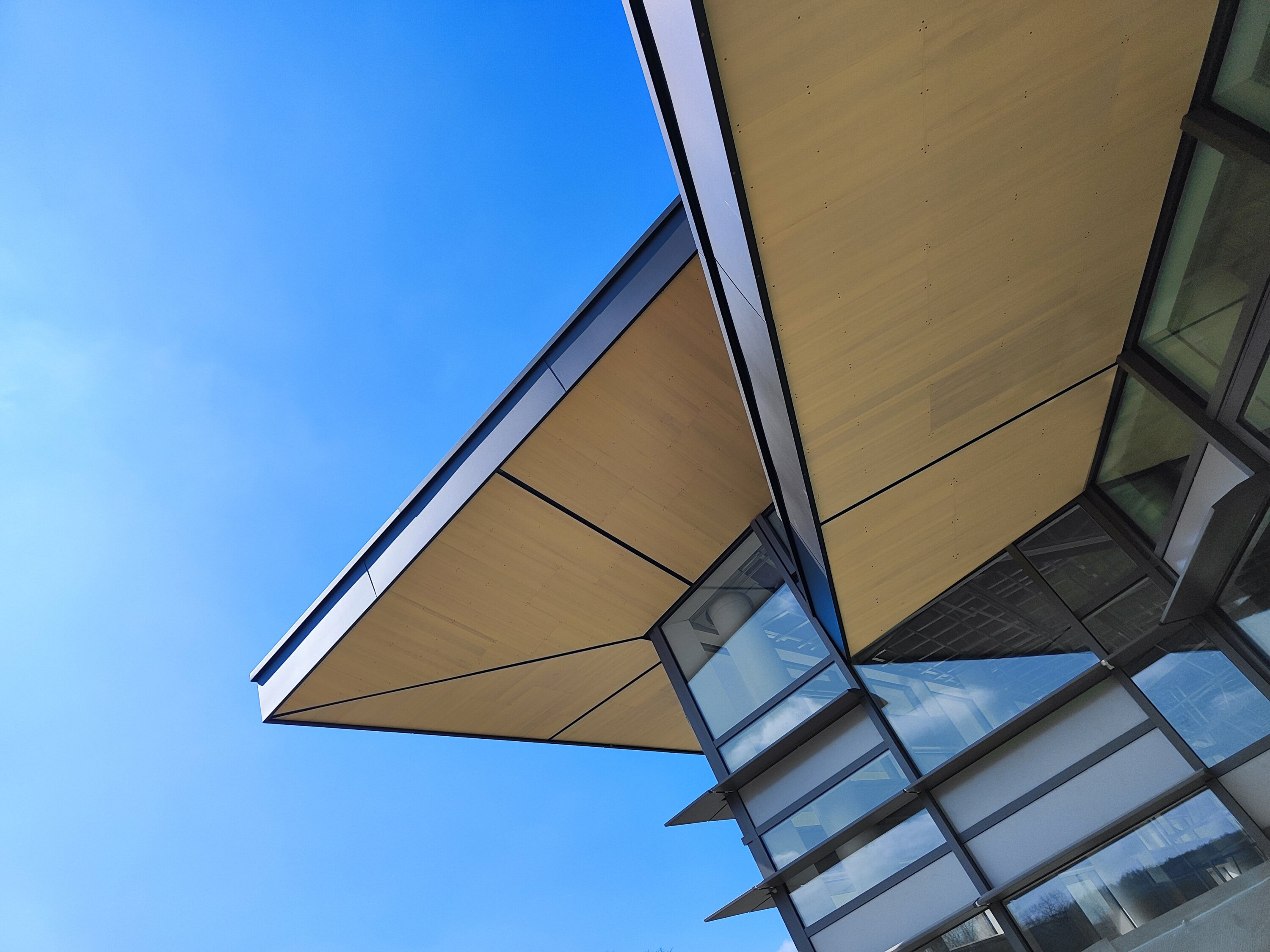 The foyer and canteen feature photovoltaic roofs. Seeding herbs and other plants on the kitchen’s biodiverse roof provides both habitat and a food source for bees and insects. A greened clinker facade complements the kitchen wing to blend with its strict geometry. The construction follows a resource-efficient, purpose-driven approach: a hybrid steel-and-timber structure spans the wide canteen.