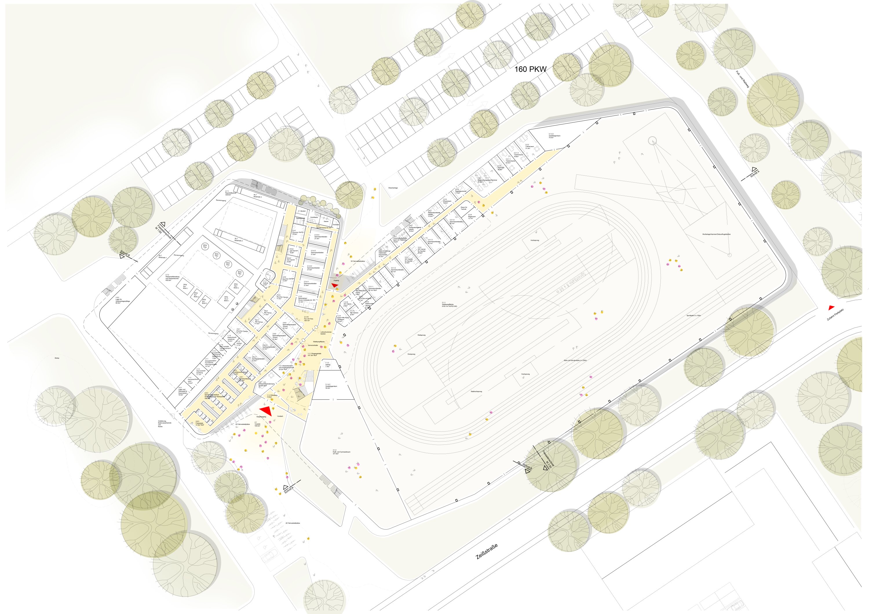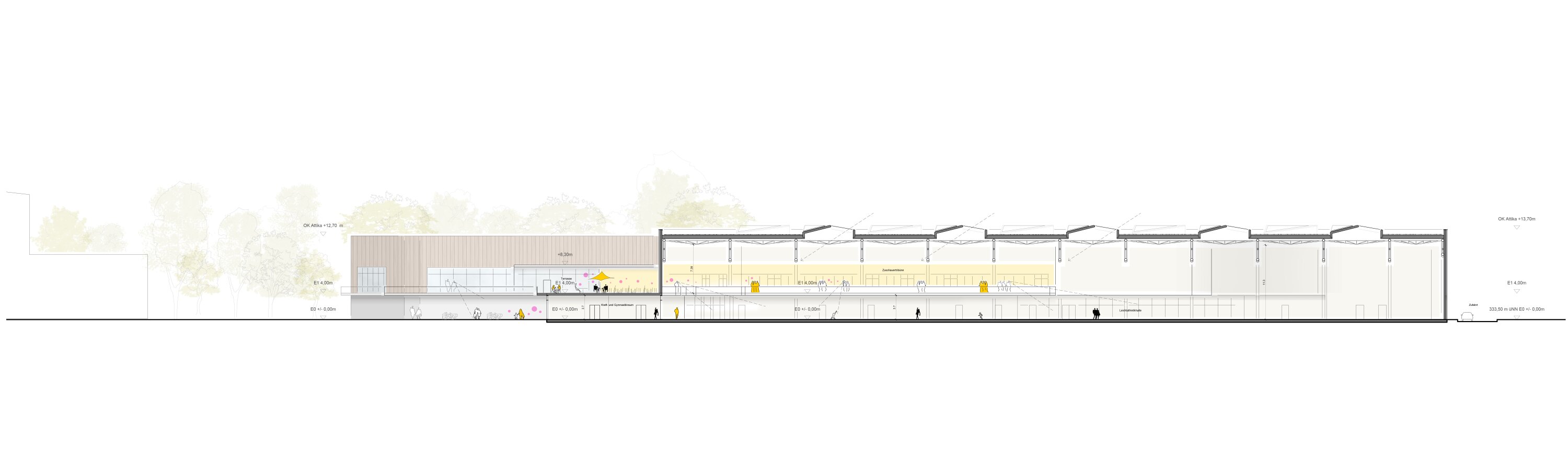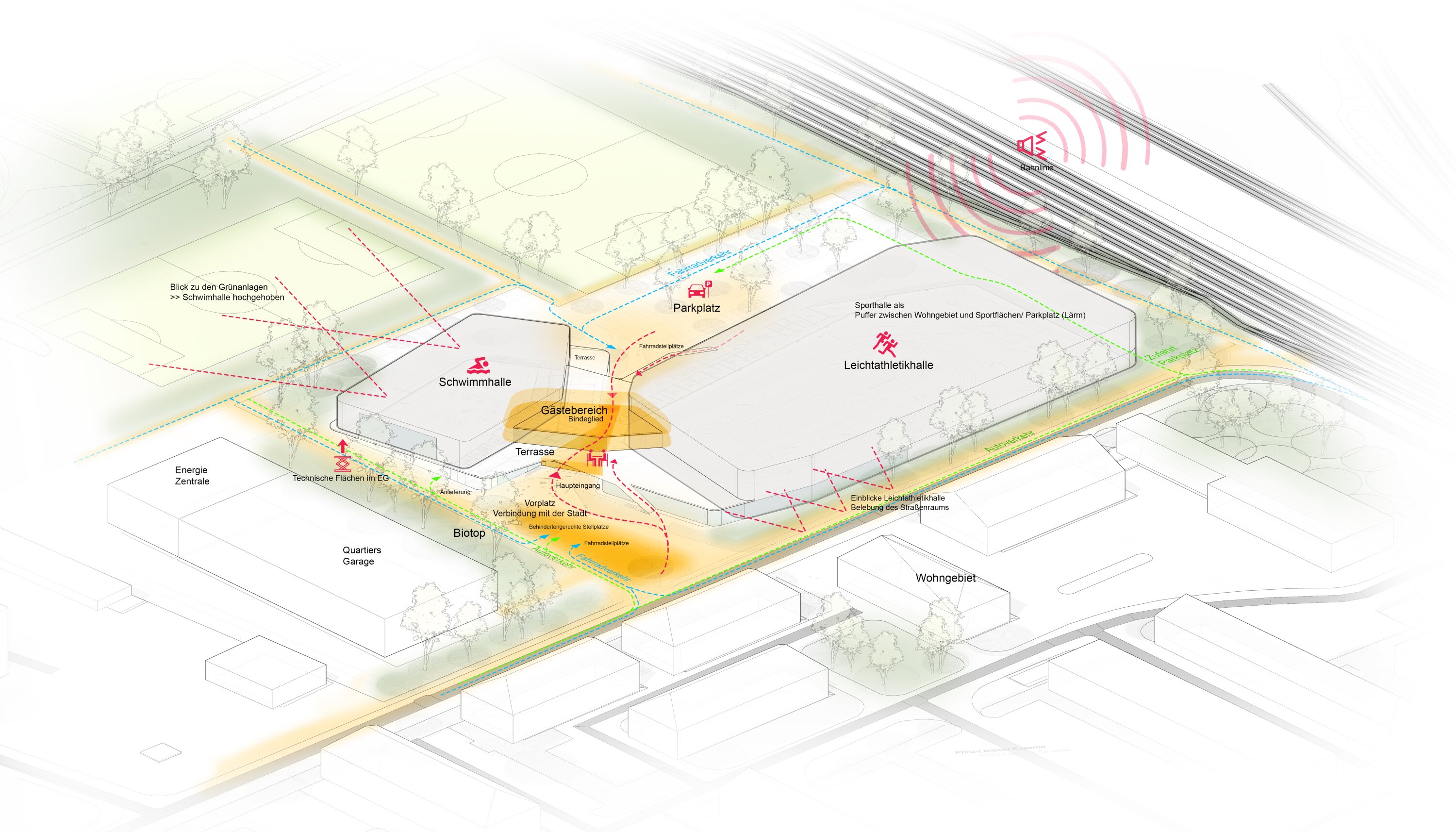 A transparent central foyer links both buildings, creating an inviting entrance and a clear orientation point. Generous glazing and a landscaped forecourt establish a strong connection between interior and exterior while enhancing accessibility. Functions are clearly organized, with direct access to changing areas and sports facilities. Upper levels accommodate visitor areas and gastronomy, offering visual connections across the complex and towards outdoor spaces.