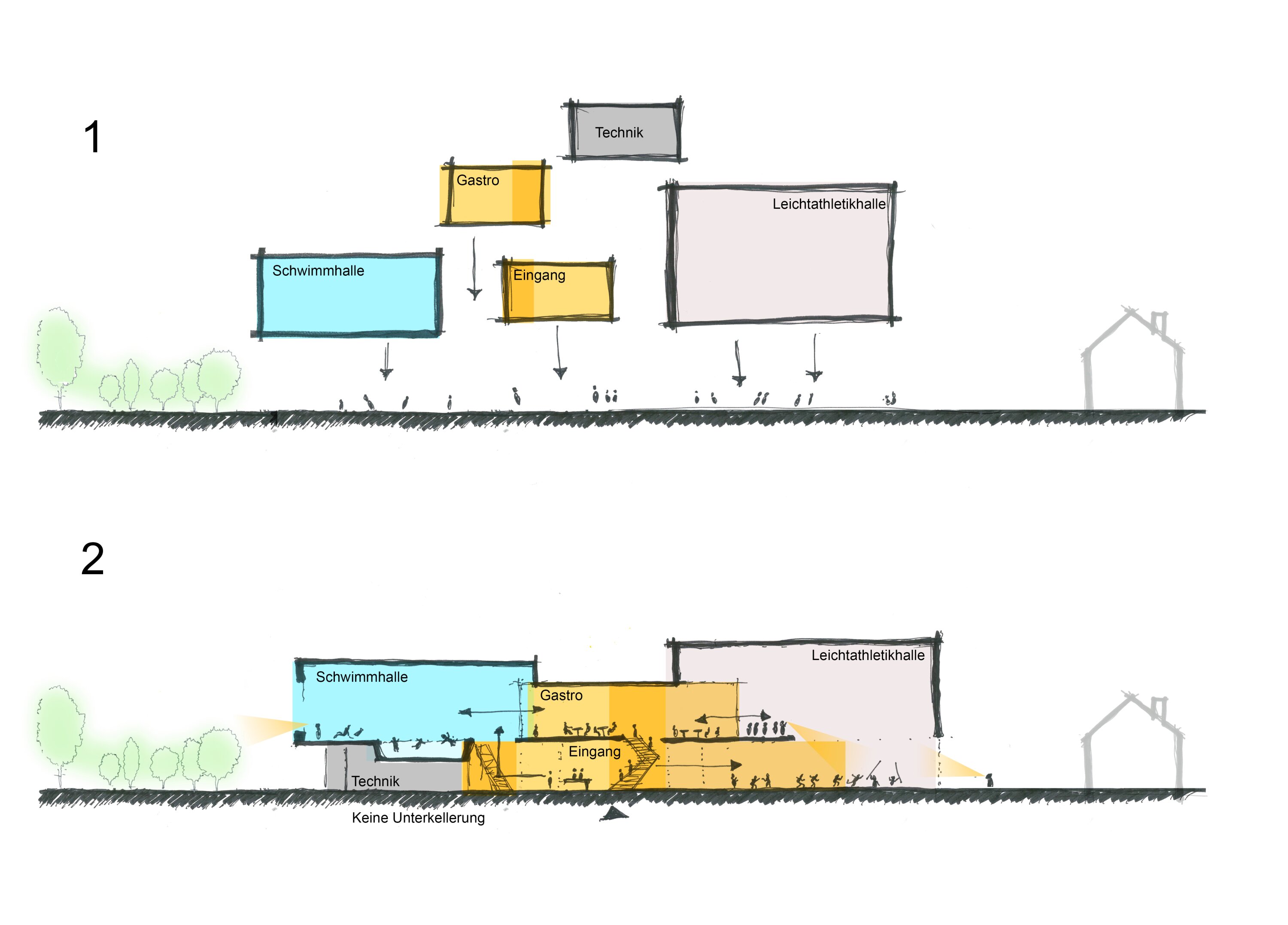 Materiality reflects the construction systems: a steel structure for the athletics hall and timber construction for the swimming facility. The result is a well-integrated, functional, and identity-forming sports complex.