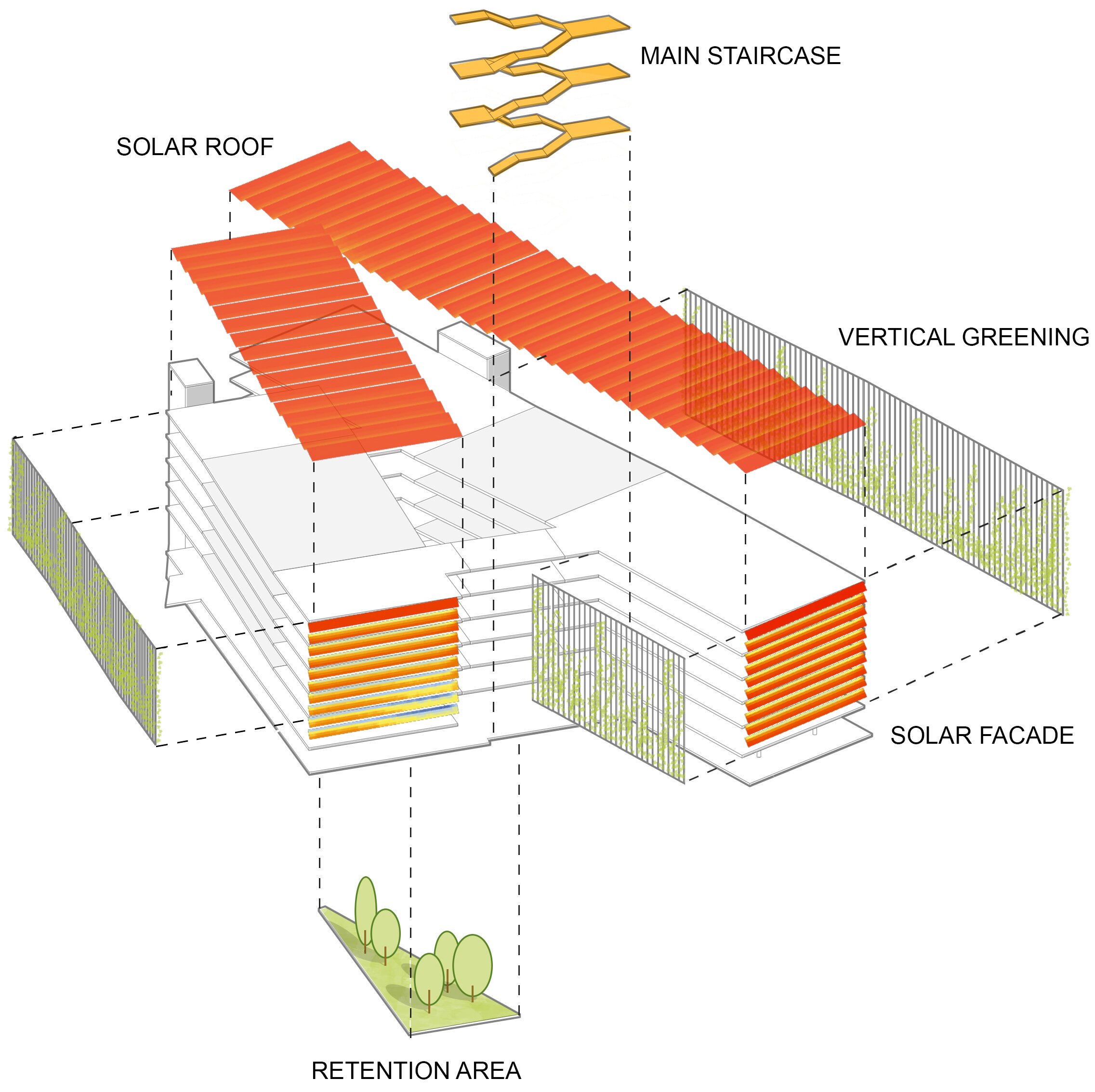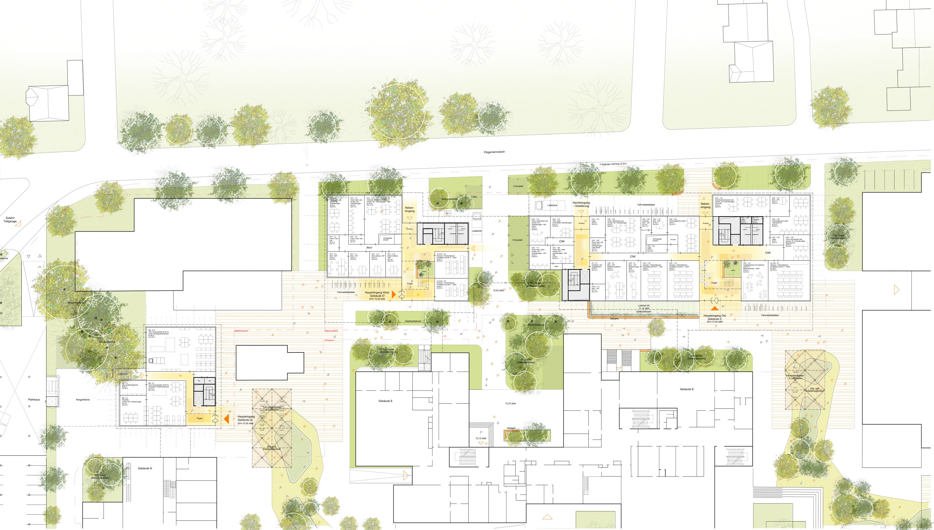 A new connecting path provides the main access to the buildings and structures the entire campus. Its key nodes are marked by sheltered communal zones, outdoor teaching spaces, seating areas, and bicycle facilities. Second-story bridges link the new buildings C and Q to the adjacent existing structures, ensuring direct, efficient movement for students and staff while horizontally integrating the various building clusters into a unified whole.